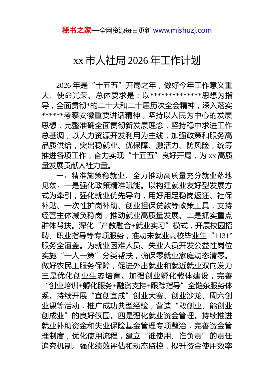 秘书之家—全网资源每日更新 www.mishuzj.comxx 市人社局 2026 年工作计划2026 年是“十五五”开局之年,做好今年工作意义重大、使命光荣。总体要求是:以**************思想为指导,全面贯彻*的二十大和二十届历次全会精神,深入落实******考察安徽重要讲话精神,坚持以人民为中心的发展思想,完整准确全面贯彻新发展理念,坚持稳中求进工作总基调,以人力资源开发利用为主线,加强政策和服务高品质供给,突出稳就业、优保障、激活力、防风险,统筹推进各项工作,奋力实现“十五五”良好开局,为 xx 高质量发展贡献人社力量。一、精准施策稳就业,全力推动高质量充分就业落地见效。一是强化政策精准赋能。以构建就业友好型发展方式为牵引,强化就业优先导向,用好用足稳岗返还、社保补贴、一次性扩岗补助、创业担保贷款等政策工具,支持经营主体减负稳岗,推动就业高质量发展。二是抓实重点群体帮扶。深化“产教融合+就业实习”模式,开展校园招聘、职业指导等专项服务,推动未就业高校毕业生“1131”服务全覆盖。为就业困难人员、失业人员开发公益性岗位实施“一人一策”分类帮扶,确保零就业家庭动态清零。做好农民工服务保障,促进外出就业和就近就业双向发力三是优化创业生态培育。加强创业孵化载体建设,完善“创业培训+孵化服务+融资支持+跟踪指导”全链条服务体系。持续开展“宜创宜成”创业大赛、创业沙龙、周六创业课等活动,推广成功典型经验,营造“敢创业、能创业创成业”的良好氛围。四是强化就业资金管理。持续推进就业补助资金和失业保险基金管理专项整治,完善资金管理制度,优化使用流程,建立“谁使用、谁负责”的责任追究机制。强化绩效评估和动态监控,提升资金使用效率秘书之家—全网资源每日更新 www.mishuzj.com充分发挥资金在促进就业创业中的支撑作用。二、深化改革强保障,持续推动社保事业高质量可持续发展。一是完善社保体系建设。稳妥实施渐进式延迟法定退休年龄改革,落实病残津贴复查鉴定、特殊工种提前退休等配套政策。按照企业职工养老保险全国统筹要求,稳步提高“综合两率”。推广集体补助模式,鼓励村集体公益慈善组织为参保群众提供补助。落实工伤保险省级统筹,强化协议机构监管,推进跨省就医联网结算。引导更多企业、新业态人员纳入补充工伤保险。优化新就业形态人员职业伤害保障试点流程。二是持续抓好参保扩面。健全“数据找人”精准扩面机制,推动参保结构调整,引导新业态从业人员、农民工参加职工养老保险,新开工工程建设项目工伤保险参保率力争达 90%以上。重点抓好被征地农民缴费补贴政策落实。三是切实保障待遇发放。加强养老金发放数据比对,压实代发银行责任,确保待遇发放“不漏一人、不少一分、不拖一天”。健全待遇确定和调整机制,继续提高城乡居民基础养老金水平。加强工伤保险待遇审核,严格待遇支出管理,保障参保人员合法权益四是加大基金监管力度。持续开展社保基金管理巩固提升行动,严格岗位管理、系统操作、待遇发放和基金财务管理,提升监管能力。加强社保基金监管系统应用,适时开展飞行检查,严厉打击欺诈骗保、套保、挪用贪占社保基金等行为。持续推进审计发现问题台账管理和挂账销号。五是提升经办服务能力。打造“城区步行 15 分钟、乡村辐射 5 公里”社保服务圈,完善社保关系转移接续制度,压缩办理时限。推动“社会保险参保一件事”“社会保险查询一件事”等高效办成“一件事”落地,分批分类推广居民服务“一卡通”应用,提升群众办事便捷度。三、精准服务聚英才,加快打造高素质技术技能人才队伍。一是推进专技人才建设。加强博士后科研工作站管理,拓宽博士后招引渠道,加大科研投入,发挥站点对企秘书之家—全网资源每日更新 www.mishuzj.com业创新、产业升级的助推作用。加大重点产业、重点行业专技人才引育力度,向基层一线、非公企业、乡村振兴领域倾斜。深化职称制度改革,畅通高层次人才、急需紧缺人才职称评审绿色通道。聚焦重点领域举办高级研修班,提升专技人才综合素质。二是加强技能人才培养。深入实施“技能照亮前程”培训行动,大规模开展职业技能培训推行“岗位需求+技...