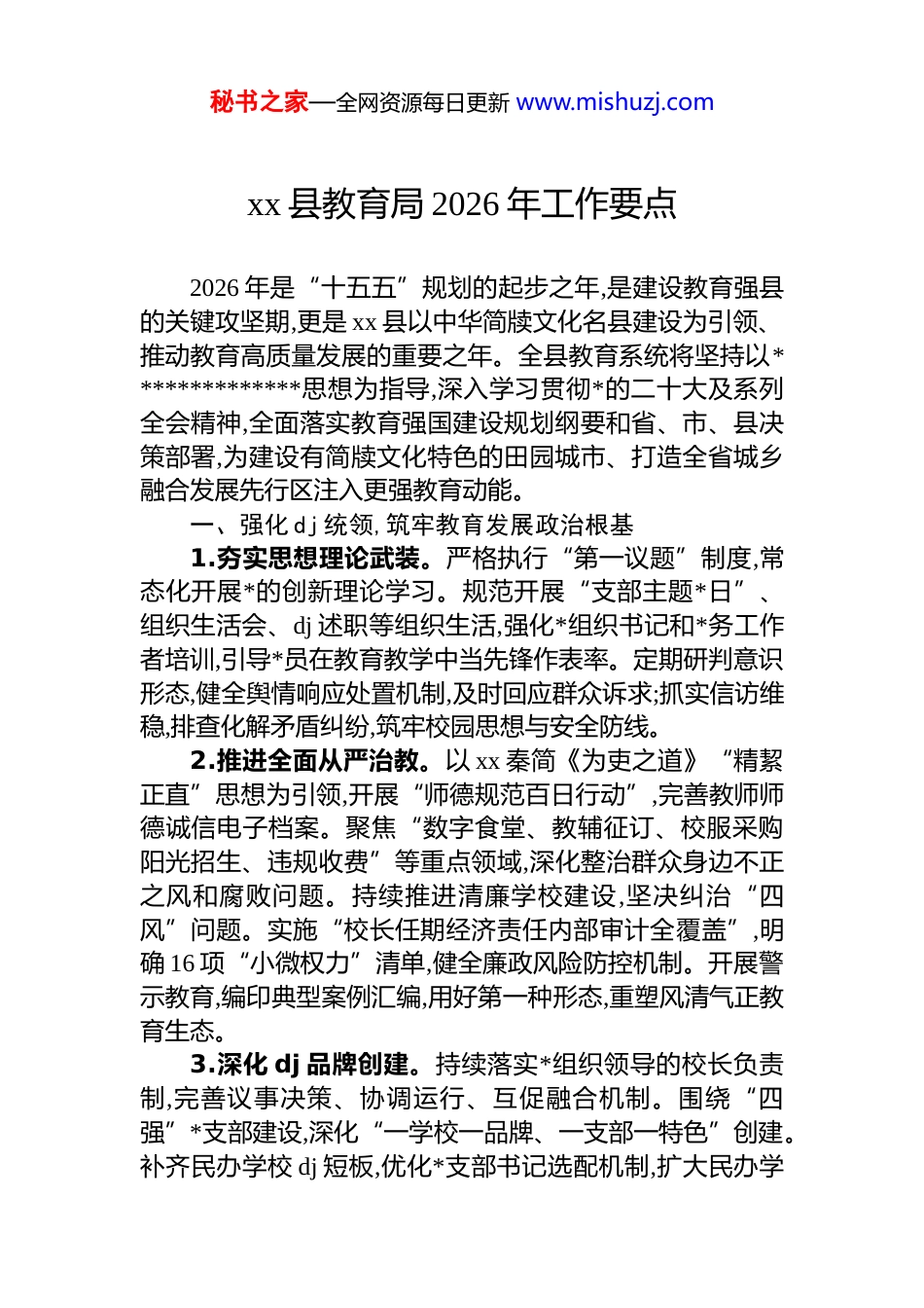 秘书之家—全网资源每日更新 www.mishuzj.comxx 县教育局 2026 年工作要点2026 年是“十五五”规划的起步之年,是建设教育强县的关键攻坚期,更是 xx 县以中华简牍文化名县建设为引领、推动教育高质量发展的重要之年。全县教育系统将坚持以**************思想为指导,深入学习贯彻*的二十大及系列全会精神,全面落实教育强国建设规划纲要和省、市、县决策部署,为建设有简牍文化特色的田园城市、打造全省城乡融合发展先行区注入更强教育动能。一、强化 dj 统领,筑牢教育发展政治根基1.夯实思想理论武装。严格执行“第一议题”制度,常态化开展*的创新理论学习。规范开展“支部主题*日”、组织生活会、dj 述职等组织生活,强化*组织书记和*务工作者培训,引导*员在教育教学中当先锋作表率。定期研判意识形态,健全舆情响应处置机制,及时回应群众诉求;抓实信访维稳,排查化解矛盾纠纷,筑牢校园思想与安全防线。2.推进全面从严治教。以 xx 秦简《为吏之道》“精絜正直”思想为引领,开展“师德规范百日行动”,完善教师师德诚信电子档案。聚焦“数字食堂、教辅征订、校服采购阳光招生、违规收费”等重点领域,深化整治群众身边不正之风和腐败问题。持续推进清廉学校建设,坚决纠治“四风”问题。实施“校长任期经济责任内部审计全覆盖”,明确 16 项“小微权力”清单,健全廉政风险防控机制。开展警示教育,编印典型案例汇编,用好第一种形态,重塑风清气正教育生态。3.深化 dj 品牌创建。持续落实*组织领导的校长负责制,完善议事决策、协调运行、互促融合机制。围绕“四强”*支部建设,深化“一学校一品牌、一支部一特色”创建。补齐民办学校 dj 短板,优化*支部书记选配机制,扩大民办学秘书之家—全网资源每日更新 www.mishuzj.com校*员队伍规模。二、聚焦立德树人,构建五育并举育人体系4.深化思政教育一体化建设。统筹中小学思政课一体化设计,配齐建强思政课和心理健康教育教师队伍,建设一批思政教学名师工作室。持续开展“开学第一课”“学习新思想 做好接班人”等活动,遴选推出一批思政“金课”。讲好英雄模范故事,开展“新时代好少年”“新三好”评选,引导青少年赓续红色基因、扣好人生第一粒扣子。5.打造简牍文化育人品牌。举办“简牍故事演讲赛”“红领巾讲解员”选拔等活动,摄制“新时代好少年”微纪录片。利用课后服务开设简牍文化兴趣班,打造特色鲜明的简牍文化校园。拓展“博物馆+”系列活动,新增非遗体验项目,年参与学生突破 5 万人次,争创省级思政研学示范基地。6.促进体卫艺劳全面发展。巩固“每天综合体育活动 2小时”成果,全力实现“校园游泳”小学阶段全覆盖。开齐开足体美劳课程,常态化开展体育竞赛、艺术展演和劳动教育周活动,建设一批青少年法治教育实践基地和劳动教育实践基地。7.完善家校社协同育人机制。用好家校社育人平台,优化“1+3+n”工作模式,强化教育、公安、民政等部门协同配合,完善“五项建设”和“六个机制”,打造全省协同育人样板。加强学生心理健康教育,落实“早排查、早发现、早干预”机制,推进学校—家庭—心理医疗机构多渠道联动。完善中小学家访制度,办好家长学校,协同加强学生作业、睡眠、手机、读物、体质等“五项管理”。三、统筹各类教育,推进优质均衡协调发展8.实现学前教育普及普惠达标。对照 xx 县学前教育普及普惠省级督导评估反馈意见,建立问题清单和整改台账,实行销号管理,全面补齐各项短板,确保通过国家评估认定。健全幼儿园保教质量评估体系,加强动态监测与分级分类指导,深化城乡幼儿园结对共建和“名园+”联合体建设,全面推进秘书之家—全网资源每日更新 www.mishuzj.com科学保教,加强幼小科学衔接,整体提升各类幼儿园办园水平和保教质量。落实学前教育大班免保教费政策。9.推进义务教育优质均衡创建。深化教联体改革,重点打造 6 个融合型教联体,完善“五统一”运行机制,教师交流比例提升至 15%以上。启动道桥、曾店、胡金店“九年一贯制”建设试点。严控大班额,推进控辍保学常态化动态清零,确保优质均衡示范县通过预验收。10.推动高中教育优质特色发展。统筹推进高中学校在科技、体艺、外语等领域特色发展,深化高考综合...