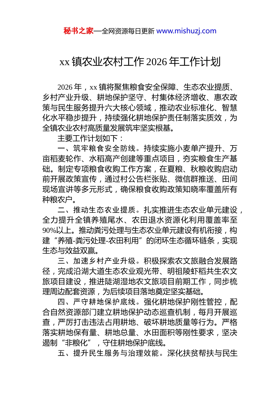 秘书之家—全网资源每日更新 www.mishuzj.comxx 镇农业农村工作 2026 年工作计划2026 年,xx 镇将聚焦粮食安全保障、生态农业提质、乡村产业升级、耕地保护坚守、村集体经济增收、惠农政策与民生服务提升六大核心领域,推动农业标准化、智慧化水平稳步提升,持续强化耕地保护责任制落实质效,为全镇农业农村高质量发展筑牢坚实根基。主要工作计划如下:一、筑牢粮食安全防线。持续实施小麦单产提升、万亩稻麦轮作、水稻高产创建等重点项目,夯实粮食生产基础。制定专项粮食收购工作方案,在夏粮、秋粮收购启动前开展政策宣传,通过村公告栏张贴、微信群推送、田间现场宣讲等多元形式,确保粮食收购政策知晓率覆盖所有种粮农户。二、推动生态农业提质。扎实推进生态农业单元建设,全力提升全镇养殖尾水、农田退水资源化利用覆盖率至90%以上。推动粪污处理与生态农业单元建设有机衔接,构建“养殖-粪污处理-农田利用”的闭环生态循环链条,实现生态与效益双赢。三、加速乡村产业升级。积极探索农文旅融合发展路径,完成沿湖大道生态农业观光带、明祖陵虾稻共生农文旅项目建设,推进陡湖湿地农文旅项目前期工作,同步梳理周边配套资源,为后续项目落地奠定坚实基础。四、严守耕地保护底线。强化耕地保护刚性管控,配合自然资源部门建立耕地保护动态巡查机制,每月开展巡查,严厉打击违法占用耕地、破坏耕地质量等行为。严格落实耕地保有量、耕地总量、水田面积等刚性要求,坚决遏制“非粮化”,守住耕地保护底线。五、提升民生服务与治理效能。深化扶贫帮扶与民生秘书之家—全网资源每日更新 www.mishuzj.com项目建设,开展建档立卡户动态监测排查,建立“一户一策”精准帮扶台账;科学制定 2026 年扶贫项目收益分配方案,确保收益精准惠及每一位帮扶对象。扎实推进 2026 年村级“一事一议”项目,切实解决群众急难愁盼问题。六、强化 dj 引领保障。深化“dj+产业”融合发展模式,实施“*员联户兴农”工程,推广“*支部+合作社+农户”发展模式,将*组织建设深度嵌入粮食生产、龙虾养殖等重点产业链条。严格落实“三会一课”制度,组织*员农技骨干深入田间地头开展技术指导,充分发挥*员先锋模范作用,为农业农村发展提供坚强保障。