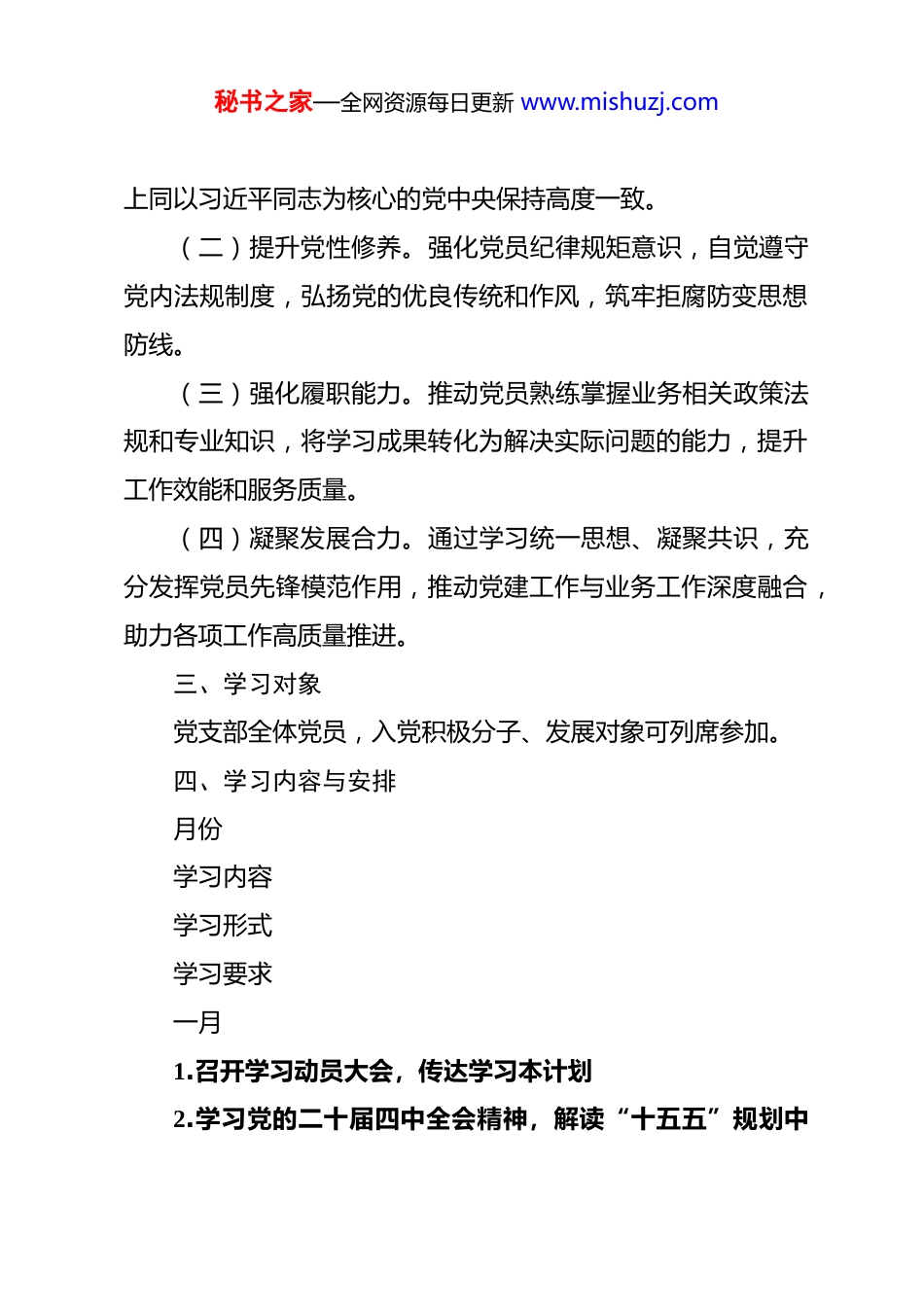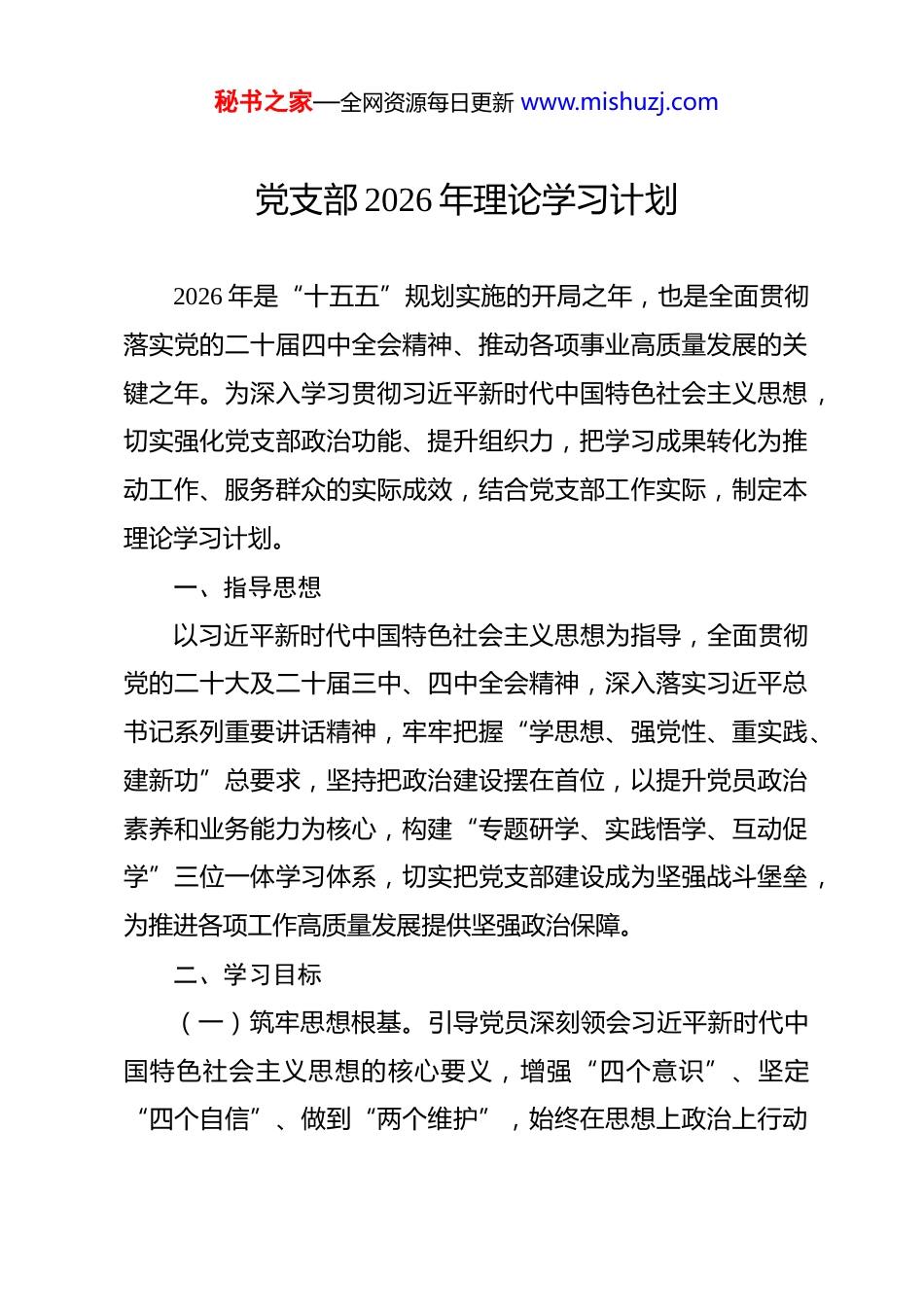 秘书之家—全网资源每日更新 www.mishuzj.com党支部 2026 年理论学习计划 2026 年是“十五五”规划实施的开局之年,也是全面贯彻落实党的二十届四中全会精神、推动各项事业高质量发展的关键之年。为深入学习贯彻习近平新时代中国特色社会主义思想,切实强化党支部政治功能、提升组织力,把学习成果转化为推动工作、服务群众的实际成效,结合党支部工作实际,制定本理论学习计划。一、指导思想以习近平新时代中国特色社会主义思想为指导,全面贯彻党的二十大及二十届三中、四中全会精神,深入落实习近平总书记系列重要讲话精神,牢牢把握“学思想、强党性、重实践、建新功”总要求,坚持把政治建设摆在首位,以提升党员政治素养和业务能力为核心,构建“专题研学、实践悟学、互动促学”三位一体学习体系,切实把党支部建设成为坚强战斗堡垒,为推进各项工作高质量发展提供坚强政治保障。二、学习目标(一)筑牢思想根基。引导党员深刻领会习近平新时代中国特色社会主义思想的核心要义,增强“四个意识”、坚定“四个自信”、做到“两个维护”,始终在思想上政治上行动秘书之家—全网资源每日更新 www.mishuzj.com上同以习近平同志为核心的党中央保持高度一致。(二)提升党性修养。强化党员纪律规矩意识,自觉遵守党内法规制度,弘扬党的优良传统和作风,筑牢拒腐防变思想防线。(三)强化履职能力。推动党员熟练掌握业务相关政策法规和专业知识,将学习成果转化为解决实际问题的能力,提升工作效能和服务质量。(四)凝聚发展合力。通过学习统一思想、凝聚共识,充分发挥党员先锋模范作用,推动党建工作与业务工作深度融合,助力各项工作高质量推进。三、学习对象党支部全体党员,入党积极分子、发展对象可列席参加。四、学习内容与安排月份学习内容学习形式学习要求一月1.召开学习动员大会,传达学习本计划2.学习党的二十届四中全会精神,解读“十五五”规划中秘书之家—全网资源每日更新 www.mishuzj.com相关部署3.学习《习近平谈治国理政》(第五卷)开篇章节,聚焦新发展理念相关论述4.跟进学习最新习近平总书记重要讲话和重要指示精神5.学习上级部门关于新年工作的决策部署和工作安排集中学习、个人自学深刻领会会议和文件精神,结合实际思考如何在新一年开展工作,撰写学习心得二月1.继续深入学习《习近平谈治国理政》(第五卷),重点学习关于民生保障和改善的内容2.开展春节前廉政警示教育,观看廉政警示教育片《正风反腐就在身边》3.开展学习心得分享会,交流学习《习近平谈治国理政》(第五卷)的体会4.跟进学习最新习近平总书记重要讲话和重要指示精神5.学习上级部门关于节日期间工作的要求和安排集中学习、线上交流强化廉洁自律意识,确保节日期间风清气正,分享学习心得时要结合实际工作谈感悟秘书之家—全网资源每日更新 www.mishuzj.com三月1.学习《习近平谈治国理政》(第五卷)中关于科技创新的论述2.学习全国“两会”精神,重点关注与本行业相关的政策举措3.专题研讨“如何立足岗位贯彻落实两会精神”4.邀请专家解读行业最新政策法规集中学习、专家讲座、专题研讨准确把握两会精神和行业政策,明确工作方向,研讨时要提出具体的工作举措四月1.开展党史学习教育,学习新民主主义革命时期的历史,重温党的光辉历程2.学习《关于新形势下党内政治生活的若干准则》,强化党内政治生活的政治性、时代性、原则性、战斗性3.学习《习近平谈治国理政》(第五卷)中关于文化自信的内容4.跟进学习最新习近平总书记重要讲话和重要指示精神5.组织党员参观本地党史纪念馆集中学习、实地参观秘书之家—全网资源每日更新 www.mishuzj.com通过学习党史和准则,增强党性修养,参观后撰写参观感悟五月1.学习《习近平谈治国理政》(第五卷)中关于生态文明建设的论述2.学习《中国共产党廉洁自律准则》全文及解读,强化廉洁自律意识3.跟进学习最新习近平总书记重要讲话和重要指示精神4.结合五一劳动节,开展“劳动最光荣”主题实践活动,组织党员参与志愿服务集中学习、实践活动深刻理解生态文明建设的重要性,在实践活动中弘扬劳动精神,增强服务意识六月1.学习《习近平谈治...