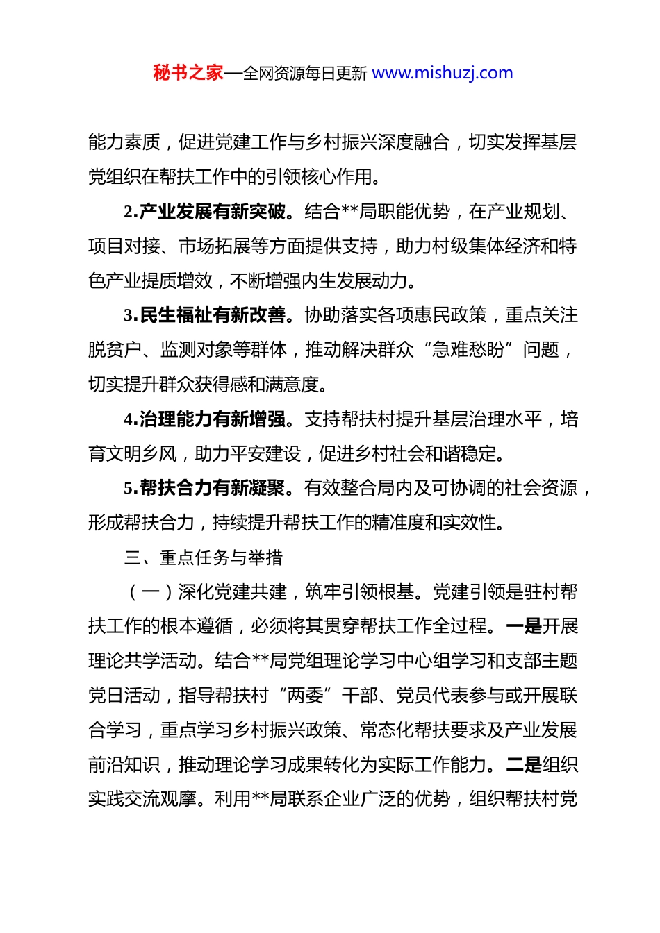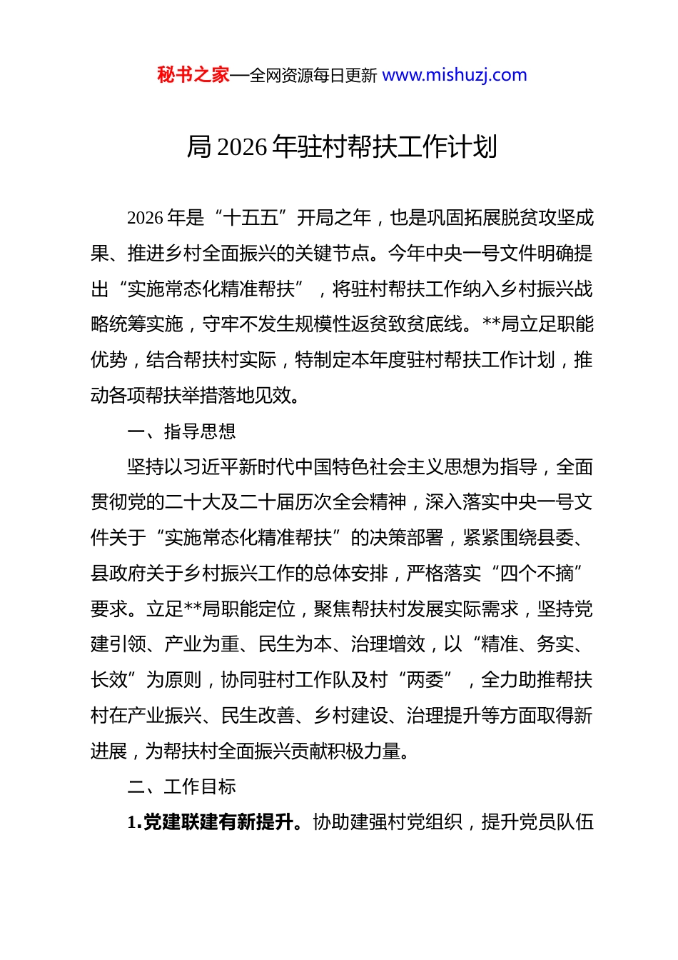 秘书之家—全网资源每日更新 www.mishuzj.com局 2026 年驻村帮扶工作计划 2026 年是“十五五”开局之年,也是巩固拓展脱贫攻坚成果、推进乡村全面振兴的关键节点。今年中央一号文件明确提出“实施常态化精准帮扶”,将驻村帮扶工作纳入乡村振兴战略统筹实施,守牢不发生规模性返贫致贫底线。**局立足职能优势,结合帮扶村实际,特制定本年度驻村帮扶工作计划,推动各项帮扶举措落地见效。一、指导思想坚持以习近平新时代中国特色社会主义思想为指导,全面贯彻党的二十大及二十届历次全会精神,深入落实中央一号文件关于“实施常态化精准帮扶”的决策部署,紧紧围绕县委、县政府关于乡村振兴工作的总体安排,严格落实“四个不摘”要求。立足**局职能定位,聚焦帮扶村发展实际需求,坚持党建引领、产业为重、民生为本、治理增效,以“精准、务实、长效”为原则,协同驻村工作队及村“两委”,全力助推帮扶村在产业振兴、民生改善、乡村建设、治理提升等方面取得新进展,为帮扶村全面振兴贡献积极力量。二、工作目标1.党建联建有新提升。协助建强村党组织,提升党员队伍秘书之家—全网资源每日更新 www.mishuzj.com能力素质,促进党建工作与乡村振兴深度融合,切实发挥基层党组织在帮扶工作中的引领核心作用。2.产业发展有新突破。结合**局职能优势,在产业规划、项目对接、市场拓展等方面提供支持,助力村级集体经济和特色产业提质增效,不断增强内生发展动力。3.民生福祉有新改善。协助落实各项惠民政策,重点关注脱贫户、监测对象等群体,推动解决群众“急难愁盼”问题,切实提升群众获得感和满意度。4.治理能力有新增强。支持帮扶村提升基层治理水平,培育文明乡风,助力平安建设,促进乡村社会和谐稳定。5.帮扶合力有新凝聚。有效整合局内及可协调的社会资源,形成帮扶合力,持续提升帮扶工作的精准度和实效性。三、重点任务与举措(一)深化党建共建,筑牢引领根基。党建引领是驻村帮扶工作的根本遵循,必须将其贯穿帮扶工作全过程。一是开展理论共学活动。结合**局党组理论学习中心组学习和支部主题党日活动,指导帮扶村“两委”干部、党员代表参与或开展联合学习,重点学习乡村振兴政策、常态化帮扶要求及产业发展前沿知识,推动理论学习成果转化为实际工作能力。二是组织实践交流观摩。利用**局联系企业广泛的优势,组织帮扶村党秘书之家—全网资源每日更新 www.mishuzj.com员干部、致富带头人赴本地优秀企业或乡村振兴示范点开展观摩学习不少于 1 次,开阔视野,启发发展思路,增强干部群众的信心和干劲。三是助力干部能力提升。支持驻村工作队员积极参与各类培训,利用局内资源,为帮扶村干部提供产业政策、项目管理等方面的小型培训或咨询,切实提升村级干部队伍的整体素质和履职能力。(二)聚焦产业赋能,激发内生动力。产业振兴是乡村振兴的重中之重,也是增强帮扶村“造血”功能的关键所在。一是助力产业规划与项目对接。协助帮扶村梳理资源禀赋,围绕现有特色产业和集体经济项目,提供产业发展咨询与政策指引,积极牵线搭桥,引荐符合帮扶村发展方向的优质项目资源进行对接考察不少于 1 次,力争为帮扶村引入新的产业发展机遇。二是拓展消费帮扶渠道。将消费帮扶作为重要抓手,组织局机关工会、干部职工通过“以购代捐”“以买代帮”等形式,优先采购帮扶村农特产品,扩大帮扶村农产品销售渠道,切实增加农民收入。三是支持现有项目稳健运营。持续关注帮扶村集体经济项目的经营状况,从企业运营管理、市场风险防范等角度提供专业建议,协助探索集体经济项目与周边企业、单位合作的可能性,推动集体经济项目持续增收、稳健发展。(三)办好民生实事,提升幸福指数。民生是帮扶工作的秘书之家—全网资源每日更新 www.mishuzj.com出发点和落脚点,要将解决群众实际困难贯穿全年工作始终。一是助力防止返贫动态监测。督促指导驻村队员配合工作队和村“两委”,严格落实动态监测机制,做到“早发现、早干预、早帮扶”。局领导带队,每季度至少开展 1 次集中走访调研,重点慰问脱贫户、监测对象、老党员、困难学生等群体,及时协调解决其生产生活困难,坚决...