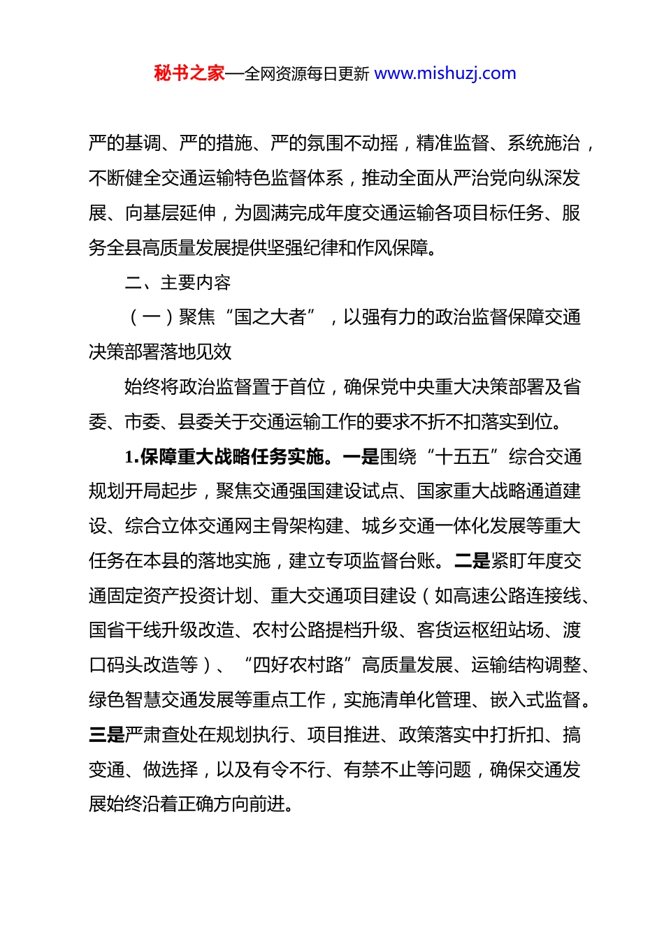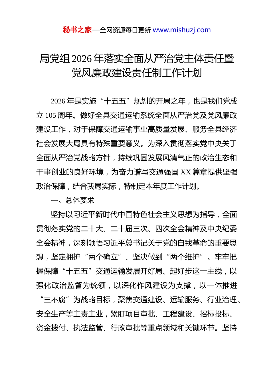 秘书之家—全网资源每日更新 www.mishuzj.com局党组 2026 年落实全面从严治党主体责任暨党风廉政建设责任制工作计划 2026 年是实施“十五五”规划的开局之年,也是我们党成立 105 周年。做好全县交通运输系统全面从严治党及党风廉政建设工作,对于保障交通运输事业高质量发展、服务全县经济社会发展大局具有特殊重要意义。为深入贯彻落实党中央关于全面从严治党战略方针,持续巩固发展风清气正的政治生态和干事创业的良好环境,为奋力谱写交通强国 XX 篇章提供坚强政治保障,结合我局实际,特制定本年度工作计划。一、总体要求坚持以习近平新时代中国特色社会主义思想为指导,全面贯彻落实党的二十大、二十届三次、四次全会精神及中央纪委全会精神,深刻领悟习近平总书记关于党的自我革命的重要思想,坚定拥护“两个确立”、坚决做到“两个维护”。牢牢把握保障“十五五”交通运输发展开好局、起好步这一主线,以强化政治监督为统领,以深化作风建设为支撑,以一体推进“三不腐”为战略目标,聚焦交通建设、运输服务、行业治理、安全生产等主责主业,紧盯项目审批、工程建设、招标投标、资金拨付、执法监管、行政审批等重点领域和关键环节。坚持秘书之家—全网资源每日更新 www.mishuzj.com严的基调、严的措施、严的氛围不动摇,精准监督、系统施治,不断健全交通运输特色监督体系,推动全面从严治党向纵深发展、向基层延伸,为圆满完成年度交通运输各项目标任务、服务全县高质量发展提供坚强纪律和作风保障。二、主要内容(一)聚焦“国之大者”,以强有力的政治监督保障交通决策部署落地见效始终将政治监督置于首位,确保党中央重大决策部署及省委、市委、县委关于交通运输工作的要求不折不扣落实到位。1.保障重大战略任务实施。一是围绕“十五五”综合交通规划开局起步,聚焦交通强国建设试点、国家重大战略通道建设、综合立体交通网主骨架构建、城乡交通一体化发展等重大任务在本县的落地实施,建立专项监督台账。二是紧盯年度交通固定资产投资计划、重大交通项目建设(如高速公路连接线、国省干线升级改造、农村公路提档升级、客货运枢纽站场、渡口码头改造等)、“四好农村路”高质量发展、运输结构调整、绿色智慧交通发展等重点工作,实施清单化管理、嵌入式监督。三是严肃查处在规划执行、项目推进、政策落实中打折扣、搞变通、做选择,以及有令不行、有禁不止等问题,确保交通发展始终沿着正确方向前进。秘书之家—全网资源每日更新 www.mishuzj.com2.严明政治纪律规矩。一是把遵守党的政治纪律和政治规矩情况作为监督重点,坚决纠治“七个有之”问题,严肃查处对党不忠诚不老实、阳奉阴违的“两面人”“两面派”。二是加强对党章党规党纪执行情况的监督检查,督促各级党组织和党员干部始终在思想上政治上行动上同党中央保持高度一致。三是强化对“一把手”和领导班子落实全面从严治党责任、执行民主集中制、依规依法履职用权等情况的监督,特别是对“三重一大”决策制度执行情况的监督,规范交通领域重大事项决策权。3.推动树立和践行正确政绩观。一是组织开展“树立和践行正确交通政绩观”专题学习教育,纳入党组理论学习中心组学习、支部“三会一课”、干部教育培训重要内容,深入学习领会习近平总书记关于树立和践行正确政绩观的重要论述。二是引导党员干部深刻理解“为谁创造业绩、创造什么样的业绩、怎样创造业绩”的根本问题,坚决反对和纠治在交通建设中脱离实际、盲目举债、重复建设,搞“形象工程”“政绩工程”,以及数据造假、虚报进度等行为。三是在交通规划编制、项目立项评审、设计变更、资金安排、质量评定、运营评价等环节加强监督制约,注重评估项目的长远经济效益、社会效益和生态效益,推动建设人民满意交通。四是建立符合正确政绩观要秘书之家—全网资源每日更新 www.mishuzj.com求的考核评价机制,将群众满意度、安全效益、生态环保等纳入考核指标体系。(二)深化作风建设,以钉钉子精神锲而不舍落实中央八项规定精神坚持常抓不懈、久久为功,持续加固中央八项规定精神堤坝,推动交通系统作风持续向好。4.从严整治享乐奢靡歪风。一是...