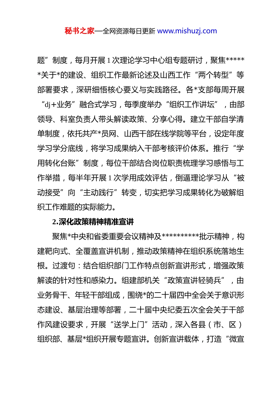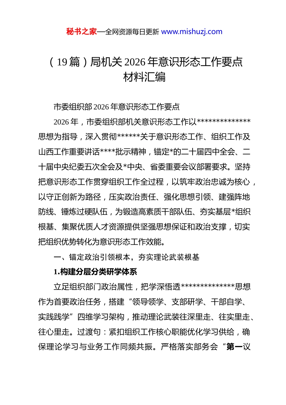 秘书之家—全网资源每日更新 www.mishuzj.com(19 篇)局机关 2026 年意识形态工作要点材料汇编市委组织部 2026 年意识形态工作要点2026 年,市委组织部机关意识形态工作以**************思想为指导,深入贯彻******关于意识形态工作、组织工作及山西工作重要讲话****批示精神,锚定*的二十届四中全会、二十届中央纪委五次全会及*中央、省委重要会议部署要求。坚持把意识形态工作贯穿组织工作全过程,以筑牢政治忠诚为核心,以守正创新为路径,压实政治责任、强化思想引领、建强阵地防线、锤炼过硬队伍,为锻造高素质干部队伍、夯实基层*组织根基、集聚优质人才资源提供坚强思想保证和政治支撑,切实把组织优势转化为意识形态工作效能。一、锚定政治引领根本,夯实理论武装根基1.构建分层分类研学体系立足组织部门政治属性,把学深悟透**************思想作为首要政治任务,搭建“领导领学、支部研学、干部自学、实践践学”四维学习架构,推动理论武装往深里走、往实里走、往心里走。过渡句:紧扣组织工作核心职能优化学习供给,确保理论学习与业务工作同频共振。严格落实部务会“第一议秘书之家—全网资源每日更新 www.mishuzj.com题”制度,每月开展 1 次理论学习中心组专题研讨,聚焦******关于*的建设、组织工作最新论述及山西工作“两个转型”等部署要求,深研细悟核心要义与实践路径。各*支部每周开展“dj+业务”融合式学习,每季度举办“组织工作讲坛”,由部领导、科室负责人带头解读政策、分享心得。建立干部自学清单制度,依托共产*员网、山西干部在线学院等平台,设定年度学习学分底线,将学习成果纳入干部考核评价体系。推行“学用转化台账”制度,每位干部结合岗位职责梳理学习感悟与工作举措,每半年开展 1 次学用成效评估,倒逼理论学习从“被动接受”向“主动践行”转变,切实把学习成果转化为破解组织工作难题的实际能力。2.深化政策精神精准宣讲聚焦*中央和省委重要会议精神及**********批示精神,构建靶向式、全覆盖宣讲机制,推动政策精神在组织系统落地生根。过渡句:结合组织部门工作特点创新宣讲形式,增强政策解读的针对性和感染力。组建部机关“政策宣讲轻骑兵”,由业务骨干、年轻干部组成,围绕*的二十届四中全会关于意识形态建设、基层治理等部署,二十届中央纪委五次全会关于干部作风建设要求,开展“送学上门”活动,深入各县(市、区)组织部、基层*组织开展专题宣讲。创新宣讲载体,打造“微宣秘书之家—全网资源每日更新 www.mishuzj.com讲+实场景”模式,利用晨会、工间操等碎片化时间开展“一刻钟微宣讲”,结合干部考察、基层调研等工作,在一线解读政策、回应关切。建立宣讲反馈机制,通过问卷调查、座谈交流等方式收集基层对政策宣讲的需求建议,动态调整宣讲内容与形式。每季度编印《政策解读汇编》,聚焦组织工作重点领域,对干部选拔任用、基层 dj、人才工作等政策进行精准阐释,为基层开展工作提供指导,切实打通政策宣讲“最后一公里”。3.强化政治忠诚教育淬炼以筑牢组织干部政治忠诚为核心,常态化开展政治教育、*性教育,不断提升干部政治判断力、政治领悟力、政治执行力。过渡句:把政治忠诚教育融入干部成长全周期,以严的标准锤炼过硬政治品格。开展“政治忠诚强化年”活动,组织干部赴红色教育基地开展沉浸式教学,通过重温入*誓词、聆听革命故事等形式,传承红色基因、厚植忠诚底色。严格执行组织生活制度,每年召开 1 次专题组织生活会,聚焦政治忠诚、政治担当等方面开展批评与自我批评,深入查摆问题并限期整改。建立政治素质考察常态化机制,将政治忠诚表现贯穿干部选拔任用、日常管理、考核评价全过程,细化政治素质评价指标,对政治上不合格的干部实行“一票否决”。每半年开展 1 次“政治忠诚大家谈”活动,组织干部围绕“如何做政治上的明白人、秘书之家—全网资源每日更新 www.mishuzj.com老实人”开展讨论交流,引导全体干部始终在政治立场、政治方向、政治原则、政治道路上同以***同志为核心的*中央保持高度一致,自觉把政治忠诚体现到组织工作各环节。4.推动学用结合深度融合坚持问题导向、目...