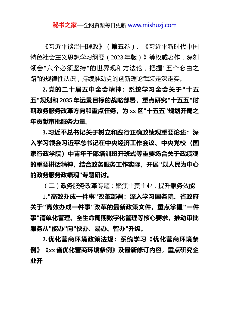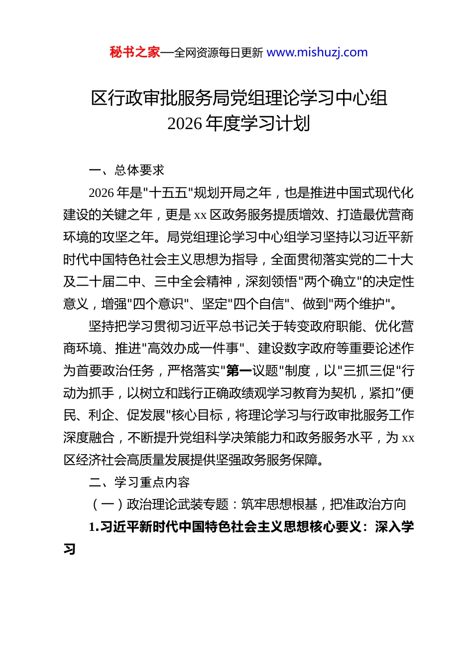 秘书之家—全网资源每日更新 www.mishuzj.com区行政审批服务局党组理论学习中心组2026 年度学习计划 一、总体要求2026 年是"十五五"规划开局之年,也是推进中国式现代化建设的关键之年,更是 xx 区政务服务提质增效、打造最优营商环境的攻坚之年。局党组理论学习中心组学习坚持以习近平新时代中国特色社会主义思想为指导,全面贯彻落实党的二十大及二十届二中、三中全会精神,深刻领悟"两个确立"的决定性意义,增强"四个意识"、坚定"四个自信"、做到"两个维护"。坚持把学习贯彻习近平总书记关于转变政府职能、优化营商环境、推进"高效办成一件事"、建设数字政府等重要论述作为首要政治任务,严格落实"第一议题"制度,以"三抓三促"行”动为抓手,以树立和践行正确政绩观学习教育为契机,紧扣 便民、利企、促发展"核心目标,将理论学习与行政审批服务工作深度融合,不断提升党组科学决策能力和政务服务水平,为 xx区经济社会高质量发展提供坚强政务服务保障。二、学习重点内容(一)政治理论武装专题:筑牢思想根基,把准政治方向1.习近平新时代中国特色社会主义思想核心要义:深入学习秘书之家—全网资源每日更新 www.mishuzj.com《习近平谈治国理政》(第五卷)、《习近平新时代中国特色社会主义思想学习纲要(2023 年版)》等权威著作,深刻领会"六个必须坚持"的世界观和方法论,把握"五个必由之路"的规律性认识,持续推动党的创新理论武装走深走实。2.党的二十届五中全会精神:系统学习全会关于"十五五"规划和 2035 年远景目标的战略部署,重点研究"十五五"时期政务服务改革方向和重点任务,为 xx 区"十五五"规划开局之年贡献审批服务力量。3.习近平总书记关于树立和践行正确政绩观重要论述:深入学习领会习近平总书记在中央经济工作会议、中央党校(国家行政学院)中青年干部培训班开班式等重要场合关于政绩观的重要讲话精神,结合政务服务工作实际,开展"以人民为中心的政务服务政绩观"专题研讨。(二)政务服务改革专题:聚焦主责主业,提升服务效能1."高效办成一件事"改革部署:深入学习国务院、省政府关于"高效办成一件事"改革的最新政策文件,重点掌握"一件事"清单化管理、全生命周期数字化管理等核心要求,推动审批服务从"能办"向"快办、易办、智办"升级。2.优化营商环境政策法规:系统学习《优化营商环境条例》《xx 省优化营商环境条例》及最新修订内容,重点研究企业开秘书之家—全网资源每日更新 www.mishuzj.com办、工程建设项目审批、不动产登记等领域改革举措,推动各项优化举措落地见效。3.数字政府建设与政务服务数字化转型:学习习近平总书记关于数字政府建设的重要论述,掌握政务服务平台升级、AI智能服务、"扫码办""刷脸办"等无感服务技术应用,推动跨部门、跨层级数据共享和业务协同,打破"部门墙",杜绝审批事项"”明进暗不进 、"体外循环"。(三)法治建设专题:坚持依法行政,规范审批行为1.习近平法治思想:深入学习习近平总书记关于全面依法治国的重要论述,重点学习《行政许可法》《行政处罚法》《行政复议法》等与行政审批服务密切相关的法律法规,提升依法行政、依法办事、依法履职能力。2.政务服务标准化规范化便利化:学习《政务服务标准化工作指南》《政务服务中心运行规范》等国家标准,研究推进政务服务事项清单化管理、窗口服务规范化建设、审批流程优化等具体措施,确保审批服务合法合规、高效便捷。3.纪律作风与廉政建设:学习《中国共产党纪律处分条例》《中国共产党廉洁自律准则》,结合巡察整改要求,开展纪律作风建设专题学习,坚决整治形式主义、官僚主义,守牢廉洁自律、数据安全、服务质量等五条底线。(四)能力提升专题:强化担当作为,锻造过硬队伍秘书之家—全网资源每日更新 www.mishuzj.com1."”三抓三促 行动深化落实:学习省、市、区关于深化"三抓三促"行动全面提升"三服务"质效的部署要求,坚持"干什么学什么""缺什么补什么",围绕全区中心工作,开展履职能力培训,精准把握招商引资方向、经济社会发展重点。2.创新服务理念与方法:学习先进地区政务服务创新经验,研究"小西帮办"品牌建设、"办不成事"反...