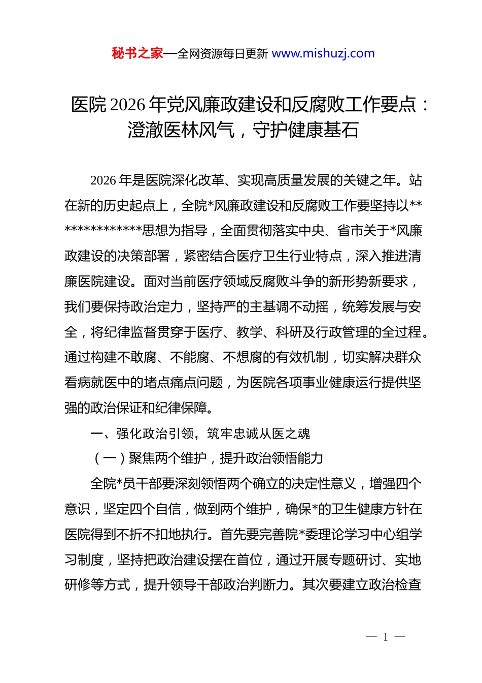秘书之家—全网资源每日更新 www.mishuzj.com医院 2026 年党风廉政建设和反腐败工作要点:澄澈医林风气,守护健康基石2026 年是医院深化改革、实现高质量发展的关键之年。站在新的历史起点上,全院*风廉政建设和反腐败工作要坚持以**************思想为指导,全面贯彻落实中央、省市关于*风廉政建设的决策部署,紧密结合医疗卫生行业特点,深入推进清廉医院建设。面对当前医疗领域反腐败斗争的新形势新要求,我们要保持政治定力,坚持严的主基调不动摇,统筹发展与安全,将纪律监督贯穿于医疗、教学、科研及行政管理的全过程。通过构建不敢腐、不能腐、不想腐的有效机制,切实解决群众看病就医中的堵点痛点问题,为医院各项事业健康运行提供坚强的政治保证和纪律保障。一、强化政治引领,筑牢忠诚从医之魂(一)聚焦两个维护,提升政治领悟能力全院*员干部要深刻领悟两个确立的决定性意义,增强四个意识,坚定四个自信,做到两个维护,确保*的卫生健康方针在医院得到不折不扣地执行。首先要完善院*委理论学习中心组学习制度,坚持把政治建设摆在首位,通过开展专题研讨、实地研修等方式,提升领导干部政治判断力。其次要建立政治检查— 1 —秘书之家—全网资源每日更新 www.mishuzj.com常态化机制,重点监督执行医疗服务标准、落实国家集采政策等工作,确保医院发展方向始终不偏。最后要强化对临床一线医护人员的政治吸引,把“讲政治”融入日常诊疗活动,引导广大医务工作者在服务患者中践行初心使命。(二)压实主体责任,构建协同联动机制医院*委要切实履行*风廉政建设主体责任,班子成员要认真履行一岗双责,形成一级抓一级、层层抓落实的工作格局。首先要修订完善年度*风廉政建设责任清单,将廉政工作任务细化到各临床科室和职能部门,明确考核权重与奖惩措施。其次要建立健全定期会商制度,纪检部门与组织、人事、财务等部门加强信息共享,对发现的苗头性问题及时提醒谈话,推动主体责任与监督责任深度融合。最后要强化责任追究,对履行责任不到位、导致发生违法违纪行为的科室负责人进行严肃问责,通过“问责一个”带动“警示一片”。(三)严明政治纪律,规范权力运行流程全院各级*组织要将严明政治纪律和政治规矩作为根本任务,确保在执行决策部署上做到令行禁止。首先要严格执行民主集中制原则,落实三重一大决策制度,确保重大决策、重要干部任免、重大项目安排和大额度资金使用必须经集体讨论决定。其次要完善科室民主管理制度,强化对临床科主任、护士长权— 2 —秘书之家—全网资源每日更新 www.mishuzj.com力的约束,建立权力清单和负面清单,防止个人说了算。最后要加强对选人用人全过程的监督,严把政治关、廉洁关,坚决防止带病提拔,确保医院管理队伍的纯洁性和战斗力,真正做到按规矩办事。二、深化日常监督,严守执纪问责之线(一)盯紧关键少数,强化干部廉洁自律加强对医院领导班子和各级中层干部的监督管理,是预防腐败的重中之重。首先要建立领导干部廉政档案制度,动态采集房产、收入、子女就业等关键信息,实现对干部廉洁风险的精准画像。其次要常态化开展廉政提醒谈话,在干部任职前、节假日等关键时间节点,通过集体约谈或个别交流,打好“预防针”,防止其跨越纪法红线。最后要落实述职述廉制度,每年组织重点岗位负责人向全院公开报告执行廉洁自律规定情况,接受群众评议,让权力在阳光下运行。(二)聚焦重点领域,织密风险防控网络医疗行业中药剂采购、耗材申领、工程招标及财务报账等环节,历来是违纪违法案件的高发区。首先要加强对药事管理委员会决策过程的专项监督,严格落实国家医保谈判药品及集采药品的优先使用要求,严禁医生违规指定药店购药。其次要强化对医用耗材全生命周期的管理,利用信息化手段跟踪高值— 3 —秘书之家—全网资源每日更新 www.mishuzj.com耗材流向,防止出现“以权谋私”的利益输送空间。最后要严控医院基建工程招投标流程,推行第三方审计制度,对项目立项、标书编制、现场施工进行闭环监督,确保每一分资金都用到患者最需要的地方。(三)创新监督手段,提升精准预警效能依托智慧医院建设成果,探索...
