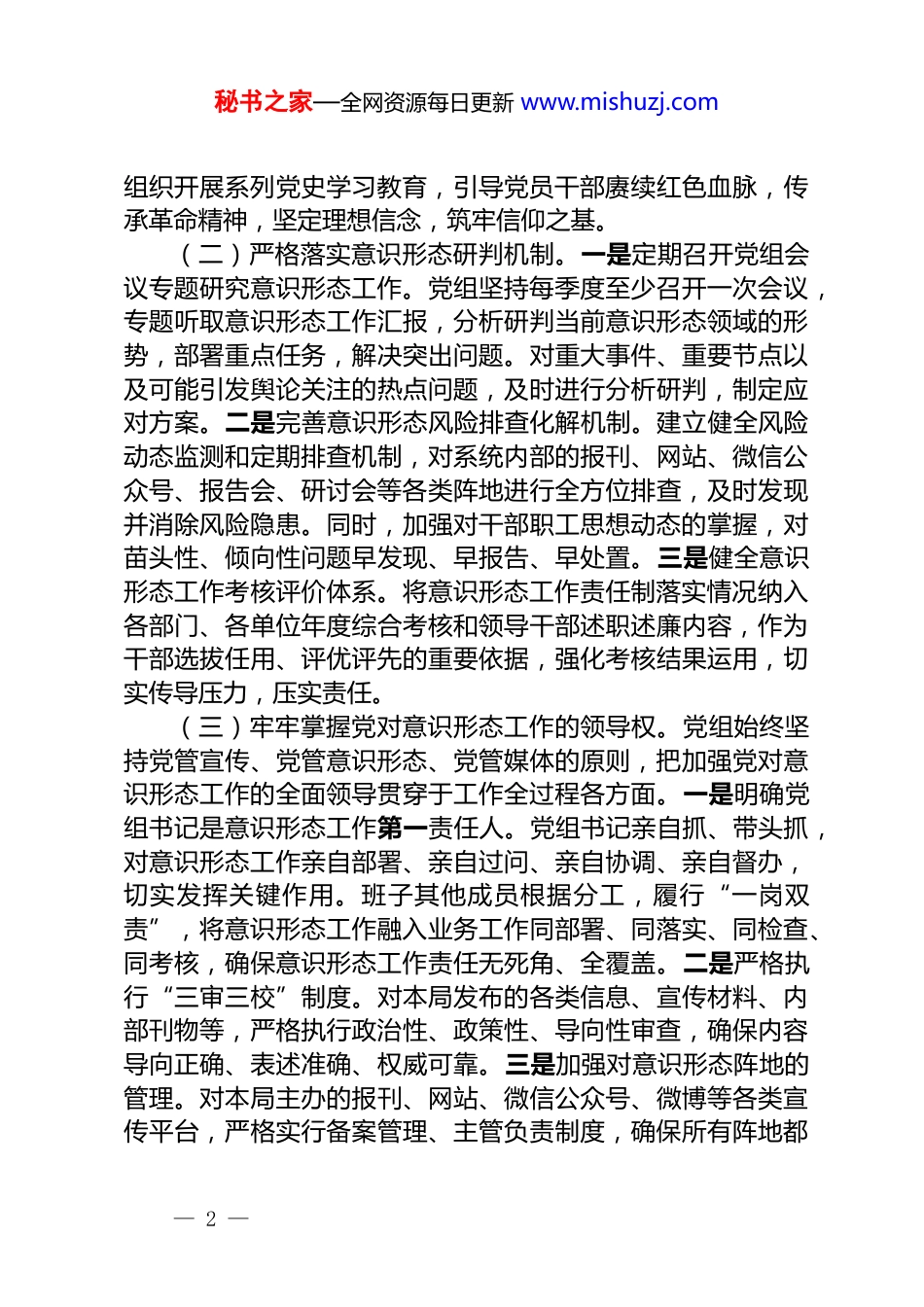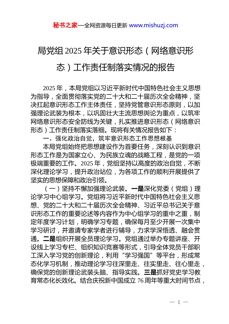 秘书之家—全网资源每日更新 www.mishuzj.com局党组 2025 年关于意识形态(网络意识形态)工作责任制落实情况的报告2025 年,本局党组以习近平新时代中国特色社会主义思想为指导,全面贯彻落实党的二十大和二十届历次全会精神,坚决扛起意识形态工作主体责任,坚持党管意识形态原则,以加强理论武装为根本,以巩固壮大主流思想舆论为重点,以筑牢网络意识形态安全防线为关键,扎实推进意识形态(网络意识形态)工作责任制落实落细。现将有关情况报告如下:一、强化政治自觉,筑牢意识形态工作思想根基本局党组始终把思想建设作为首要任务,深刻认识到意识形态工作是为国家立心、为民族立魂的战略工程,是党的一项极端重要的工作。2025 年,党组坚持以高度的政治自觉,不断深化理论学习,提升政治站位,为各项工作的顺利开展提供了坚实的思想保障和政治引领。(一)坚持不懈加强理论武装。一是深化党委(党组)理论学习中心组学习。党组将习近平新时代中国特色社会主义思想、党的二十大和二十届历次全会精神、习近平总书记关于意识形态工作的重要论述等内容作为中心组学习的重中之重,制定年度学习计划,明确学习专题,确保每月至少开展一次集中学习研讨,并邀请专家学者进行辅导,力求学深悟透、融会贯通。二是组织开展全员理论学习。党组通过举办专题讲座、开设线上学习专栏、组织知识竞赛等形式,引导全体党员干部职工深入学习党的创新理论,利用“学习强国”等平台,形成常态化学习机制,推动理论学习往深里走、往实里走、往心里走,确保党的创新理论武装头脑、指导实践。三是抓好党史学习教育常态化长效化。结合庆祝新中国成立 76 周年等重大时间节点,— 1 —秘书之家—全网资源每日更新 www.mishuzj.com组织开展系列党史学习教育,引导党员干部赓续红色血脉,传承革命精神,坚定理想信念,筑牢信仰之基。(二)严格落实意识形态研判机制。一是定期召开党组会议专题研究意识形态工作。党组坚持每季度至少召开一次会议,专题听取意识形态工作汇报,分析研判当前意识形态领域的形势,部署重点任务,解决突出问题。对重大事件、重要节点以及可能引发舆论关注的热点问题,及时进行分析研判,制定应对方案。二是完善意识形态风险排查化解机制。建立健全风险动态监测和定期排查机制,对系统内部的报刊、网站、微信公众号、报告会、研讨会等各类阵地进行全方位排查,及时发现并消除风险隐患。同时,加强对干部职工思想动态的掌握,对苗头性、倾向性问题早发现、早报告、早处置。三是健全意识形态工作考核评价体系。将意识形态工作责任制落实情况纳入各部门、各单位年度综合考核和领导干部述职述廉内容,作为干部选拔任用、评优评先的重要依据,强化考核结果运用,切实传导压力,压实责任。(三)牢牢掌握党对意识形态工作的领导权。党组始终坚持党管宣传、党管意识形态、党管媒体的原则,把加强党对意识形态工作的全面领导贯穿于工作全过程各方面。一是明确党组书记是意识形态工作第一责任人。党组书记亲自抓、带头抓,对意识形态工作亲自部署、亲自过问、亲自协调、亲自督办,切实发挥关键作用。班子其他成员根据分工,履行“一岗双责”,将意识形态工作融入业务工作同部署、同落实、同检查、同考核,确保意识形态工作责任无死角、全覆盖。二是严格执行“三审三校”制度。对本局发布的各类信息、宣传材料、内部刊物等,严格执行政治性、政策性、导向性审查,确保内容导向正确、表述准确、权威可靠。三是加强对意识形态阵地的管理。对本局主办的报刊、网站、微信公众号、微博等各类宣传平台,严格实行备案管理、主管负责制度,确保所有阵地都— 2 —秘书之家—全网资源每日更新 www.mishuzj.com在党的领导下规范运行。二、全面落实主体责任,构建意识形态工作坚强防线本局党组坚持把落实意识形态工作责任制作为硬任务,构建科学严密的责任体系,确保各项工作有人抓、有人管、抓得实、有成效。(一)健全责任体系,层层压实责任链条。一是明确主体责任。党组作为本局意识形态工作的主体,对全局意识形态工作负总责。党组书记是第一责任人,对重要工作亲自部署,重要问题...