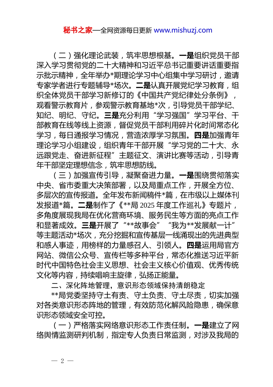 秘书之家—全网资源每日更新 www.mishuzj.com局 2025 年意识形态工作情况报告2025 年,**局党委在市委、市政府的坚强领导下,全面贯彻落实习近平新时代中国特色社会主义思想,特别是习近平总书记关于意识形态工作的重要论述,牢牢把握意识形态工作主动权和领导权。全局上下坚持以党的政治建设为统领,严格落实意识形态工作责任制,持续加强理论武装、深化宣传教育、强化阵地管理、防范化解风险,为各项事业高质量发展提供了坚实的思想保证和强大的精神动力。全年意识形态工作总体呈现向上向好、健康有序的良好态势,为新征程上书写高质量发展新篇章凝聚了广泛共识。一、坚持政治引领,意识形态工作责任制落地生根一年来,**局党委始终将意识形态工作作为党的建设的重要内容,摆在全局工作的突出位置,全面加强组织领导,确保中央和省市委关于意识形态工作的各项决策部署不折不扣地贯彻落实。(一)压紧压实主体责任,健全工作机制。一是局党委坚持将意识形态工作纳入重要议事日程,定期专题研究部署,全年召开*次党委会(党组会)听取意识形态工作汇报,分析研判形势,解决突出问题。二是印发了《**局 2025 年意识形态工作要点》和《意识形态工作责任清单》,明确了党委书记第一责任人责任、分管领导直接责任和班子成员“一岗双责”,以及各科室、下属单位的具体责任。三是建立了意识形态工作季度报告、半年总结和年度考核制度,将责任落实情况与干部业绩考评、奖惩挂钩,形成层层传导压力、逐级抓好落实的工作格局。四是加强与纪检监察、组织人事等部门的协同联动,将意识形态工作纳入巡察、监督检查范围,对发现的问题及时督促整改,确保责任落实到位。— 1 —秘书之家—全网资源每日更新 www.mishuzj.com(二)强化理论武装,筑牢思想根基。一是组织党员干部深入学习贯彻党的二十大精神和习近平总书记重要讲话重要指示批示精神,全年举办*期理论学习中心组集中学习研讨,邀请专家学者进行专题辅导*场次。二是认真开展党纪学习教育,组织全体党员干部学习新修订的《中国共产党纪律处分条例》,观看警示教育片,参观警示教育基地*次,引导党员干部学纪、知纪、明纪、守纪。三是充分利用“学习强国”学习平台、干部教育在线等线上资源,督促党员干部利用碎片化时间常态化学习,每日通报学习情况,营造浓厚学习氛围。四是加强青年理论学习小组建设,组织青年干部开展“学习党的二十大、永远跟党走、奋进新征程”主题征文、演讲比赛等活动,引导青年干部坚定理想信念,筑牢思想防线。(三)加强宣传引导,凝聚奋进力量。一是围绕贯彻落实中央、省市委重大决策部署,以及局重点工作,开展全方位、多层次的宣传报道。全年发布新闻稿件*篇,在市级以上媒体刊发报道*篇。二是制作了《**局 2025 年度工作巡礼》专题片,多角度展现我局在优化营商环境、服务民生等方面的亮点工作和显著成效。三是开展了“**故事会”“我为**发展献一计”等主题活动*场次,充分挖掘和宣传基层一线涌现出的先进典型和感人事迹,用榜样的力量感召人、引领人。四是运用局官方网站、微信公众号、宣传栏等多种平台,常态化推送习近平新时代中国特色社会主义思想、社会主义核心价值观、优秀传统文化等内容,持续唱响主旋律,弘扬正能量。二、深化阵地管理,意识形态领域保持清朗稳定**局党委坚持守土有责、守土负责、守土尽责,切实加强对各类意识形态阵地的管理,有效防范化解风险隐患,确保意识形态领域安全可控。(一)严格落实网络意识形态工作责任制。一是建立了网络舆情监测研判机制,指定专人负责日常监测,对涉及我局的— 2 —秘书之家—全网资源每日更新 www.mishuzj.com重大网络舆情做到早发现、早报告、早处置,全年成功处置敏感舆情*起。二是加强对局属网站、微信公众号、微博等新媒体平台的管理,严格执行“三审三校”制度,确保信息发布内容的政治性、真实性、准确性,杜绝出现低级红、高级黑等问题。三是组织开展网络安全和意识形态风险防范专题培训,提高干部职工的网络素养和辨别能力,引导干部职工文明上网、理性发声。四是与市网信部门加强联动,建立健全信息共享、风险共防、应...