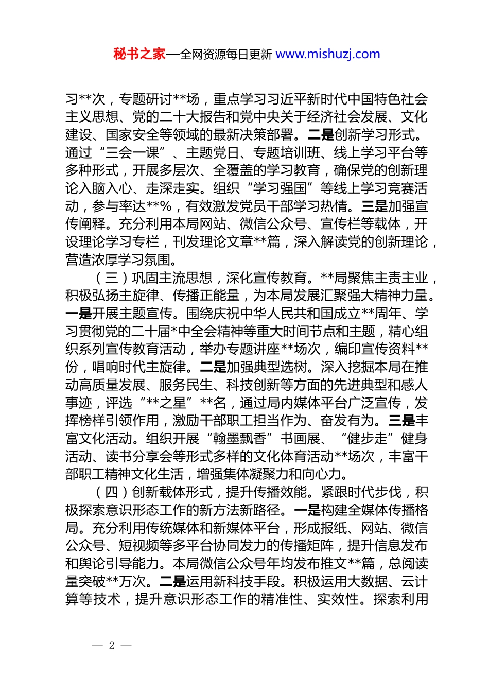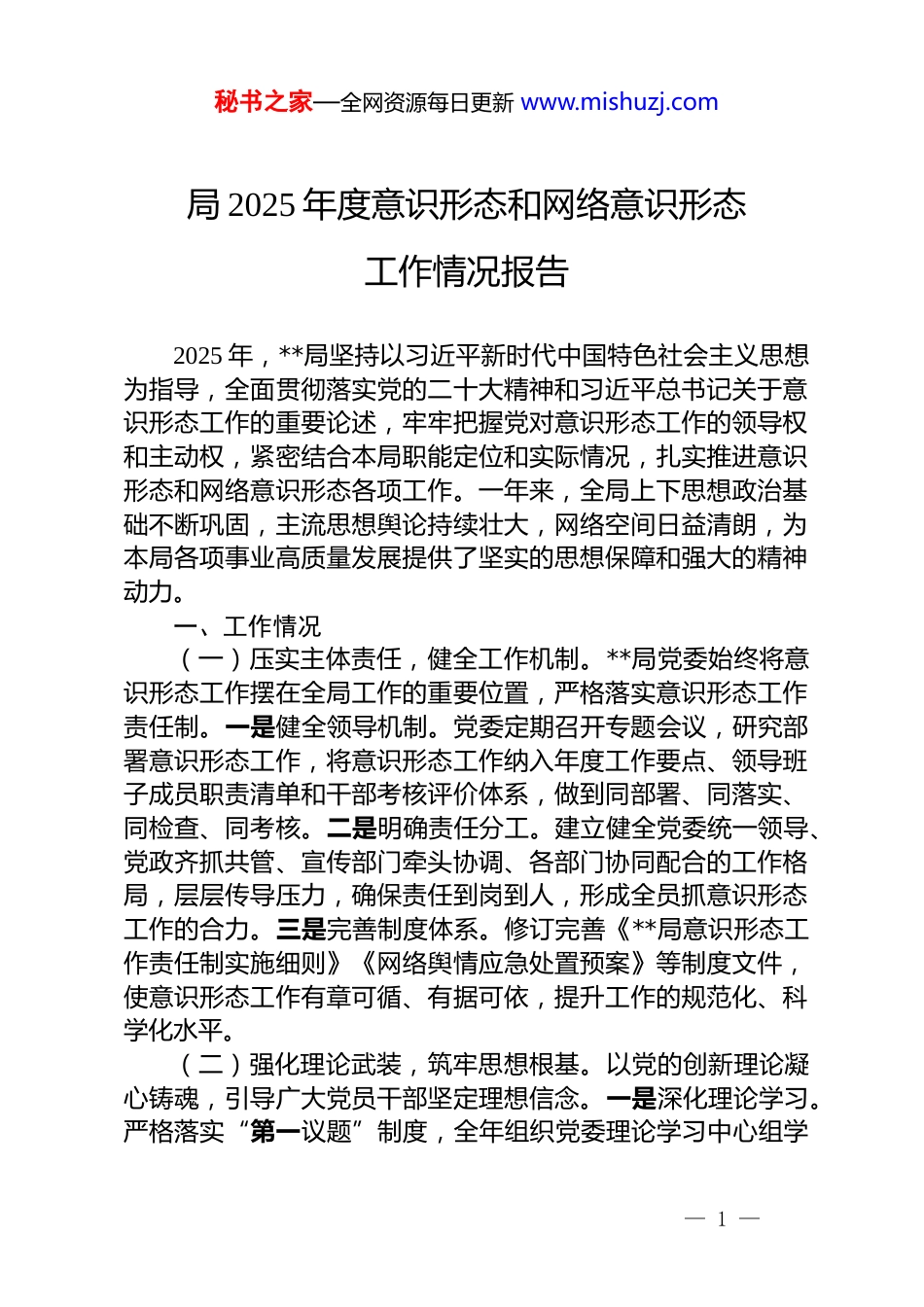 秘书之家—全网资源每日更新 www.mishuzj.com局 2025 年度意识形态和网络意识形态工作情况报告2025 年,**局坚持以习近平新时代中国特色社会主义思想为指导,全面贯彻落实党的二十大精神和习近平总书记关于意识形态工作的重要论述,牢牢把握党对意识形态工作的领导权和主动权,紧密结合本局职能定位和实际情况,扎实推进意识形态和网络意识形态各项工作。一年来,全局上下思想政治基础不断巩固,主流思想舆论持续壮大,网络空间日益清朗,为本局各项事业高质量发展提供了坚实的思想保障和强大的精神动力。一、工作情况(一)压实主体责任,健全工作机制。**局党委始终将意识形态工作摆在全局工作的重要位置,严格落实意识形态工作责任制。一是健全领导机制。党委定期召开专题会议,研究部署意识形态工作,将意识形态工作纳入年度工作要点、领导班子成员职责清单和干部考核评价体系,做到同部署、同落实、同检查、同考核。二是明确责任分工。建立健全党委统一领导、党政齐抓共管、宣传部门牵头协调、各部门协同配合的工作格局,层层传导压力,确保责任到岗到人,形成全员抓意识形态工作的合力。三是完善制度体系。修订完善《**局意识形态工作责任制实施细则》《网络舆情应急处置预案》等制度文件,使意识形态工作有章可循、有据可依,提升工作的规范化、科学化水平。(二)强化理论武装,筑牢思想根基。以党的创新理论凝心铸魂,引导广大党员干部坚定理想信念。一是深化理论学习。严格落实“第一议题”制度,全年组织党委理论学习中心组学— 1 —秘书之家—全网资源每日更新 www.mishuzj.com习**次,专题研讨**场,重点学习习近平新时代中国特色社会主义思想、党的二十大报告和党中央关于经济社会发展、文化建设、国家安全等领域的最新决策部署。二是创新学习形式。通过“三会一课”、主题党日、专题培训班、线上学习平台等多种形式,开展多层次、全覆盖的学习教育,确保党的创新理论入脑入心、走深走实。组织“学习强国”等线上学习竞赛活动,参与率达**%,有效激发党员干部学习热情。三是加强宣传阐释。充分利用本局网站、微信公众号、宣传栏等载体,开设理论学习专栏,刊发理论文章**篇,深入解读党的创新理论,营造浓厚学习氛围。(三)巩固主流思想,深化宣传教育。**局聚焦主责主业,积极弘扬主旋律、传播正能量,为本局发展汇聚强大精神力量。一是开展主题宣传。围绕庆祝中华人民共和国成立**周年、学习贯彻党的二十届*中全会精神等重大时间节点和主题,精心组织系列宣传教育活动,举办专题讲座**场次,编印宣传资料**份,唱响时代主旋律。二是加强典型选树。深入挖掘本局在推动高质量发展、服务民生、科技创新等方面的先进典型和感人事迹,评选“**之星”**名,通过局内媒体平台广泛宣传,发挥榜样引领作用,激励干部职工担当作为、奋发有为。三是丰富文化活动。组织开展“翰墨飘香”书画展、“健步走”健身活动、读书分享会等形式多样的文化体育活动**场次,丰富干部职工精神文化生活,增强集体凝聚力和向心力。(四)创新载体形式,提升传播效能。紧跟时代步伐,积极探索意识形态工作的新方法新路径。一是构建全媒体传播格局。充分利用传统媒体和新媒体平台,形成报纸、网站、微信公众号、短视频等多平台协同发力的传播矩阵,提升信息发布和舆论引导能力。本局微信公众号年均发布推文**篇,总阅读量突破**万次。二是运用新科技手段。积极运用大数据、云计算等技术,提升意识形态工作的精准性、实效性。探索利用— 2 —秘书之家—全网资源每日更新 www.mishuzj.comVR/AR 技术开展沉浸式党史学习教育,提升学习的趣味性和感染力。三是加强对外交流合作。与**媒体、**智库等机构开展合作,共同策划制作**部宣传片,扩大本局的社会影响力,讲好本局故事、传播本局声音。二、工作特点(一)坚持管网治网,净化网络空间。**局始终将网络意识形态工作作为意识形态工作的重中之重,坚持依法治网、科学管网。一是健全网络管理制度。完善网络信息发布审核机制、网络安全管理制度,对本局所属网站、新媒体平台的内容发布实行严格把关,确保信息真实、准确、正面。二是强化...