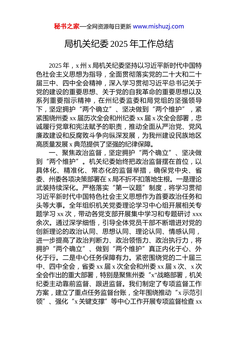 秘书之家—全网资源每日更新 www.mishuzj.com局机关纪委 2025 年工作总结2025 年,x 州 x 局机关纪委坚持以习近平新时代中国特色社会主义思想为指导,全面贯彻落实党的二十大和二十届三中、四中全会精神,深入学习贯彻习近平总书记关于党的建设的重要思想、关于党的自我革命的重要思想以及系列重要指示精神,在州纪委监委和局党组的坚强领导下,坚定拥护“两个确立”、坚决做到“两个维护”,紧紧围绕州委 xx 届历次全会和州纪委 xx 届 x 次全会部署,忠诚履行党章和宪法赋予的职责,推动全面从严治党、党风廉政建设和反腐败斗争向纵深发展,为我州建设民族地区高质量发展 x 典范提供了坚强的纪律保障。一、聚焦政治监督,坚定拥护“两个确立”、坚决做到“两个维护” 。机关纪委始终把政治监督摆在首位,以具体化、精准化、常态化的监督举措,确保党中央、省委、州委各项决策部署在 x 局不折不扣落地生根。一是理论武装持续深化。严格落实“第一议题”制度,将学习贯彻习近平新时代中国特色社会主义思想作为首要政治任务和头等大事。全年组织机关党委理论学习中心组开展相关专题学习 xx 次,带动各党支部开展集中学习和专题研讨 xxx余次。通过深学细悟,引导全体党员干部不断增进对党的创新理论的政治认同、思想认同、理论认同、情感认同,进一步提高了政治判断力、政治领悟力、政治执行力,将拥护“两个确立”、做到“两个维护”真正内化于心、外化于行。二是中心任务保障有力。紧密围绕党的二十届三中、四中全会,省委 xx 届 x 次全会和州委 xx 届 x 次、x 次全会作出的重大部署,特别是聚焦州委“x”战略部署,机关纪委主动靠前监督、跟进监督。我们制定了专项监督工作方案,建立了重点任务监督台账,全年围绕推动“x 示范引领”、强化“x 关键支撑”等中心工作开展专项监督检查 xx秘书之家—全网资源每日更新 www.mishuzj.com轮次,发现并推动整改各类问题 xx 个,提出纪检建议 xx份,确保了州委、州政府重大决策部署在财政系统条条落实、件件落地、事事见效。三是整改问效监督到位。坚持把抓好巡视巡察、督查检查等反馈问题整改作为检验政治忠诚度的“试金石”。针对上级巡察、专项督查以及机关党建述职评议中指出的问题,机关纪委开展了多轮“回头看”和整改质效评估工作。我们严格对照问题清单、任务清单、责任清单,逐项审核把关整改销号资料,对整改不力、敷衍塞责的 x 个责任科室负责人进行了约谈提醒,确保所有问题真改实改、全面整改,坚决杜绝“纸面整改”“虚假整改”,做深做实了整改监督“后半篇文章”。二、深化正风肃纪,一体推进党风廉政建设和反腐败斗争。机关纪委坚持严的基调不动摇,以永远在路上的坚韧和执着,驰而不息纠治“四风”,一体推进不敢腐、不能腐、不想腐,持续净化政治生态。一是管党治党责任全面压实。协助局党组认真落实党风廉政建设主体责任,推动党建工作与财政业务深度融合。通过定期召开党风廉政建设专题会议、签订责任书、开展述责述廉等方式,层层传导压力,将“一岗双责”落到实处。全年共对 xx 名科室负责人开展了落实“一岗双责”情况的专项检查,坚决纠治了只抓业务不抓风纪、只管发展不治腐败等问题。同时,加强与局内各业务科室的协作配合,完善了信息沟通、线索移送、成果共享等工作机制,初步构建起各负其责、统一协调的大监督格局。二是机关作风建设常抓不懈。我们始终将贯彻落实中央八项规定及其实施细则精神作为一项铁规矩、硬杠杠。全年组织开展了 x 次专题学习教育,重申省委、省政府十项规定和州委、州政府八条意见要求。通过明察暗访、随机抽查等方式,严肃查处了以党建活动名义变相公款旅游、违规接受宴请等问题 x 起,处理x 人。针对“快递送礼”、私车公养等隐形变异问题,我们加大了甄别和查处力度。深入落实省、州为基层减负各项秘书之家—全网资源每日更新 www.mishuzj.com规定及《x 局整治形式主义切实为基层减负清单》,严格执行公务活动用餐(车是“扫码支付”制度,持续整治“小马拉大车”、搞“新形象工程”等问题,切实为基层松绑减负。此外,我们还牵头...