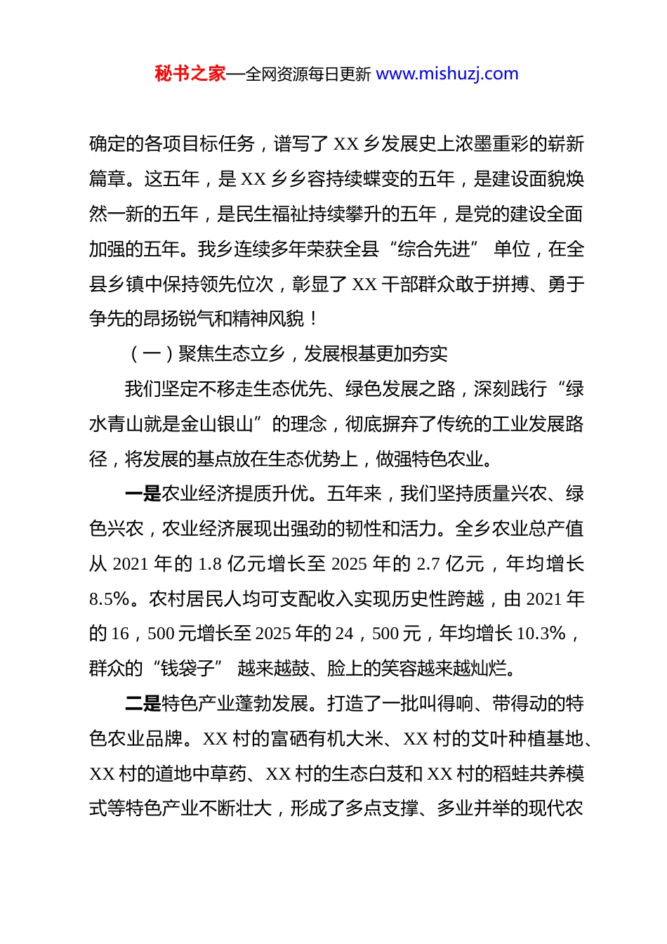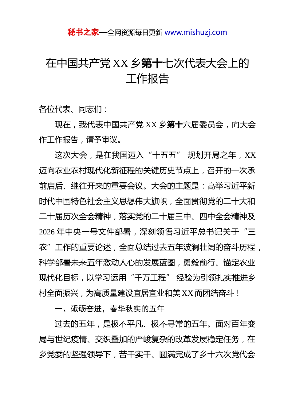 秘书之家—全网资源每日更新 www.mishuzj.com在中国共产党 XX 乡第十七次代表大会上的工作报告 各位代表、同志们:现在,我代表中国共产党 XX 乡第十六届委员会,向大会作工作报告,请予审议。这次大会,是在我国迈入“十五五” 规划开局之年,XX迈向农业农村现代化新征程的关键历史节点上,召开的一次承前启后、继往开来的重要会议。大会的主题是:高举习近平新时代中国特色社会主义思想伟大旗帜,全面贯彻党的二十大和二十届历次全会精神,落实党的二十届三中、四中全会精神及2026 年中央一号文件部署,深刻领悟习近平总书记关于“三农”工作的重要论述,全面总结过去五年波澜壮阔的奋斗历程,科学部署未来五年激动人心的发展蓝图,勇毅前行、锚定农业现代化目标,以学习运用“千万工程” 经验为引领扎实推进乡村全面振兴,为高质量建设宜居宜业和美 XX 而团结奋斗!一、砥砺奋进,春华秋实的五年过去的五年,是极不平凡、极不寻常的五年。面对百年变局与世纪疫情、交织叠加的严峻复杂的改革发展稳定任务,在乡党委的坚强领导下,苦干实干、圆满完成了乡十六次党代会秘书之家—全网资源每日更新 www.mishuzj.com确定的各项目标任务,谱写了 XX 乡发展史上浓墨重彩的崭新篇章。这五年,是 XX 乡乡容持续蝶变的五年,是建设面貌焕然一新的五年,是民生福祉持续攀升的五年,是党的建设全面加强的五年。我乡连续多年荣获全县“综合先进” 单位,在全县乡镇中保持领先位次,彰显了 XX 干部群众敢于拼搏、勇于争先的昂扬锐气和精神风貌!(一)聚焦生态立乡,发展根基更加夯实我们坚定不移走生态优先、绿色发展之路,深刻践行“绿水青山就是金山银山”的理念,彻底摒弃了传统的工业发展路径,将发展的基点放在生态优势上,做强特色农业。一是农业经济提质升优。五年来,我们坚持质量兴农、绿色兴农,农业经济展现出强劲的韧性和活力。全乡农业总产值从 2021 年的 1.8 亿元增长至 2025 年的 2.7 亿元,年均增长8.5%。农村居民人均可支配收入实现历史性跨越,由 2021 年的 16,500 元增长至 2025 年的 24,500 元,年均增长 10.3%,群众的“钱袋子” 越来越鼓、脸上的笑容越来越灿烂。二是特色产业蓬勃发展。打造了一批叫得响、带得动的特色农业品牌。XX 村的富硒有机大米、XX 村的艾叶种植基地、XX 村的道地中草药、XX 村的生态白芨和 XX 村的稻蛙共养模式等特色产业不断壮大,形成了多点支撑、多业并举的现代农秘书之家—全网资源每日更新 www.mishuzj.com业发展新格局。三是村级集体经济全面壮大。我们通过盘活闲置资源、发展合作经营、提供社会化服务等多种途径,推动村级集体经济从“输血” 向 “造血” 转变。全乡 13 个村(居)集体经济收入全部实现稳定增长,2025 年底总收入达到 780 万元,较五年前翻了一番,为乡村振兴注入了源头活水。(二)聚焦党建引领,战斗堡垒更加坚固我们始终坚持以党的政治建设为统领,以全面从严治党为主线,持之以恒抓思想、强组织、正作风、严纪律,党的旗帜在 XX 乡村一线高高飘扬。一是思想根基铸得更牢。我们坚持用习近平新时代中国特色社会主义思想凝心铸魂,扎实开展党史学习教育和历次主题教育,引导全乡党员干部深刻领悟“两个确立” 的决定性意义,增强 “四个意识”、坚定“四个自信”、做到 “两个维护”,确保党的创新理论在 XX 落地生根、开花结果。二是组织体系建得更强。我们牢固树立“不抓党建是失职、抓不好党建是不称职” 的责任意识,投入 150 多万元对全乡 13个村(居)党群服务中心进行标准化、规范化升级改造,重点打造了 XX 村、XX 村两个省级党建引领乡村治理示范点,选优配强驻村“第一书记” 和工作队,基层党组织的政治功能和组秘书之家—全网资源每日更新 www.mishuzj.com织功能显著增强。三是干部作风转得更实。我们持续深化拓展整治形式主义为基层减负工作,让干部有更多时间和精力深入田间地头、走进群众家中。建立健全《机关干部管理制度》《村级工作综合考评实施意见》等长效机制,激励干部在乡村振兴、项目建设、应急处突等急难险重任务中...