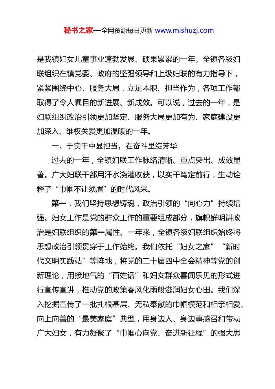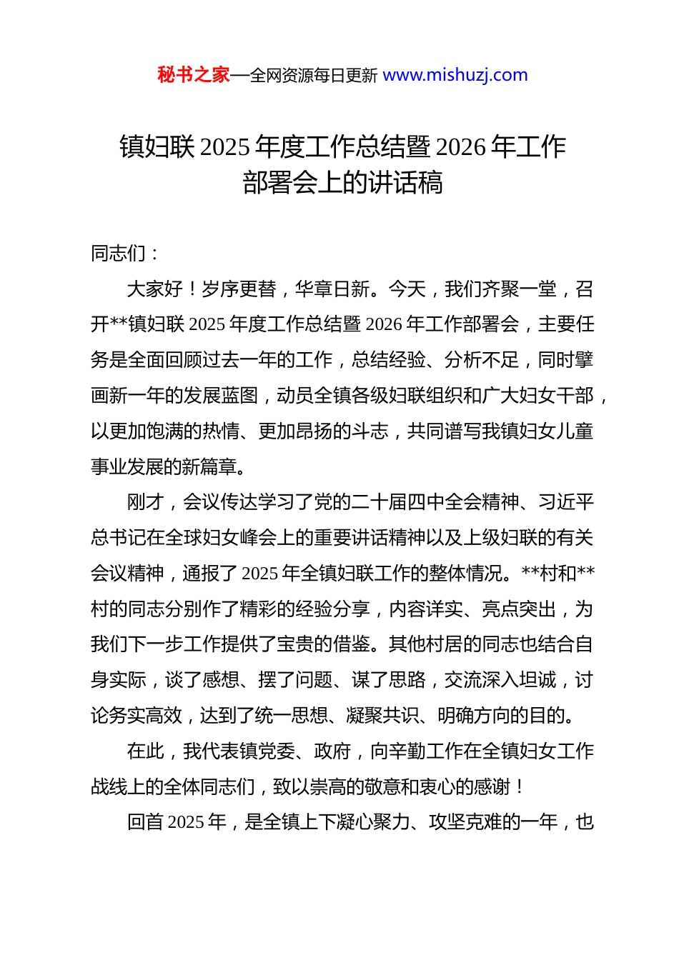 秘书之家—全网资源每日更新 www.mishuzj.com镇妇联 2025 年度工作总结暨 2026 年工作部署会上的讲话稿 同志们:大家好!岁序更替,华章日新。今天,我们齐聚一堂,召开**镇妇联 2025 年度工作总结暨 2026 年工作部署会,主要任务是全面回顾过去一年的工作,总结经验、分析不足,同时擘画新一年的发展蓝图,动员全镇各级妇联组织和广大妇女干部,以更加饱满的热情、更加昂扬的斗志,共同谱写我镇妇女儿童事业发展的新篇章。刚才,会议传达学习了党的二十届四中全会精神、习近平总书记在全球妇女峰会上的重要讲话精神以及上级妇联的有关会议精神,通报了 2025 年全镇妇联工作的整体情况。**村和**村的同志分别作了精彩的经验分享,内容详实、亮点突出,为我们下一步工作提供了宝贵的借鉴。其他村居的同志也结合自身实际,谈了感想、摆了问题、谋了思路,交流深入坦诚,讨论务实高效,达到了统一思想、凝聚共识、明确方向的目的。在此,我代表镇党委、政府,向辛勤工作在全镇妇女工作战线上的全体同志们,致以崇高的敬意和衷心的感谢!回首 2025 年,是全镇上下凝心聚力、攻坚克难的一年,也秘书之家—全网资源每日更新 www.mishuzj.com是我镇妇女儿童事业蓬勃发展、硕果累累的一年。全镇各级妇联组织在镇党委、政府的坚强领导和上级妇联的有力指导下,紧紧围绕中心、服务大局,立足本职、担当作为,各项工作都取得了令人瞩目的新进展、新成效。可以说,过去的一年,是妇联组织政治引领更加坚定、服务大局更加有为、家庭建设更加深入、维权关爱更加温暖的一年。一、于实干中显担当,在奋斗里绽芳华过去的一年,全镇妇联工作脉络清晰、重点突出、成效显著。广大妇联干部用汗水浇灌收获,以实干笃定前行,生动诠释了“巾帼不让须眉”的时代风采。第一,我们坚持思想铸魂,政治引领的“向心力”持续增强。妇女工作是党的群众工作的重要组成部分,旗帜鲜明讲政治是妇联组织的第一属性。一年来,全镇各级妇联组织始终将思想政治引领贯穿于工作始终。我们依托“妇女之家”“新时代文明实践站”等阵地,将党的二十届四中全会精神等党的创新理论,用接地气的“百姓话”和妇女群众喜闻乐见的形式进行宣传宣讲,推动党的政策春风化雨般滋润妇女心田。我们深入挖掘宣传了一批扎根基层、无私奉献的巾帼模范和相亲相爱、向上向善的“最美家庭”典型,用身边人、身边事感召和带动广大妇女,有力凝聚了“巾帼心向党、奋进新征程”的强大思秘书之家—全网资源每日更新 www.mishuzj.com想合力,确保了妇联工作始终沿着正确的政治方向前进。第二,我们坚持服务大局,助力发展的“贡献力”持续彰显。全镇各级妇联组织和广大妇女同胞,始终是推动我镇经济社会发展不可或缺的重要力量。特别是在推进乡村振兴的伟大实践中,妇联组织积极作为,成效斐然。以“美丽庭院”创建工作为例,我们不仅仅是把它作为一项改善人居环境的任务来抓,更是将其作为激发妇女内生动力、促进乡风文明建设、赋能乡村产业发展的重要载体。通过广泛宣传动员,充分发挥妇女在家庭中的独特作用,调动了家家户户参与庭院美化、环境整治的主动性和创造性。**村妇联在这方面就作出了很好的表率,她们不仅在“美”字上做文章,更在“用”字上下功夫,积极探索“美丽庭院+”的融合发展新模式,引导有条件的家庭依托洁净雅致的庭院发展特色餐饮、精品民宿等新业态,既扮靓了“面子”又充实了“里子”,实现了环境提升与群众增收的良性互动。据统计,自 2021 年至 2025 年,全镇累计打造了市级“美丽庭院”示范户 258 户、省级示范户 93 户,这些星罗棋布的美丽庭院,已成为我镇乡村振兴画卷上一道道亮丽的风景线。第三,我们坚持立德树人,家庭建设的“凝聚力”持续提升。家庭是社会的基本细胞,家庭的前途命运同国家和民族的秘书之家—全网资源每日更新 www.mishuzj.com前途命运紧密相连。一年来,我们始终将家庭工作作为一项基础性、长期性工程来抓。有的村妇联聚焦当前家庭教育中存在的痛点难点,创造性地深化家校社协同育人模式,依托家长学校主阵地,针对不同年龄段孩子的成长特点,量身定制分层分类的课程...
