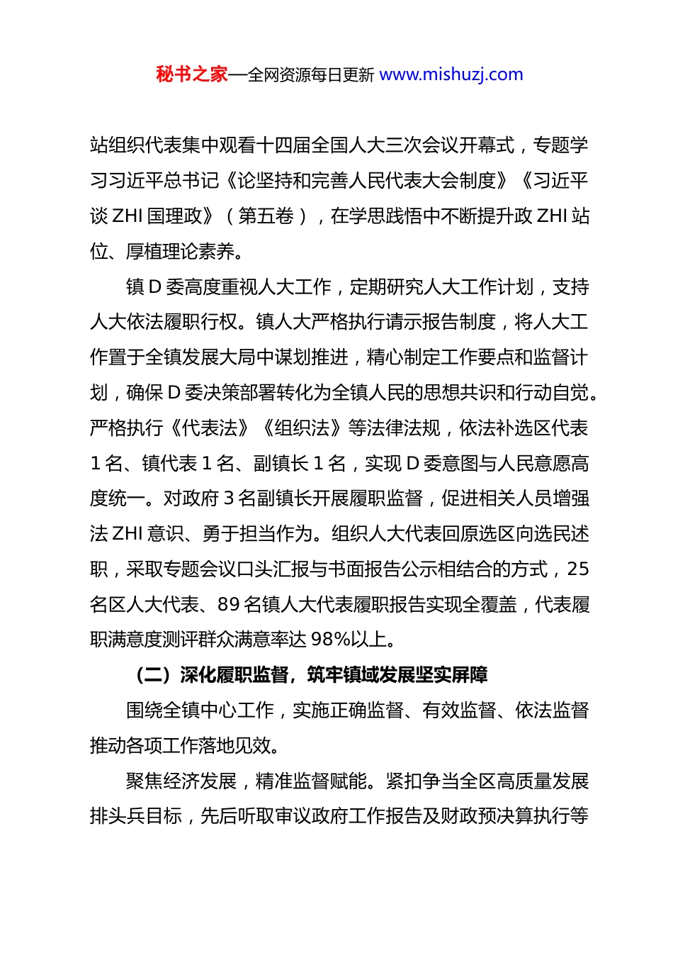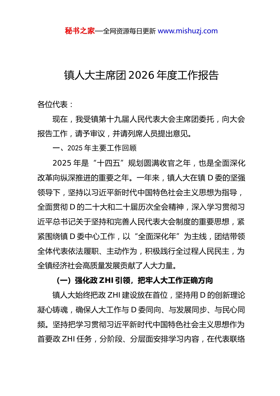 秘书之家—全网资源每日更新 www.mishuzj.com镇人大主席团 2026 年度工作报告各位代表:现在,我受镇第十九届人民代表大会主席团委托,向大会报告工作,请予审议,并请列席人员提出意见。一、2025 年主要工作回顾2025 年是“十四五”规划圆满收官之年,也是全面深化改革向纵深推进的重要之年。一年来,镇人大在镇 D 委的坚强领导下,坚持以习近平新时代中国特色社会主义思想为指导,全面贯彻 D 的二十大和二十届历次全会精神,深入学习贯彻习近平总书记关于坚持和完善人民代表大会制度的重要思想,紧紧围绕镇 D 委中心工作,以“全面深化年”为主线,团结带领全体代表依法履职、主动作为,积极践行全过程人民民主,为全镇经济社会高质量发展贡献了人大力量。(一)强化政 ZHI 引领,把牢人大工作正确方向镇人大始终把政 ZHI 建设放在首位,坚持用 D 的创新理论凝心铸魂,确保人大工作与 D 委同向、与发展同步、与民心同频。坚持把学习贯彻习近平新时代中国特色社会主义思想作为首要政 ZHI 任务,分阶段、分层面安排学习内容,在代表联络秘书之家—全网资源每日更新 www.mishuzj.com站组织代表集中观看十四届全国人大三次会议开幕式,专题学习习近平总书记《论坚持和完善人民代表大会制度》《习近平谈 ZHI 国理政》(第五卷),在学思践悟中不断提升政 ZHI 站位、厚植理论素养。镇 D 委高度重视人大工作,定期研究人大工作计划,支持人大依法履职行权。镇人大严格执行请示报告制度,将人大工作置于全镇发展大局中谋划推进,精心制定工作要点和监督计划,确保 D 委决策部署转化为全镇人民的思想共识和行动自觉。严格执行《代表法》《组织法》等法律法规,依法补选区代表1 名、镇代表 1 名、副镇长 1 名,实现 D 委意图与人民意愿高度统一。对政府 3 名副镇长开展履职监督,促进相关人员增强法 ZHI 意识、勇于担当作为。组织人大代表回原选区向选民述职,采取专题会议口头汇报与书面报告公示相结合的方式,25名区人大代表、89 名镇人大代表履职报告实现全覆盖,代表履职满意度测评群众满意率达 98%以上。(二)深化履职监督,筑牢镇域发展坚实屏障围绕全镇中心工作,实施正确监督、有效监督、依法监督推动各项工作落地见效。聚焦经济发展,精准监督赋能。紧扣争当全区高质量发展排头兵目标,先后听取审议政府工作报告及财政预决算执行等秘书之家—全网资源每日更新 www.mishuzj.com专项报告,支持和督促政府加强经济运行监测和调度,提高发展质效。首次听取审议镇国有和集体资产管理情况的报告,有力促进国有和集体资产管理水平持续提升。组织代表现场视察、召开座谈,开展项目全过程监督,推动**特种罐式储运项目正式投产、**省重大项目开工建设,助推解决堵点难点问题 4 项,服务好项目建设的“最后一公里”。组织经济发展组代表深入龙头企业、专精特新企业开展“沉浸式”调研,构建“企业视角+人大监督+政府施策”协作机制,帮助企业解难题、促发展。召开“企业家日”座谈会、开展“部门进家”活动,主动搭建政企沟通桥梁,精准对接企业需求。聚焦民生福祉,精准监督惠民。牢牢把握以人民为中心的价值取向,有效回应人民群众对美好生活的向往。围绕民生实事项目,形成人大代表常态化监督、纪检监察机关联合式监督、群众参与式监督的三维联动监督体系,对**安置房建设、**河环境提升、农贸市场改造升级等 8 项区镇两级重点民生项目开展监督检查,以全程化、立体化监督推动实事落地见效。围绕《农产品质量安全法》贯彻实施,联合农办、市场监管等职能部门深入大棚种植基地、农贸市场、食品加工企业,重点排查农产品检测、食品加工全流程等关键环节风险隐患,切实守护人民群众“舌尖上的安全”。专题听取审议生态环境质量状况秘书之家—全网资源每日更新 www.mishuzj.com及年度目标任务完成情况报告,聚焦人居环境、教育医疗、养老服务等群众重点关注领域,组织集中视察和跟踪问效,持续增强群众的获得感、幸福感、安全感。聚焦社会 ZHI 理,精准监督护航。深入贯彻习近平法 ZHI思想,充分发挥人大在全面依法 ZHI 国中的职能作...