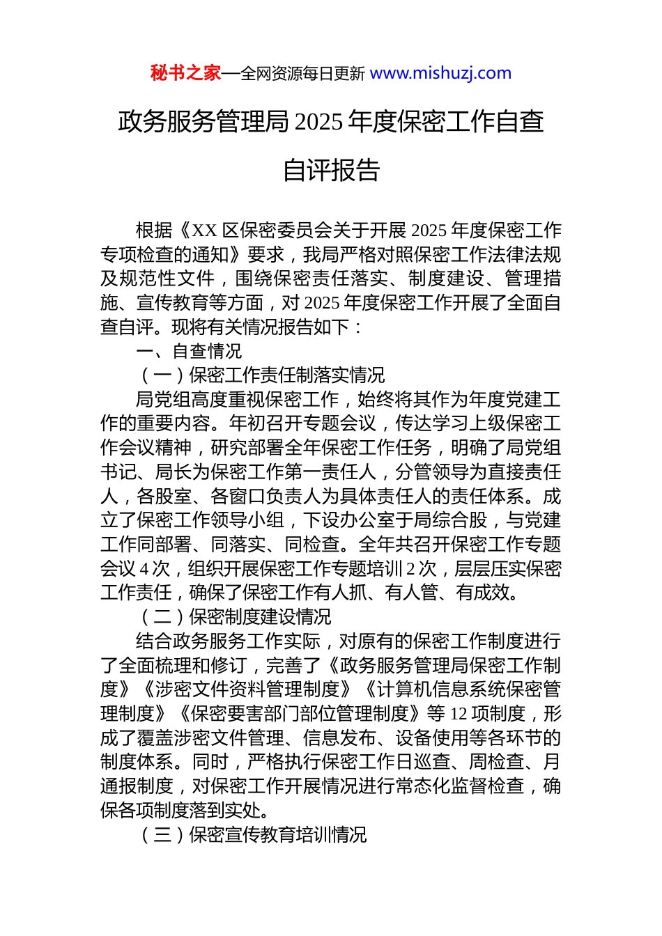 秘书之家—全网资源每日更新 www.mishuzj.com政务服务管理局 2025 年度保密工作自查自评报告根据《XX 区保密委员会关于开展 2025 年度保密工作专项检查的通知》要求,我局严格对照保密工作法律法规及规范性文件,围绕保密责任落实、制度建设、管理措施、宣传教育等方面,对 2025 年度保密工作开展了全面自查自评。现将有关情况报告如下:一、自查情况(一)保密工作责任制落实情况局党组高度重视保密工作,始终将其作为年度党建工作的重要内容。年初召开专题会议,传达学习上级保密工作会议精神,研究部署全年保密工作任务,明确了局党组书记、局长为保密工作第一责任人,分管领导为直接责任人,各股室、各窗口负责人为具体责任人的责任体系。成立了保密工作领导小组,下设办公室于局综合股,与党建工作同部署、同落实、同检查。全年共召开保密工作专题会议 4 次,组织开展保密工作专题培训 2 次,层层压实保密工作责任,确保了保密工作有人抓、有人管、有成效。(二)保密制度建设情况结合政务服务工作实际,对原有的保密工作制度进行了全面梳理和修订,完善了《政务服务管理局保密工作制度》《涉密文件资料管理制度》《计算机信息系统保密管理制度》《保密要害部门部位管理制度》等 12 项制度,形成了覆盖涉密文件管理、信息发布、设备使用等各环节的制度体系。同时,严格执行保密工作日巡查、周检查、月通报制度,对保密工作开展情况进行常态化监督检查,确保各项制度落到实处。(三)保密宣传教育培训情况秘书之家—全网资源每日更新 www.mishuzj.com将保密宣传教育纳入年度党员干部教育培训计划,组织全体干部职工开展保密知识学习培训。全年共组织集中保密宣传教育活动 6 次,专题学习培训 4 次,覆盖干部职工120 余人次。通过学习《保密法》《密码法》《中华人民共和国保守国家秘密法实施条例》等法律法规,观看保密警示教育片,通报典型泄密案例等形式,切实增强了干部职工的保密意识和防范能力。(四)涉密人员管理情况对全局涉密人员进行了全面梳理登记,建立了涉密人员管理台账,实行动态管理。全年共确定涉密人员 XX 名,其中核心涉密人员 XX 名、一般涉密人员 XX 名。严格执行涉密人员上岗前培训、在岗期间教育、离岗脱密等管理制度,对涉密人员的岗位变动、职务调整等情况及时进行更新备案,确保了涉密人员管理规范有序。(五)涉密文件资料管理情况严格执行涉密文件资料登记、传阅、借阅、销毁全流程管理制度,建立了涉密文件资料管理台账,做到专人管理、专柜存放。全年共接收、传阅、管理涉密文件 XX 份,未发生涉密文件丢失、泄露、擅自复制、擅自销毁等情况。对涉密文件资料的销毁,严格履行审批手续,由两人以上共同负责,并进行登记留痕,确保了涉密文件资料管理安全规范。(六)涉密计算机及信息系统管理情况严格执行涉密计算机与非涉密计算机物理隔离制度,严禁在非涉密计算机中存储、处理涉密信息。对全局计算机信息系统进行了全面排查,未发现违规外联、违规存储涉密信息等情况。加强对政务服务信息系统的安全管理,定期开展安全漏洞扫描和风险隐患排查,升级杀毒软件,更新安全补丁,确保了信息系统安全运行。(七)保密要害部门部位管理情况对保密要害部门部位进行了全面排查和规范管理,明秘书之家—全网资源每日更新 www.mishuzj.com确了保密要害部门部位范围,设置了明显的保密警示标识,配备了必要的保密防护设施。严格执行保密要害部门部位出入登记、定期检查制度,全年共开展保密要害部门部位专项检查 XX 次,未发现泄密隐患和安全漏洞。(八)其他方面情况在政务公开和信息发布方面,严格执行信息发布保密审查制度,坚持“谁发布、谁负责,先审查、后发布”,全年共发布政务信息 XX 条,未发生泄密情况。在保密设备管理方面,配备了保密柜、碎纸机等设备,定期进行维护保养,确保设备正常运行。二、存在的主要问题对照上级保密工作要求,通过自查自评,我局保密工作虽取得了一定成效,但仍存在一些不足和薄弱环节,主要表现在:(一)保密意识有待进一步强化部分干部职工对保密工作的重要性认识不足,存在“重...