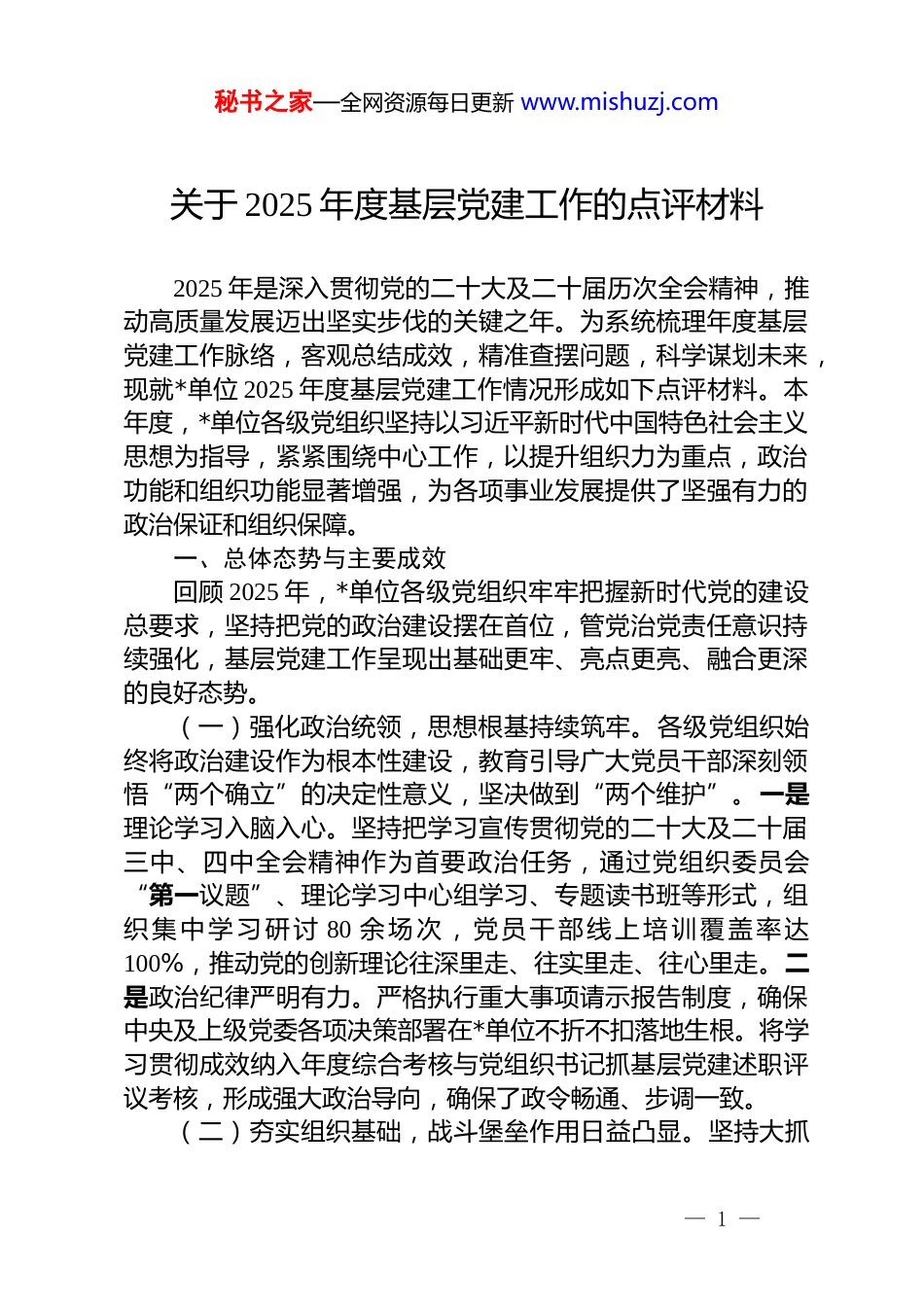 秘书之家—全网资源每日更新 www.mishuzj.com关于 2025 年度基层党建工作的点评材料2025 年是深入贯彻党的二十大及二十届历次全会精神,推动高质量发展迈出坚实步伐的关键之年。为系统梳理年度基层党建工作脉络,客观总结成效,精准查摆问题,科学谋划未来,现就*单位 2025 年度基层党建工作情况形成如下点评材料。本年度,*单位各级党组织坚持以习近平新时代中国特色社会主义思想为指导,紧紧围绕中心工作,以提升组织力为重点,政治功能和组织功能显著增强,为各项事业发展提供了坚强有力的政治保证和组织保障。一、总体态势与主要成效回顾 2025 年,*单位各级党组织牢牢把握新时代党的建设总要求,坚持把党的政治建设摆在首位,管党治党责任意识持续强化,基层党建工作呈现出基础更牢、亮点更亮、融合更深的良好态势。(一)强化政治统领,思想根基持续筑牢。各级党组织始终将政治建设作为根本性建设,教育引导广大党员干部深刻领悟“两个确立”的决定性意义,坚决做到“两个维护”。一是理论学习入脑入心。坚持把学习宣传贯彻党的二十大及二十届三中、四中全会精神作为首要政治任务,通过党组织委员会“第一议题”、理论学习中心组学习、专题读书班等形式,组织集中学习研讨 80 余场次,党员干部线上培训覆盖率达100%,推动党的创新理论往深里走、往实里走、往心里走。二是政治纪律严明有力。严格执行重大事项请示报告制度,确保中央及上级党委各项决策部署在*单位不折不扣落地生根。将学习贯彻成效纳入年度综合考核与党组织书记抓基层党建述职评议考核,形成强大政治导向,确保了政令畅通、步调一致。(二)夯实组织基础,战斗堡垒作用日益凸显。坚持大抓— 1 —秘书之家—全网资源每日更新 www.mishuzj.com基层的鲜明导向,以系统化思维推进基层组织建设,组织体系的“神经末梢”被有效激活。一是组织生活规范提质。严格落实“三会一课”、民主评议党员、谈心谈话等基本制度,全年各基层党支部累计召开党员大会超过 120 次,开展主题党日活动超过 350 次。通过开展重温入党誓词、过“政治生日”、参观红色教育基地等活动,党内政治生活的政治性、时代性、原则性、战斗性显著增强,党员的身份认同感和组织归属感不断提升。二是党员先锋作用彰显。通过设立“党员先锋岗”、组建“党员突击队”等方式,引导党员在*项目建设、技术攻关、服务群众等一线工作中亮身份、当先锋、作表率。在今年的*区域应急抢险任务中,党员干部冲锋在前,发挥了关键作用,密切了党群干群关系,赢得了群众的广泛赞誉。(三)聚焦突出问题,专项整治行动精准有效。坚持问题导向,以钉钉子精神抓好基层党建突出问题整治,推动基层党组织全面进步、全面过硬。一是靶向施策补齐短板。聚焦基层党建“灯下黑”、党建与业务“两张皮”等顽瘴痼疾,深入开展调查研究,全面梳理形成问题清单,共查摆出 5 大方面 28 项具体问题,并逐一明确整改措施与时限。对标*地区先进单位的经验做法,组织开展对标提升行动,已完成整改 25 项,整改完成率近 90%。二是精准整顿软弱涣散。针对个别战斗力不强、服务功能弱化的党支部,严格按照“一支部一策”原则,由上级党组织班子成员挂点联系,从建强班子、完善制度、保障经费、优化服务等方面综合施策,成功推动 2 个后进党支部实现转化升级,基层基础得到进一步巩固。二、存在问题与根源剖析在肯定成绩的同时,我们必须清醒地看到,对标新时代党的建设总要求和高质量发展的新期盼,*单位的基层党建工作仍存在一些不容忽视的短板和弱项,必须高度重视,深入剖析,切实加以解决。— 2 —秘书之家—全网资源每日更新 www.mishuzj.com(一)责任传导存在“温差”,压力层层递减现象待解。少数党组织书记对“抓好党建是最大政绩”的理念认识不到位,履行“第一责任人”职责存在偏差,对党建工作投入精力不足,存在“说起来重要、做起来次要、忙起来不要”的现象。部分班子成员“一岗双责”意识不强,习惯于将党建工作视为党务干部的事,未能有效推动党建工作与分管业务工作深度融合。这种责任压力的逐级衰减,导致上级党组织的部署要求在“最后一...