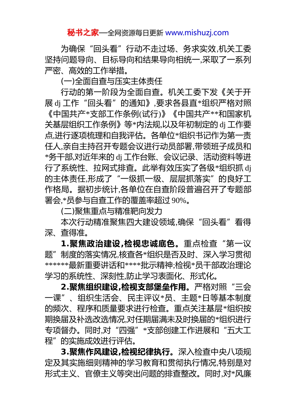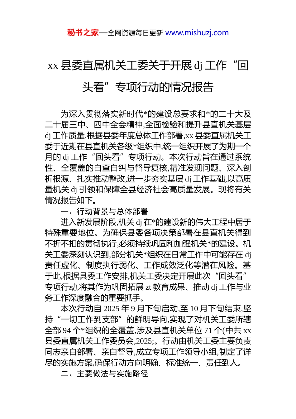 秘书之家—全网资源每日更新 www.mishuzj.comxx 县委直属机关工委关于开展 dj 工作“回头看”专项行动的情况报告为深入贯彻落实新时代*的建设总要求和*的二十大及二十届三中、四中全会精神,全面检验和提升县直机关基层dj 工作质量,根据县委年度总体工作部署,xx 县委直属机关工委于近期在县直机关各级*组织中,统一组织开展了为期一个月的 dj 工作“回头看”专项行动。本次行动旨在通过系统性、全覆盖的自查自纠与督导复核,精准发现问题、深入剖析根源、扎实推动整改,进一步夯实基层 dj 工作基础,以高质量机关 dj 引领和保障全县经济社会高质量发展。现将有关情况报告如下。一、行动背景与总体部署进入新发展阶段,机关 dj 在*的建设新的伟大工程中居于特殊重要地位。为确保县委各项决策部署在县直机关得到不折不扣的贯彻执行,必须持续巩固和加强机关*的建设。机关工委深刻认识到,部分机关*组织在日常工作中可能存在 dj责任虚化、制度执行弱化、工作成效泛化等潜在风险。基于此,根据县委工作安排,机关工委决定开展此次“回头看”专项行动,将其作为巩固拓展 zt 教育成果、推动 dj 工作与业务工作深度融合的重要抓手。本次行动自 2025 年 9 月下旬启动,至 10 月下旬结束,坚持“一切工作到支部”的鲜明导向,实现了对机关工委所辖全部 94 个*组织的全覆盖,涉及县直机关单位 71 个(中共 xx县委直属机关工作委员会,2025;。行动由机关工委主要负责同志亲自部署、亲自督导,成立专项工作领导小组,制定了详尽的实施方案,确保行动方向明确、标准统一、责任到人。二、主要做法与实施路径秘书之家—全网资源每日更新 www.mishuzj.com为确保“回头看”行动不走过场、务求实效,机关工委坚持问题导向、目标导向和结果导向相统一,采取了一系列严密、高效的工作举措。(一)全面自查与压实主体责任行动的第一阶段为全面自查。机关工委下发《关于开展 dj 工作“回头看”的通知》,要求各县直*组织严格对照《中国共产*支部工作条例(试行)》《中国共产**和国家机关基层组织工作条例》等*内法规,以及年初制定的 dj 工作要点,进行逐项梳理和自我评估。各单位*组织书记作为第一责任人,亲自主持召开专题会议进行动员部署,带领班子成员和*务干部,对近年来的 dj 工作台账、会议记录、活动资料等进行了系统性、拉网式排查。此举有效压实了各级*组织抓 dj的主体责任,形成了“一级抓一级、层层抓落实”的良好工作格局。据初步统计,各单位在自查阶段普遍召开了专题部署会,*员参与自查工作的覆盖率超过 90%。(二)聚焦重点与精准靶向发力本次行动精准聚焦四大建设领域,确保“回头看”看得深、查得准。1.聚焦政治建设,检视忠诚底色。重点检查“第一议题”制度的落实情况,核查各*组织是否及时、深入学习贯彻******最新重要讲话和****批示精神;检视*员干部政治理论学习的系统性、深刻性,防止学习表面化、形式化。2.聚焦组织建设,检视支部堡垒作用。严格对照“三会一课”、组织生活会、民主评议*员、主题*日等基本制度的频次、程序和质量要求进行检查。重点关注基层*组织按期换届及补选改选情况,对任期届满未及时换届的*组织进行专项督办。同时,对“四强”*支部创建工作进展和“五大工程”的实施成效进行评估。3.聚焦作风建设,检视纪律执行。深入检查中央八项规定及其实施细则精神的学习教育和贯彻执行情况,特别是对形式主义、官僚主义等突出问题的排查整改。同时,对*风廉秘书之家—全网资源每日更新 www.mishuzj.com政建设责任制的落实情况进行复核,确保压力传导到位。4.聚焦队伍建设,检视*员先锋模范作用。重点检视*员教育管理、发展*员工作的规范性,以及*员在中心工作、重大任务中发挥作用的情况。(三)线上线下与联动协同推进机关工委综合运用多种方式,加强对“回头看”行动的全程指导和动态监督。今年以来,先后召开工作安排部署会议 1 次,工委委员专题会议 2 次,研究推进 dj 重点工作。行动期间,通过“xx 智慧 dj”app 后台数据进行线上调度,利用微信工作群发布工作提示信息 7 条,并针对重要节点下发工作提醒函 4 份,实现了对各单位自查进度的实时跟踪。同时,组织开...