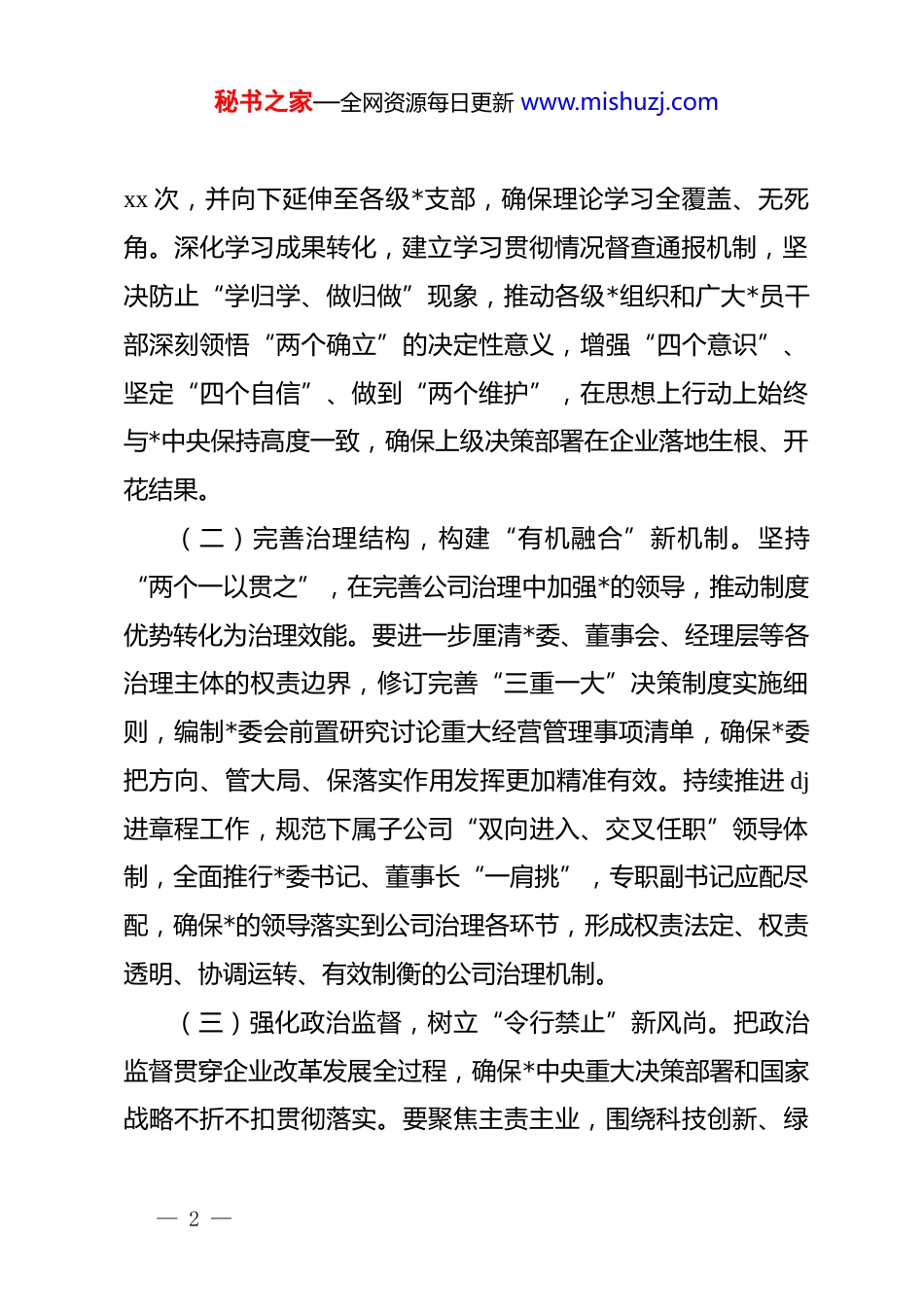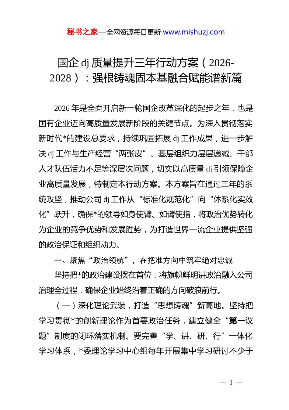 秘书之家—全网资源每日更新 www.mishuzj.com国企 dj 质量提升三年行动方案(2026-2028):强根铸魂固本基融合赋能谱新篇2026 年是全面开启新一轮国企改革深化的起步之年,也是国有企业迈向高质量发展新阶段的关键节点。为深入贯彻落实新时代*的建设总要求,持续巩固拓展 dj 工作成果,进一步解决 dj 工作与生产经营“两张皮”、基层组织力层层递减、干部人才队伍活力不足等深层次问题,切实以高质量 dj 引领保障企业高质量发展,特制定本行动方案。本方案旨在通过三年的系统攻坚,推动公司 dj 工作从“标准化规范化”向“体系化实效化”跃升,确保*的领导如身使臂、如臂使指,将政治优势转化为企业的竞争优势和发展胜势,为打造世界一流企业提供坚强的政治保证和组织动力。一、聚焦“政治领航”,在把准方向中筑牢绝对忠诚坚持把*的政治建设摆在首位,将旗帜鲜明讲政治融入公司治理全过程,确保企业始终沿着正确的方向破浪前行。(一)深化理论武装,打造“思想铸魂”新高地。坚持把学习贯彻*的创新理论作为首要政治任务,建立健全“第一议题”制度的闭环落实机制。要完善“学、讲、研、行”一体化学习体系,*委理论学习中心组每年开展集中学习研讨不少于— 1 —秘书之家—全网资源每日更新 www.mishuzj.comxx 次,并向下延伸至各级*支部,确保理论学习全覆盖、无死角。深化学习成果转化,建立学习贯彻情况督查通报机制,坚决防止“学归学、做归做”现象,推动各级*组织和广大*员干部深刻领悟“两个确立”的决定性意义,增强“四个意识”、坚定“四个自信”、做到“两个维护”,在思想上行动上始终与*中央保持高度一致,确保上级决策部署在企业落地生根、开花结果。(二)完善治理结构,构建“有机融合”新机制。坚持“两个一以贯之”,在完善公司治理中加强*的领导,推动制度优势转化为治理效能。要进一步厘清*委、董事会、经理层等各治理主体的权责边界,修订完善“三重一大”决策制度实施细则,编制*委会前置研究讨论重大经营管理事项清单,确保*委把方向、管大局、保落实作用发挥更加精准有效。持续推进 dj进章程工作,规范下属子公司“双向进入、交叉任职”领导体制,全面推行*委书记、董事长“一肩挑”,专职副书记应配尽配,确保*的领导落实到公司治理各环节,形成权责法定、权责透明、协调运转、有效制衡的公司治理机制。(三)强化政治监督,树立“令行禁止”新风尚。把政治监督贯穿企业改革发展全过程,确保*中央重大决策部署和国家战略不折不扣贯彻落实。要聚焦主责主业,围绕科技创新、绿— 2 —秘书之家—全网资源每日更新 www.mishuzj.com色低碳转型、重大项目建设等核心任务,建立政治监督台账,实行清单化管理、项目化推进、节点化考核。开展贯彻落实**********批示精神“回头看”工作,健全“发现问题、严明纪律、整改纠偏、深化治理”的工作闭环,坚决纠正上有政策、下有对策,有令不行、有禁不止的行为,确保企业发展始终服从服务于国家战略大局,在关键时刻拉得出、冲得上、打得赢。二、聚焦“强基提质”,在织密体系中锻造战斗堡垒坚持大抓基层的鲜明导向,严密*的组织体系,推动基层*组织全面进步、全面过硬,让*的旗帜在每一个基层阵地高高飘扬。(一)严密组织体系,实现“有形有效”全覆盖。适应企业产权关系、组织架构、管理模式和用工方式的变化,动态调整和设置基层*组织。要按照“四同步、四对接”要求,确保新成立机构、新上马项目、新并购企业同步建立*组织,消除dj“空白点”和“盲区”。特别是要针对海外项目、混合所有制企业、异地分支机构等特殊领域,创新*组织设置形式和活动方式,探索开展“互联网+dj”,依托数字化平台打破时空限制,确保业务发展到哪里、*的建设就跟进到哪里、*支部的战斗堡垒作用就体现在哪里,实现*的组织和工作从“有形覆盖”向“有效覆盖”转变。— 3 —秘书之家—全网资源每日更新 www.mishuzj.com(二)建强支部堡垒,推动“标准化规范化”再升级。持续深化*支部标准化规范化建设,实施*支部建设提质工程。要严格执行《中国共产*国有企业基层组织工作条例(试行)》,规范“三会一课”、主...
