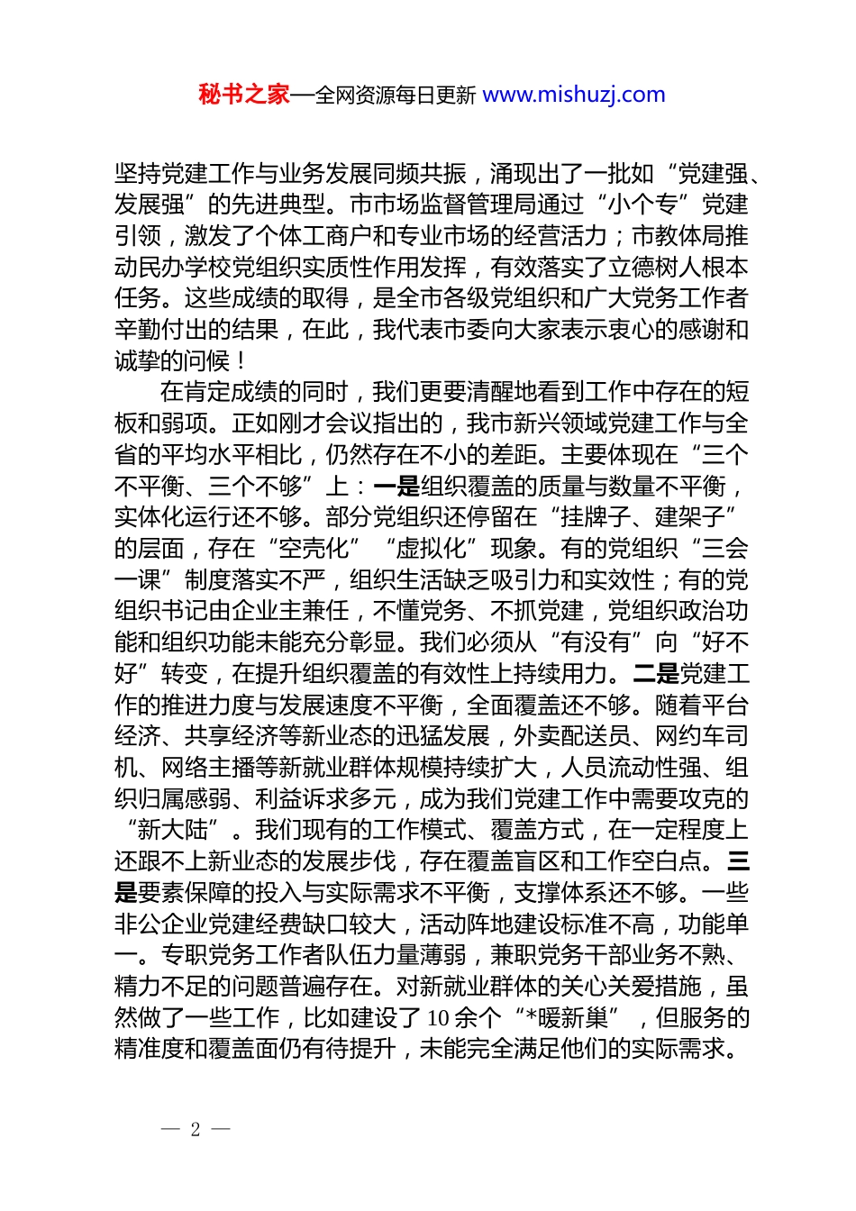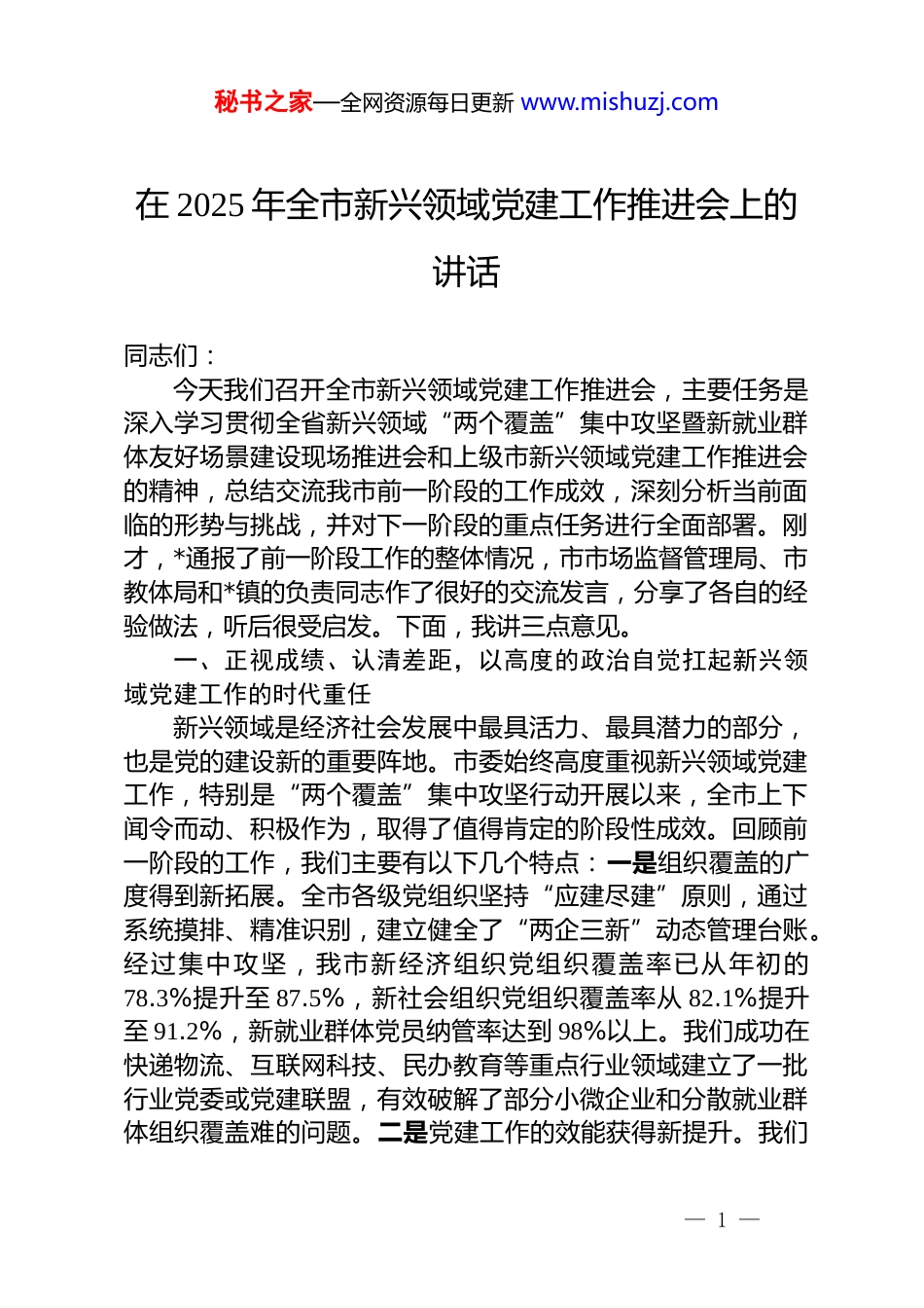 秘书之家—全网资源每日更新 www.mishuzj.com在 2025 年全市新兴领域党建工作推进会上的讲话同志们:今天我们召开全市新兴领域党建工作推进会,主要任务是深入学习贯彻全省新兴领域“两个覆盖”集中攻坚暨新就业群体友好场景建设现场推进会和上级市新兴领域党建工作推进会的精神,总结交流我市前一阶段的工作成效,深刻分析当前面临的形势与挑战,并对下一阶段的重点任务进行全面部署。刚才,*通报了前一阶段工作的整体情况,市市场监督管理局、市教体局和*镇的负责同志作了很好的交流发言,分享了各自的经验做法,听后很受启发。下面,我讲三点意见。一、正视成绩、认清差距,以高度的政治自觉扛起新兴领域党建工作的时代重任新兴领域是经济社会发展中最具活力、最具潜力的部分,也是党的建设新的重要阵地。市委始终高度重视新兴领域党建工作,特别是“两个覆盖”集中攻坚行动开展以来,全市上下闻令而动、积极作为,取得了值得肯定的阶段性成效。回顾前一阶段的工作,我们主要有以下几个特点:一是组织覆盖的广度得到新拓展。全市各级党组织坚持“应建尽建”原则,通过系统摸排、精准识别,建立健全了“两企三新”动态管理台账。经过集中攻坚,我市新经济组织党组织覆盖率已从年初的78.3%提升至 87.5%,新社会组织党组织覆盖率从 82.1%提升至 91.2%,新就业群体党员纳管率达到 98%以上。我们成功在快递物流、互联网科技、民办教育等重点行业领域建立了一批行业党委或党建联盟,有效破解了部分小微企业和分散就业群体组织覆盖难的问题。二是党建工作的效能获得新提升。我们— 1 —秘书之家—全网资源每日更新 www.mishuzj.com坚持党建工作与业务发展同频共振,涌现出了一批如“党建强、发展强”的先进典型。市市场监督管理局通过“小个专”党建引领,激发了个体工商户和专业市场的经营活力;市教体局推动民办学校党组织实质性作用发挥,有效落实了立德树人根本任务。这些成绩的取得,是全市各级党组织和广大党务工作者辛勤付出的结果,在此,我代表市委向大家表示衷心的感谢和诚挚的问候!在肯定成绩的同时,我们更要清醒地看到工作中存在的短板和弱项。正如刚才会议指出的,我市新兴领域党建工作与全省的平均水平相比,仍然存在不小的差距。主要体现在“三个不平衡、三个不够”上:一是组织覆盖的质量与数量不平衡,实体化运行还不够。部分党组织还停留在“挂牌子、建架子”的层面,存在“空壳化”“虚拟化”现象。有的党组织“三会一课”制度落实不严,组织生活缺乏吸引力和实效性;有的党组织书记由企业主兼任,不懂党务、不抓党建,党组织政治功能和组织功能未能充分彰显。我们必须从“有没有”向“好不好”转变,在提升组织覆盖的有效性上持续用力。二是党建工作的推进力度与发展速度不平衡,全面覆盖还不够。随着平台经济、共享经济等新业态的迅猛发展,外卖配送员、网约车司机、网络主播等新就业群体规模持续扩大,人员流动性强、组织归属感弱、利益诉求多元,成为我们党建工作中需要攻克的“新大陆”。我们现有的工作模式、覆盖方式,在一定程度上还跟不上新业态的发展步伐,存在覆盖盲区和工作空白点。三是要素保障的投入与实际需求不平衡,支撑体系还不够。一些非公企业党建经费缺口较大,活动阵地建设标准不高,功能单一。专职党务工作者队伍力量薄弱,兼职党务干部业务不熟、精力不足的问题普遍存在。对新就业群体的关心关爱措施,虽然做了一些工作,比如建设了 10 余个“*暖新巢”,但服务的精准度和覆盖面仍有待提升,未能完全满足他们的实际需求。— 2 —秘书之家—全网资源每日更新 www.mishuzj.com同志们,这些问题和差距,是挑战也是机遇,是我们下一步工作的主攻方向。习近平总书记强调,“越是情况复杂、基础薄弱的地方,越要健全党的组织、做好党的工作”。新兴领域党建工作是一项具有战略性、全局性意义的政治任务,抓好这项工作,是巩固党的执政根基的必然要求,是推动高质量发展的内在需要,是提升基层治理效能的关键之举。全市各级各部门必须站在战略和全局的高度,深刻认识其极端重要性,以“慢不得”的危机感、“坐不住”的责任感,采...