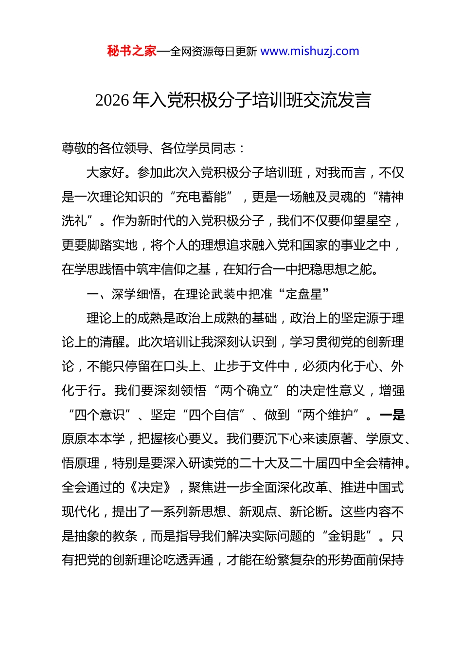 秘书之家—全网资源每日更新 www.mishuzj.com2026 年入党积极分子培训班交流发言 尊敬的各位领导、各位学员同志:大家好。参加此次入党积极分子培训班,对我而言,不仅是一次理论知识的“充电蓄能”,更是一场触及灵魂的“精神洗礼”。作为新时代的入党积极分子,我们不仅要仰望星空,更要脚踏实地,将个人的理想追求融入党和国家的事业之中,在学思践悟中筑牢信仰之基,在知行合一中把稳思想之舵。一、深学细悟,在理论武装中把准“定盘星”理论上的成熟是政治上成熟的基础,政治上的坚定源于理论上的清醒。此次培训让我深刻认识到,学习贯彻党的创新理论,不能只停留在口头上、止步于文件中,必须内化于心、外化于行。我们要深刻领悟“两个确立”的决定性意义,增强“四个意识”、坚定“四个自信”、做到“两个维护”。一是原原本本学,把握核心要义。我们要沉下心来读原著、学原文、悟原理,特别是要深入研读党的二十大及二十届四中全会精神。全会通过的《决定》,聚焦进一步全面深化改革、推进中国式现代化,提出了一系列新思想、新观点、新论断。这些内容不是抽象的教条,而是指导我们解决实际问题的“金钥匙”。只有把党的创新理论吃透弄通,才能在纷繁复杂的形势面前保持秘书之家—全网资源每日更新 www.mishuzj.com政治定力,不迷航、不偏向。二是联系实际学,找准结合点位。学习的目的全在于运用。我们要把理论学习同本职工作紧密结合起来,同解决群众急难愁盼问题紧密结合起来。比如,在基层治理中如何运用“枫桥经验”化解矛盾?在科技创新中如何发挥党员先锋模范作用?这些都是我们需要思考的课题。要把学习成果转化为推动工作的强大动力,让党的创新理论在基层落地生根、开花结果。三是带着问题学,提升思维层次。学习过程就是不断发现问题、分析问题、解决问题的过程。我们要善于运用辩证唯物主义和历史唯物主义的立场观点方法,去观察时代、把握时代、引领时代。面对改革发展中的深层次矛盾,面对人民群众的新期待,我们不能回避退缩,而要敢于直面挑战,用党的科学理论指导实践,破解难题。二、对标对表,在党性修养中锤炼“硬脊梁”党性是党员干部立身、立业、立言、立德的基石。作为一名入党积极分子,虽然尚未正式跨入党的大门,但必须以正式党员的标准严格要求自己,时刻自重自省自警自励。一是坚定理想信念,补足精神之钙。理想信念是共产党人精神上的“钙”,缺钙就会得“软骨病”。在物质生活日益丰富的今天,我们面临的诱惑更多,考验更严峻。我们要时刻牢记入党誓词,不忘初心使命,无论遇到什么困难和挫折,都要坚信共产主义秘书之家—全网资源每日更新 www.mishuzj.com远大理想和中国特色社会主义共同理想。要把对马克思主义的信仰、对中国特色社会主义的信念作为毕生追求,永远信党爱党为党。二是强化宗旨意识,厚植为民情怀。江山就是人民,人民就是江山。我们党来自人民、植根人民、服务人民。我们要始终把人民放在心中最高位置,坚持全心全意为人民服务的根本宗旨。在日常工作中,要多想一想群众需要什么、期盼什么,多做一些暖人心、顺民意的好事实事。要放下架子、扑下身子,走进田间地头,走进社区巷弄,倾听群众呼声,了解群众疾苦,做群众的贴心人。三是严守纪律规矩,筑牢廉洁防线。纪律是党的生命线。我们要认真学习党章党规党纪,知敬畏、存戒惧、守底线。要自觉接受党组织的教育和管理,主动汇报思想动态,虚心听取意见建议。在生活中,要培养健康的生活情趣,净化社交圈、生活圈、朋友圈,保持共产党人的高尚情操和革命气节。要明白“堤溃蚁穴,气泄针芒”的道理,从小事小节上加强修养,防微杜渐,永葆清正廉洁的政治本色。三、实干担当,在奋进征程中当好“排头兵”空谈误国,实干兴邦。所有的理论学习和党性锻炼,最终都要落脚到实际行动上。我们要以昂扬的斗志、务实的作风,在各自岗位上建功立业。一是立足岗位作贡献,争创一流业绩。无论身处哪个行业、哪个岗位,都要发扬工匠精神,干一行、秘书之家—全网资源每日更新 www.mishuzj.com爱一行、钻一行。在工作中,要敢于挑重担、啃硬骨头,勇于攻坚克难。要树立“精品意识”...