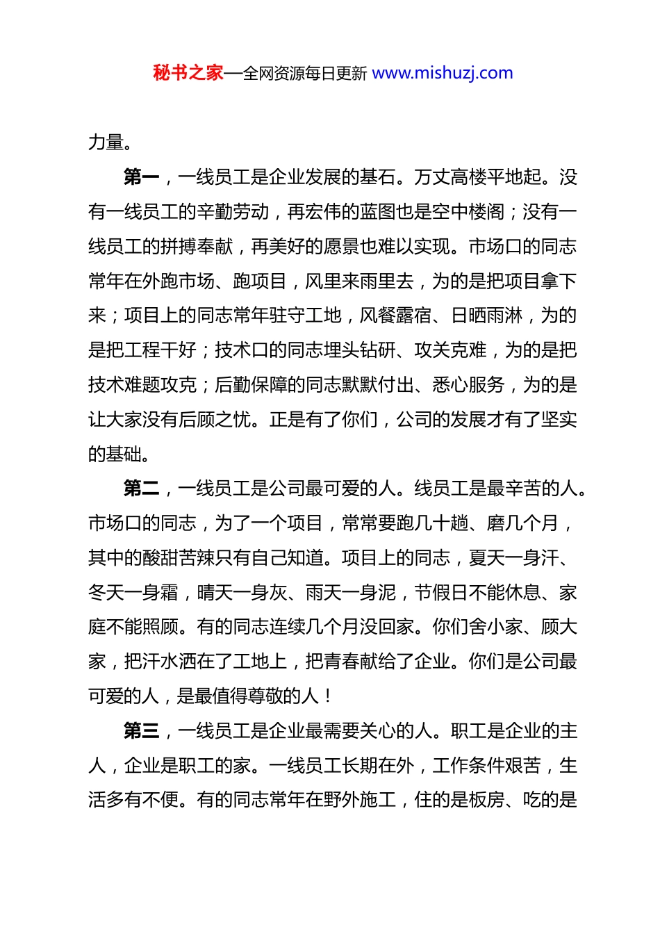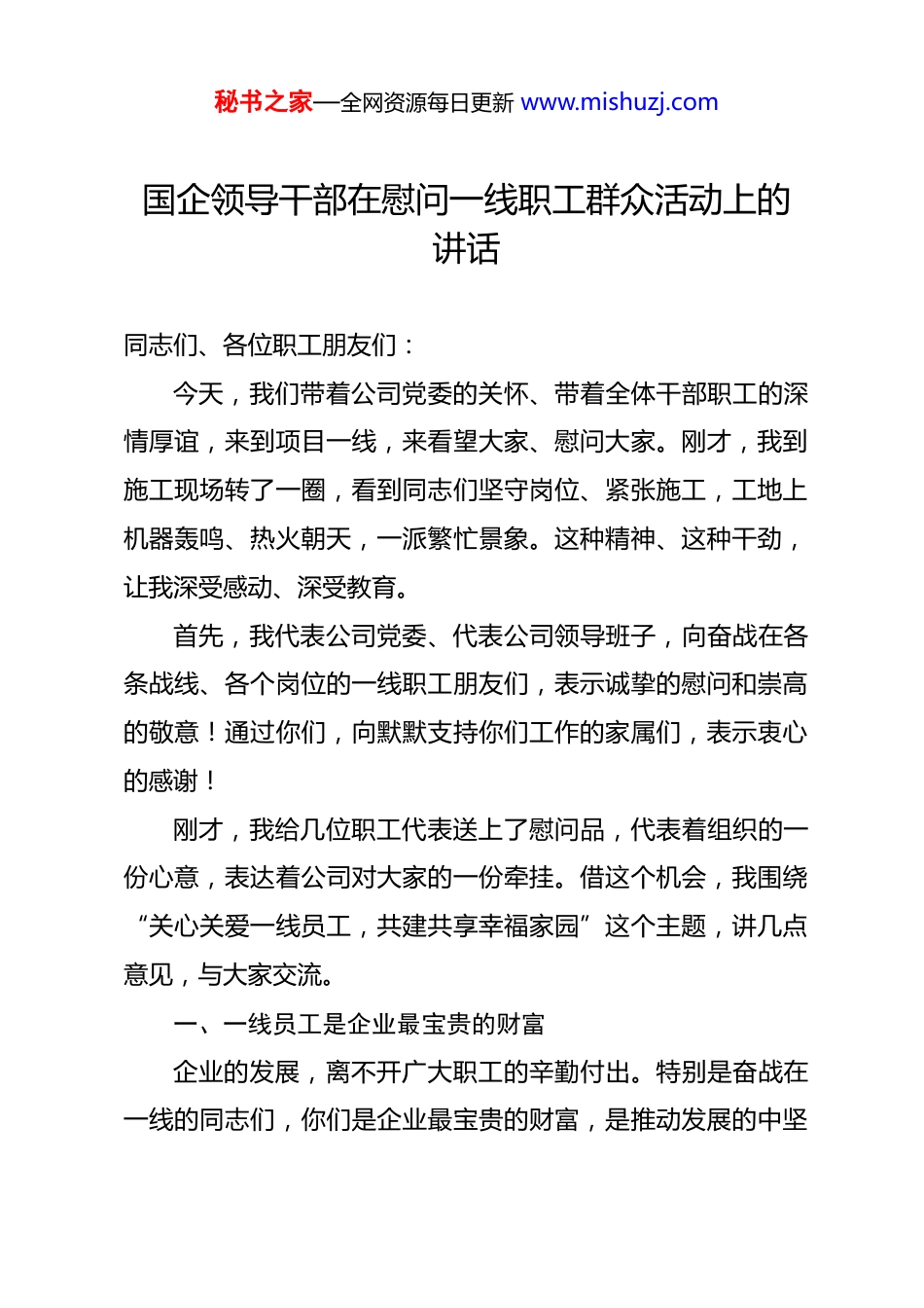 秘书之家—全网资源每日更新 www.mishuzj.com国企领导干部在慰问一线职工群众活动上的讲话 同志们、各位职工朋友们:今天,我们带着公司党委的关怀、带着全体干部职工的深情厚谊,来到项目一线,来看望大家、慰问大家。刚才,我到施工现场转了一圈,看到同志们坚守岗位、紧张施工,工地上机器轰鸣、热火朝天,一派繁忙景象。这种精神、这种干劲,让我深受感动、深受教育。首先,我代表公司党委、代表公司领导班子,向奋战在各条战线、各个岗位的一线职工朋友们,表示诚挚的慰问和崇高的敬意!通过你们,向默默支持你们工作的家属们,表示衷心的感谢!刚才,我给几位职工代表送上了慰问品,代表着组织的一份心意,表达着公司对大家的一份牵挂。借这个机会,我围绕“关心关爱一线员工,共建共享幸福家园”这个主题,讲几点意见,与大家交流。一、一线员工是企业最宝贵的财富企业的发展,离不开广大职工的辛勤付出。特别是奋战在一线的同志们,你们是企业最宝贵的财富,是推动发展的中坚秘书之家—全网资源每日更新 www.mishuzj.com力量。第一,一线员工是企业发展的基石。万丈高楼平地起。没有一线员工的辛勤劳动,再宏伟的蓝图也是空中楼阁;没有一线员工的拼搏奉献,再美好的愿景也难以实现。市场口的同志常年在外跑市场、跑项目,风里来雨里去,为的是把项目拿下来;项目上的同志常年驻守工地,风餐露宿、日晒雨淋,为的是把工程干好;技术口的同志埋头钻研、攻关克难,为的是把技术难题攻克;后勤保障的同志默默付出、悉心服务,为的是让大家没有后顾之忧。正是有了你们,公司的发展才有了坚实的基础。第二,一线员工是公司最可爱的人。线员工是最辛苦的人。市场口的同志,为了一个项目,常常要跑几十趟、磨几个月,其中的酸甜苦辣只有自己知道。项目上的同志,夏天一身汗、冬天一身霜,晴天一身灰、雨天一身泥,节假日不能休息、家庭不能照顾。有的同志连续几个月没回家。你们舍小家、顾大家,把汗水洒在了工地上,把青春献给了企业。你们是公司最可爱的人,是最值得尊敬的人!第三,一线员工是企业最需要关心的人。职工是企业的主人,企业是职工的家。一线员工长期在外,工作条件艰苦,生活多有不便。有的同志常年在野外施工,住的是板房、吃的是秘书之家—全网资源每日更新 www.mishuzj.com食堂,条件简陋;有的同志长期在外跑市场,生活没有规律;有的同志家里有老人需要照顾、有孩子需要陪伴,却常常力不从心。这些困难,组织看在眼里、记在心上。关心关爱一线员工,是企业应尽的责任,也是党委始终放在心上的大事。二、共建共享幸福家园,是公司党委的庄严承诺公司党委始终坚持以职工为中心的发展思想,把职工对美好生活的向往作为奋斗目标,努力为大家创造更好的工作条件、更优的生活环境、更实的发展平台。第一,要让大家工作得更安心。我们将持续改善一线员工的工作条件。在项目上,要配齐必要的劳保用品,做好防暑降温、防寒保暖工作,确保大家安全健康。要改善工地食堂伙食,让大家吃上可口饭。要丰富业余文化生活,配备文体设施,让大家在工作之余能够放松身心。要加强劳动保护,严格落实安全生产责任制,确保大家平平安安上班、安安全全回家。我们将持续完善休息休假制度。合理安排作息时间,科学调配施工力量,尽量让大家劳逸结合。落实好带薪年休假制度,让大家有更多时间陪伴家人。对长期在外工作的同志,要建立轮休机制,让大家有机会回家看看。第二,要让大家生活得更舒心。我们将持续改善一线员工的居住条件。逐步改善项目部驻地环境,让大家住得干净、住秘书之家—全网资源每日更新 www.mishuzj.com得舒适。要重视职工宿舍建设,配备必要的床上用品、生活设施。在条件允许的情况下,探索建设“职工之家”,让大家有家的感觉。我们将持续关注职工身心健康。定期组织健康体检,建立职工健康档案。开展心理健康辅导,帮助大家缓解压力、调整心态。对患病的职工,要及时看望、帮助治疗。对家庭有困难的职工,要建立帮扶机制,及时伸出援手。我们将持续关心职工家庭。对常年在外工作的同志,要建立联系制度,定期了解家庭情况。对留守老人、留守子女,要组织...