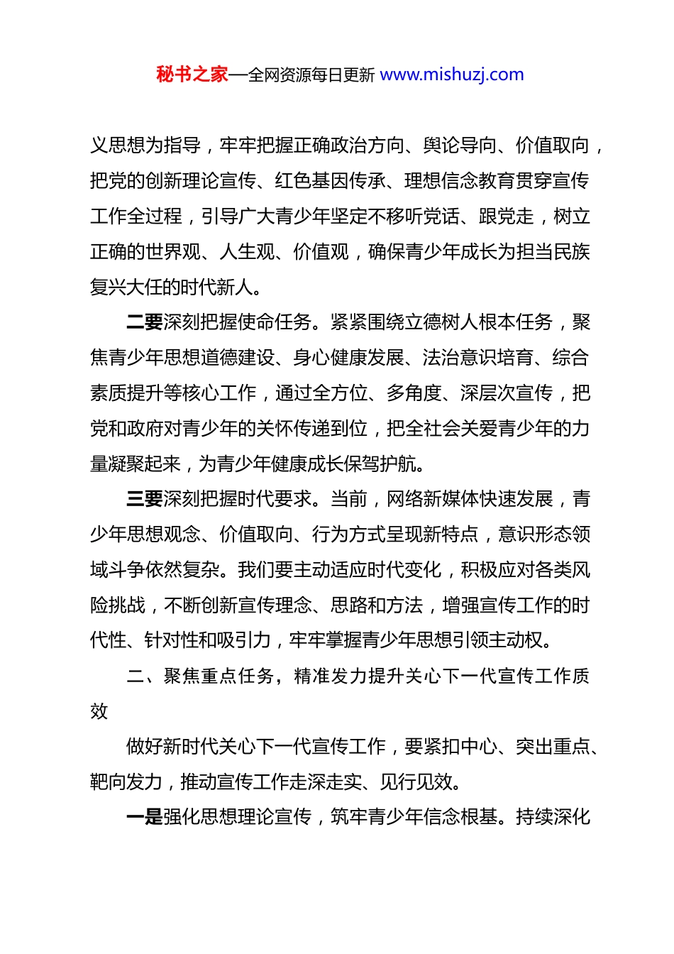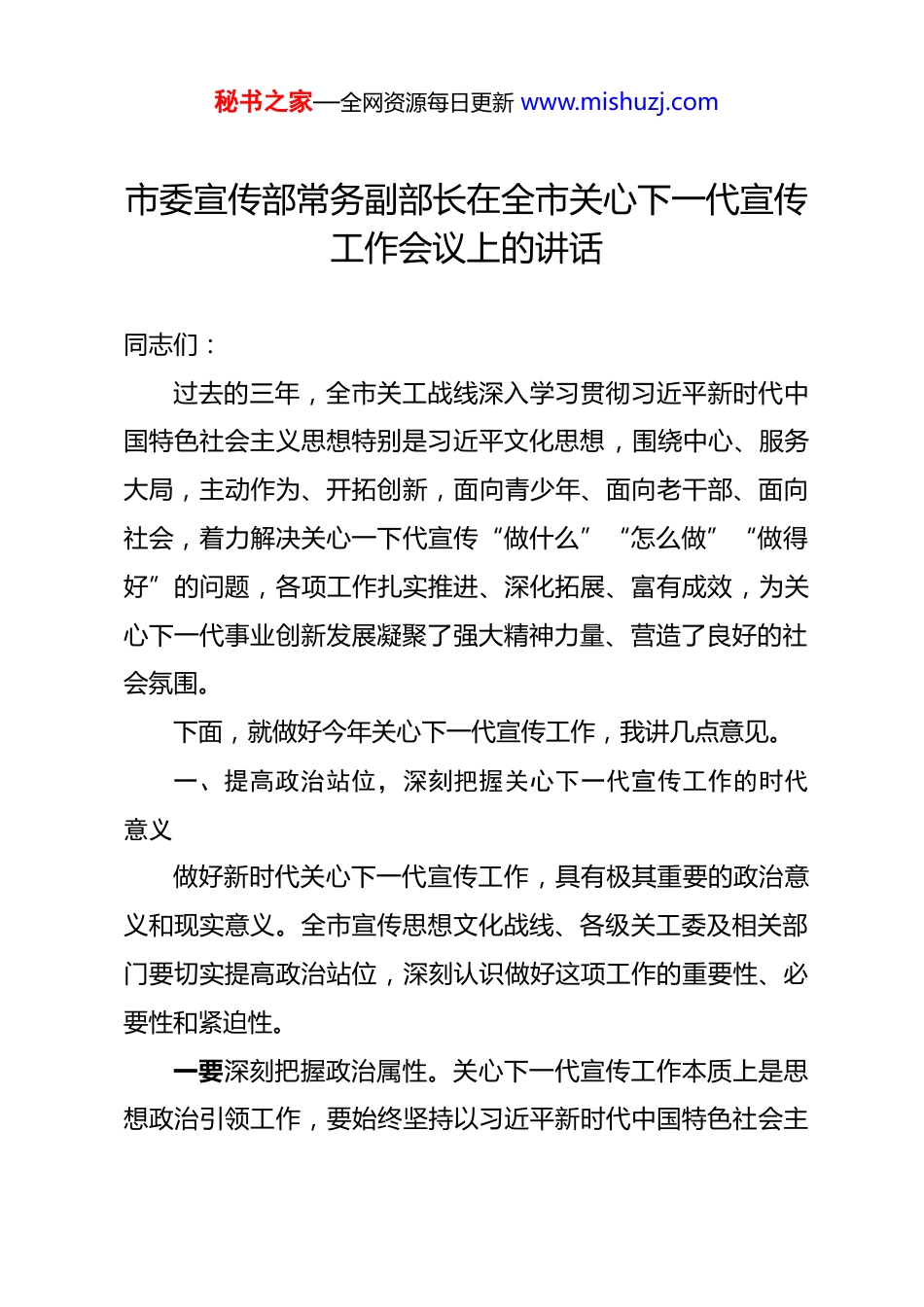 秘书之家—全网资源每日更新 www.mishuzj.com市委宣传部常务副部长在全市关心下一代宣传工作会议上的讲话 同志们:过去的三年,全市关工战线深入学习贯彻习近平新时代中国特色社会主义思想特别是习近平文化思想,围绕中心、服务大局,主动作为、开拓创新,面向青少年、面向老干部、面向社会,着力解决关心一下代宣传“做什么”“怎么做”“做得好”的问题,各项工作扎实推进、深化拓展、富有成效,为关心下一代事业创新发展凝聚了强大精神力量、营造了良好的社会氛围。下面,就做好今年关心下一代宣传工作,我讲几点意见。一、提高政治站位,深刻把握关心下一代宣传工作的时代意义做好新时代关心下一代宣传工作,具有极其重要的政治意义和现实意义。全市宣传思想文化战线、各级关工委及相关部门要切实提高政治站位,深刻认识做好这项工作的重要性、必要性和紧迫性。一要深刻把握政治属性。关心下一代宣传工作本质上是思想政治引领工作,要始终坚持以习近平新时代中国特色社会主秘书之家—全网资源每日更新 www.mishuzj.com义思想为指导,牢牢把握正确政治方向、舆论导向、价值取向,把党的创新理论宣传、红色基因传承、理想信念教育贯穿宣传工作全过程,引导广大青少年坚定不移听党话、跟党走,树立正确的世界观、人生观、价值观,确保青少年成长为担当民族复兴大任的时代新人。二要深刻把握使命任务。紧紧围绕立德树人根本任务,聚焦青少年思想道德建设、身心健康发展、法治意识培育、综合素质提升等核心工作,通过全方位、多角度、深层次宣传,把党和政府对青少年的关怀传递到位,把全社会关爱青少年的力量凝聚起来,为青少年健康成长保驾护航。三要深刻把握时代要求。当前,网络新媒体快速发展,青少年思想观念、价值取向、行为方式呈现新特点,意识形态领域斗争依然复杂。我们要主动适应时代变化,积极应对各类风险挑战,不断创新宣传理念、思路和方法,增强宣传工作的时代性、针对性和吸引力,牢牢掌握青少年思想引领主动权。二、聚焦重点任务,精准发力提升关心下一代宣传工作质效做好新时代关心下一代宣传工作,要紧扣中心、突出重点、靶向发力,推动宣传工作走深走实、见行见效。一是强化思想理论宣传,筑牢青少年信念根基。持续深化秘书之家—全网资源每日更新 www.mishuzj.com习近平新时代中国特色社会主义思想宣传教育,结合青少年认知特点,用通俗易懂的语言、生动鲜活的形式,推动党的创新理论进校园、进社区、进乡村、进网络。大力弘扬红色文化、传承红色基因,讲好革命故事、英雄故事、发展故事,引导青少年厚植爱国情怀、坚定理想信念。二是强化核心价值宣传,引领青少年道德风尚。以培育和践行社会主义核心价值观为核心,加强青少年爱国主义、集体主义、社会主义教育,宣传中华优秀传统文化、传统美德,开展文明素养、家风家训、诚信友善等主题宣传。深入挖掘宣传青少年身边的道德模范、优秀青年、时代好少年等先进典型,用榜样力量引领青少年崇德向善、见贤思齐。三是强化法治安全宣传,守护青少年健康成长。加强青少年法治宣传教育,普及宪法、未成年人保护法、预防未成年人犯罪法等法律法规,提升青少年法治意识和自我保护能力。常态化开展防溺水、防欺凌、防诈骗、交通安全、消防安全、心理健康等安全知识宣传,筑牢青少年安全防护网,引导青少年尊法学法守法用法,远离各类风险危害。三、创新方式方法,不断增强关心下一代宣传工作吸引力感染力新时代关心下一代宣传工作,必须与时俱进、守正创新,秘书之家—全网资源每日更新 www.mishuzj.com打破传统思维定式,丰富宣传形式载体,提升宣传工作的传播力、引导力、影响力。一是融合宣传载体,构建多元宣传工作矩阵。坚持传统媒体与新媒体协同发力,充分发挥电视、广播、报纸、宣传栏等传统媒体阵地作用,办好关心下一代专题专栏;大力用好微信公众号、短视频平台、微博、抖音等新媒体,制作推出图文、短视频、动漫等青少年喜闻乐见的宣传产品,实现线上线下宣传同频共振、全域覆盖。二是贴近基层实际,提升宣传工作实效性。坚持深入学校、社区、乡村、家庭,针对青少年、家长、基层工作者等不同群体,开...