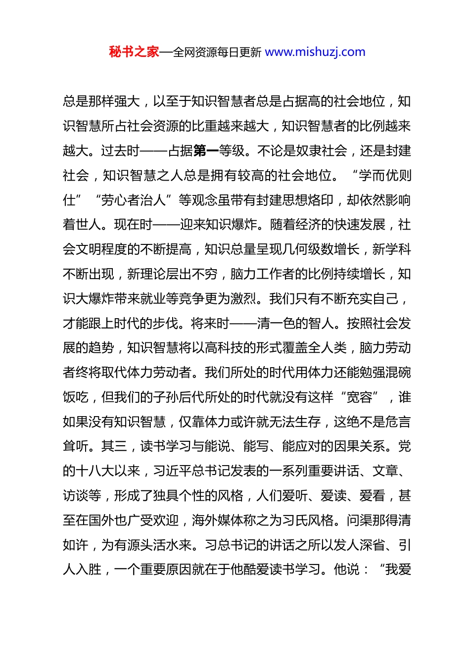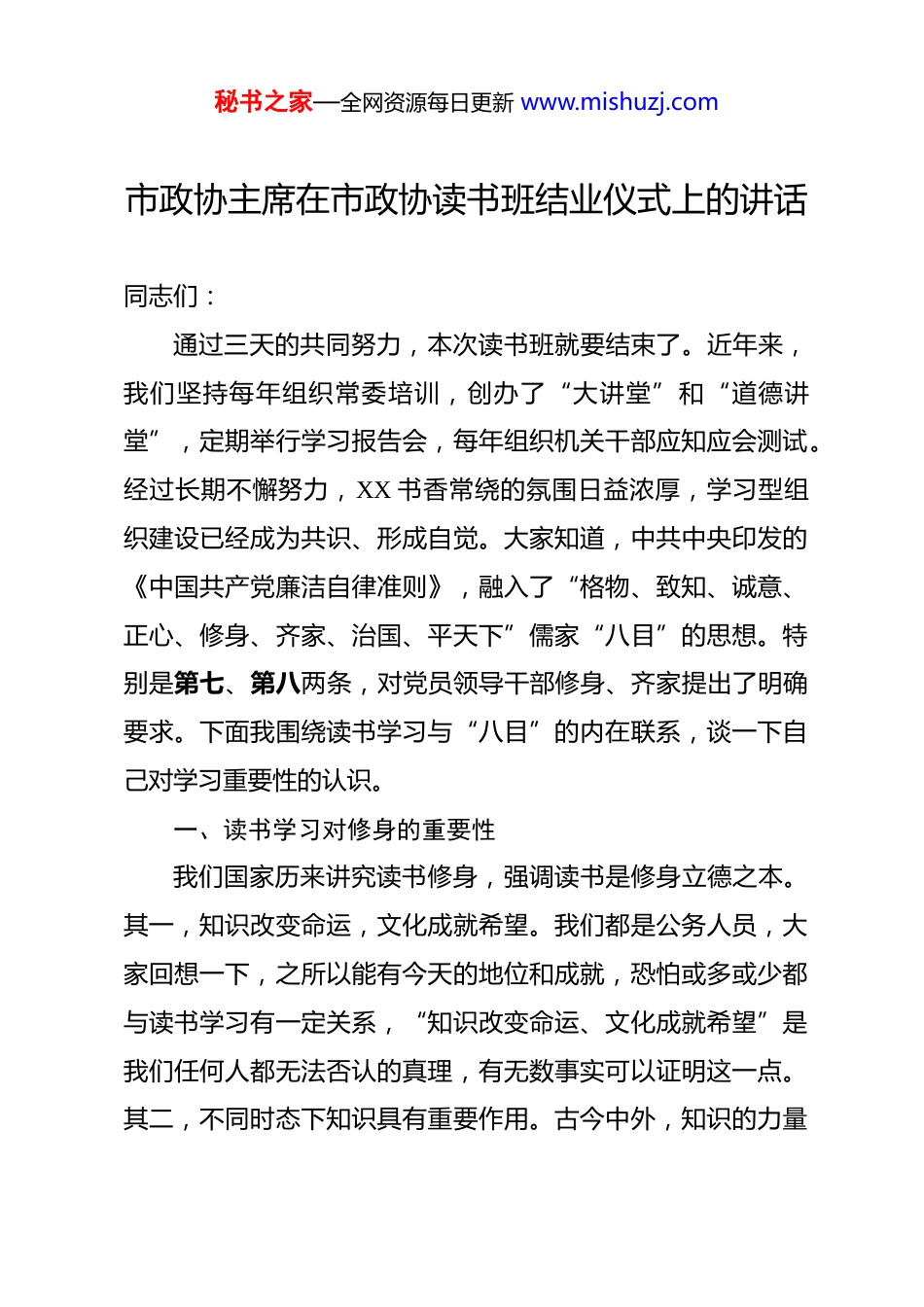 秘书之家—全网资源每日更新 www.mishuzj.com市政协主席在市政协读书班结业仪式上的讲话 同志们:通过三天的共同努力,本次读书班就要结束了。近年来,我们坚持每年组织常委培训,创办了“大讲堂”和“道德讲堂”,定期举行学习报告会,每年组织机关干部应知应会测试。经过长期不懈努力,XX 书香常绕的氛围日益浓厚,学习型组织建设已经成为共识、形成自觉。大家知道,中共中央印发的《中国共产党廉洁自律准则》,融入了“格物、致知、诚意、正心、修身、齐家、治国、平天下”儒家“八目”的思想。特别是第七、第八两条,对党员领导干部修身、齐家提出了明确要求。下面我围绕读书学习与“八目”的内在联系,谈一下自己对学习重要性的认识。一、读书学习对修身的重要性我们国家历来讲究读书修身,强调读书是修身立德之本。其一,知识改变命运,文化成就希望。我们都是公务人员,大家回想一下,之所以能有今天的地位和成就,恐怕或多或少都与读书学习有一定关系,“知识改变命运、文化成就希望”是我们任何人都无法否认的真理,有无数事实可以证明这一点。其二,不同时态下知识具有重要作用。古今中外,知识的力量秘书之家—全网资源每日更新 www.mishuzj.com总是那样强大,以至于知识智慧者总是占据高的社会地位,知识智慧所占社会资源的比重越来越大,知识智慧者的比例越来越大。过去时——占据第一等级。不论是奴隶社会,还是封建社会,知识智慧之人总是拥有较高的社会地位。“学而优则仕”“劳心者治人”等观念虽带有封建思想烙印,却依然影响着世人。现在时——迎来知识爆炸。随着经济的快速发展,社会文明程度的不断提高,知识总量呈现几何级数增长,新学科不断出现,新理论层出不穷,脑力工作者的比例持续增长,知识大爆炸带来就业等竞争更为激烈。我们只有不断充实自己,才能跟上时代的步伐。将来时——清一色的智人。按照社会发展的趋势,知识智慧将以高科技的形式覆盖全人类,脑力劳动者终将取代体力劳动者。我们所处的时代用体力还能勉强混碗饭吃,但我们的子孙后代所处的时代就没有这样“宽容”,谁如果没有知识智慧,仅靠体力或许就无法生存,这绝不是危言耸听。其三,读书学习与能说、能写、能应对的因果关系。党的十八大以来,习近平总书记发表的一系列重要讲话、文章、访谈等,形成了独具个性的风格,人们爱听、爱读、爱看,甚至在国外也广受欢迎,海外媒体称之为习氏风格。问渠那得清如许,为有源头活水来。习总书记的讲话之所以发人深省、引人入胜,一个重要原因就在于他酷爱读书学习。他说:“我爱秘书之家—全网资源每日更新 www.mishuzj.com好挺多,最大的爱好是读书,读书已成为我的一种生活方式。”“学史可以看成败、鉴得失、知兴替;学诗可以情飞扬、志高昂、人灵秀;学伦理可以知廉耻、懂荣辱、辨是非。”这或许就是“习氏语言风格”和其治国理政新理念新思想新战略的“源头活水”吧。我们不得不承认,凡是热爱读书学习之人,总是在谈话时更能发表独到的见解,在写作时更能妙笔生花、文思泉涌,在处理问题时更能应对从容、游刃有余。二、读书学习对齐家的重要性古今中外那些不仅显赫一时,而且能够接续传承的家族,无不把读书学习作为家风家训和传家之宝。其一,感悟两个“三代”的启示。西方有句谚语:“没有三代积淀培养不出一个绅士。”中国有句老话:“富不过三代。”前者讲的是文化积淀的重要性,后者讲的是忽视学习的危害性。看似矛盾的两个“三代”定律恰恰说明了读书学习、道德传家的重要性,说明一个家族的兴旺与衰落,关键在于能否书香常绕。其二,感悟曾国藩家族的变迁。曾国藩是中国近代历史上著名的人物,毛泽东和蒋介石都对其推崇备至、佩服得五体投地,不约而同地发出了“吾于近人,独服曾文正”的感叹。大家知道,曾国藩的家世并不显赫,他的爷爷曾星冈只是普通的农民,有一次去酒馆喝酒时受到别人的嘲笑,就腾出房屋创办了私塾“利见秘书之家—全网资源每日更新 www.mishuzj.com斋”,下定决心让子孙后代通过读书学习改变命运。曾国藩的父亲脑子很笨,从十几岁开始考秀才,前后考了 17 次,一直考到 43 岁,头发花白了才考中秀...