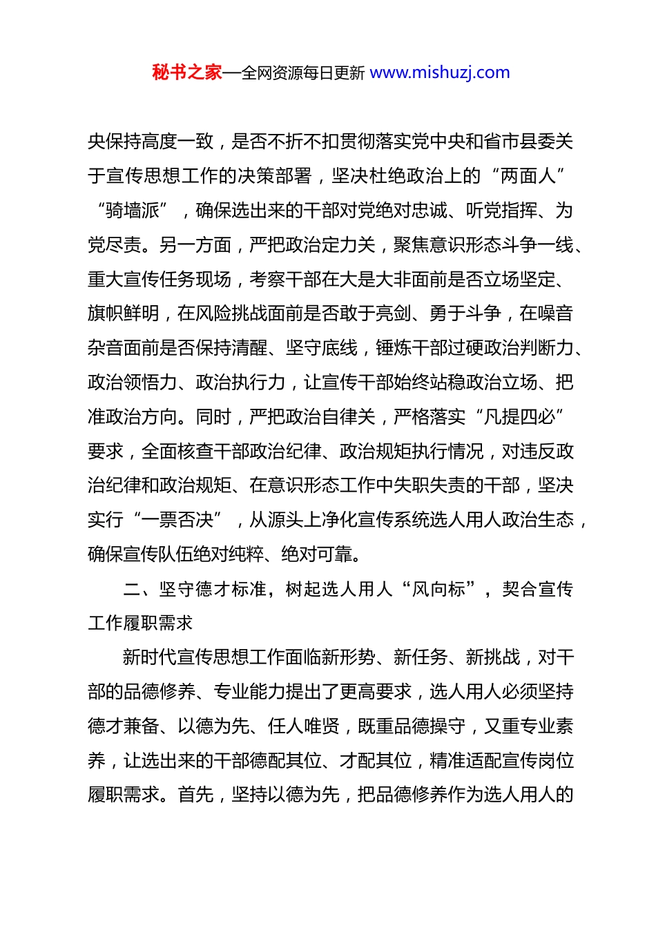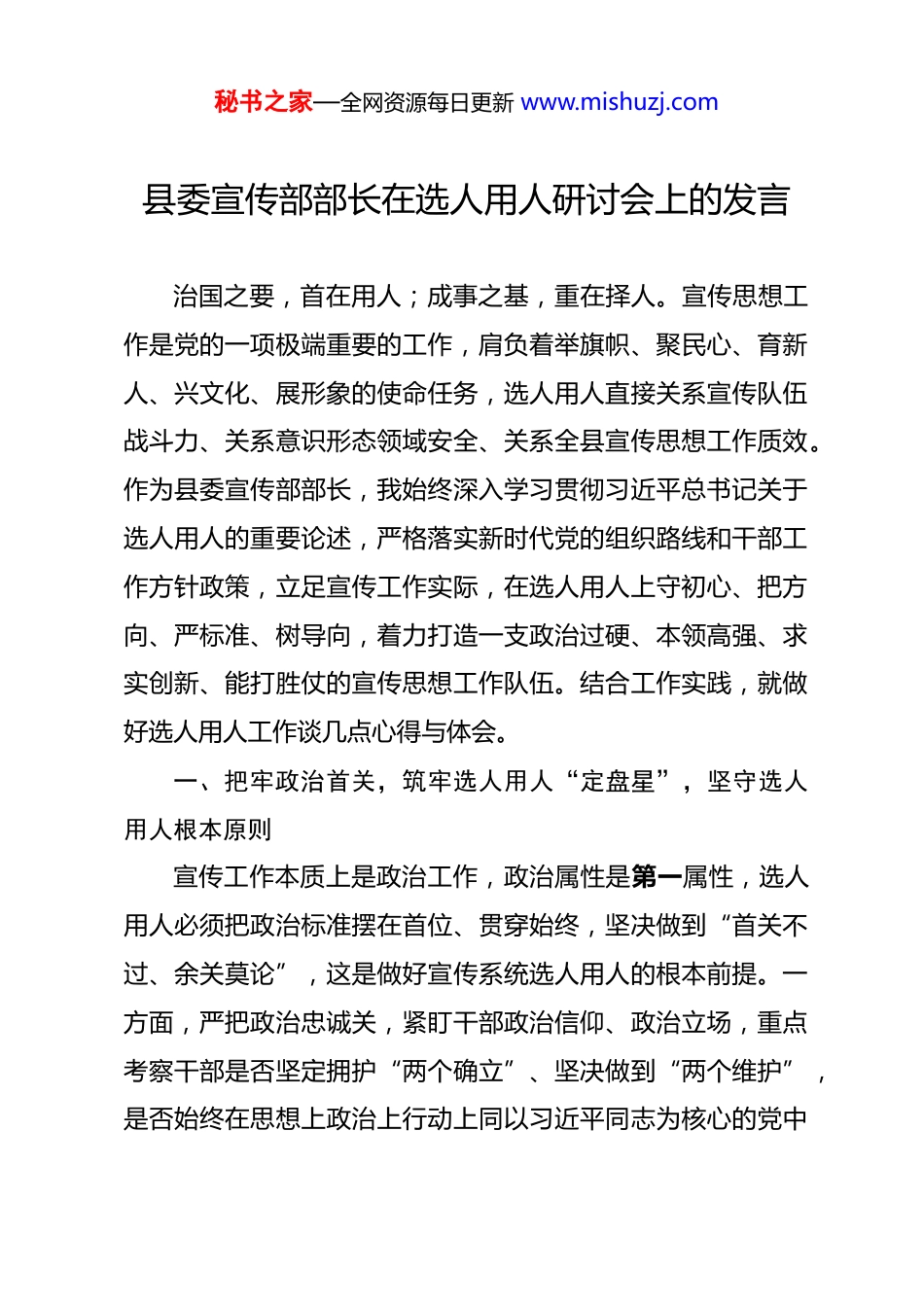 秘书之家—全网资源每日更新 www.mishuzj.com县委宣传部部长在选人用人研讨会上的发言 治国之要,首在用人;成事之基,重在择人。宣传思想工作是党的一项极端重要的工作,肩负着举旗帜、聚民心、育新人、兴文化、展形象的使命任务,选人用人直接关系宣传队伍战斗力、关系意识形态领域安全、关系全县宣传思想工作质效。作为县委宣传部部长,我始终深入学习贯彻习近平总书记关于选人用人的重要论述,严格落实新时代党的组织路线和干部工作方针政策,立足宣传工作实际,在选人用人上守初心、把方向、严标准、树导向,着力打造一支政治过硬、本领高强、求实创新、能打胜仗的宣传思想工作队伍。结合工作实践,就做好选人用人工作谈几点心得与体会。一、把牢政治首关,筑牢选人用人“定盘星”,坚守选人用人根本原则宣传工作本质上是政治工作,政治属性是第一属性,选人用人必须把政治标准摆在首位、贯穿始终,坚决做到“首关不过、余关莫论”,这是做好宣传系统选人用人的根本前提。一方面,严把政治忠诚关,紧盯干部政治信仰、政治立场,重点考察干部是否坚定拥护“两个确立”、坚决做到“两个维护”,是否始终在思想上政治上行动上同以习近平同志为核心的党中秘书之家—全网资源每日更新 www.mishuzj.com央保持高度一致,是否不折不扣贯彻落实党中央和省市县委关于宣传思想工作的决策部署,坚决杜绝政治上的“两面人”“骑墙派”,确保选出来的干部对党绝对忠诚、听党指挥、为党尽责。另一方面,严把政治定力关,聚焦意识形态斗争一线、重大宣传任务现场,考察干部在大是大非面前是否立场坚定、旗帜鲜明,在风险挑战面前是否敢于亮剑、勇于斗争,在噪音杂音面前是否保持清醒、坚守底线,锤炼干部过硬政治判断力、政治领悟力、政治执行力,让宣传干部始终站稳政治立场、把准政治方向。同时,严把政治自律关,严格落实“凡提四必”要求,全面核查干部政治纪律、政治规矩执行情况,对违反政治纪律和政治规矩、在意识形态工作中失职失责的干部,坚决实行“一票否决”,从源头上净化宣传系统选人用人政治生态,确保宣传队伍绝对纯粹、绝对可靠。二、坚守德才标准,树起选人用人“风向标”,契合宣传工作履职需求新时代宣传思想工作面临新形势、新任务、新挑战,对干部的品德修养、专业能力提出了更高要求,选人用人必须坚持德才兼备、以德为先、任人唯贤,既重品德操守,又重专业素养,让选出来的干部德配其位、才配其位,精准适配宣传岗位履职需求。首先,坚持以德为先,把品德修养作为选人用人的秘书之家—全网资源每日更新 www.mishuzj.com核心标尺,重点考察干部的职业道德、社会公德、家庭美德、个人品德,聚焦干部是否坚守初心使命、是否恪守为民情怀、是否秉持务实作风、是否严守廉洁底线,坚决选用品行端正、作风优良、甘于奉献的干部,摒弃品行不端、作风漂浮、投机取巧的人员,筑牢宣传干部的思想道德根基。其次,坚持以才为要,立足宣传工作专业性、实践性强的特点,精准识别干部专业能力,重点考察干部的理论素养、文字功底、舆论引导能力、文化建设本领、基层宣传实操水平,针对理论宣讲、新闻宣传、网信管理、文明创建、文化文艺等不同岗位,差异化选拔适配人才,不搞“一刀切”“大呼隆”,让专业的人干专业的事,破解宣传干部“本领恐慌”难题。同时,坚持以岗选人,打破论资排辈、平衡照顾的陈旧观念,立足全县宣传思想工作大局和岗位实际需求,不看资历看能力、不看关系看实绩,注重从基层一线、关键岗位发掘优秀干部,做到人岗相适、人事相宜,让每一名宣传干部都能在合适的岗位上施展才华、发挥作用,激活宣传队伍干事创业的内生动力。三、树牢实绩导向,激活选人用人“动力源”,彰显实干担当鲜明底色选人用人的核心是选实干者、用担当人,唯有以实绩论英雄、凭实绩用干部,才能树立鲜明导向,激励宣传干部担当作秘书之家—全网资源每日更新 www.mishuzj.com为、真抓实干,推动宣传思想工作落地见效。一方面,坚持在一线识别人才,把宣传工作主战场、基层服务最前沿、急难险重任务第一线作为考察干部的“赛马场”,重点关注干部在理论宣传、文明城市创建、舆情处...