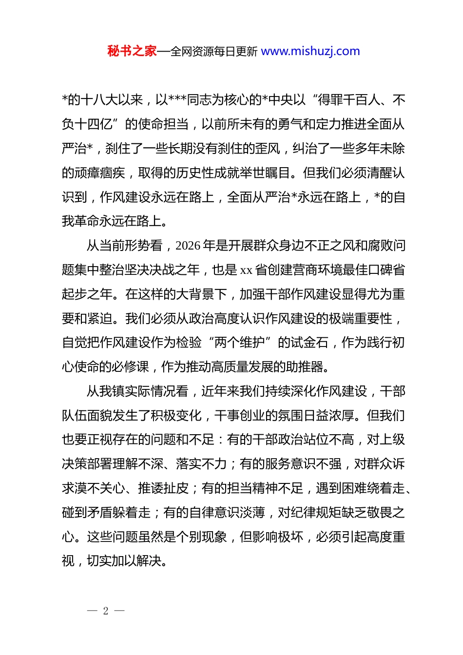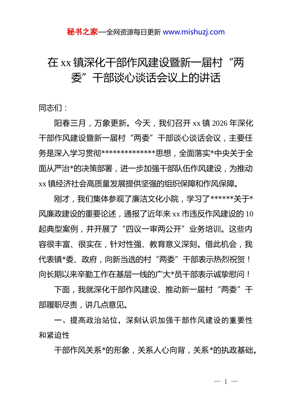 秘书之家—全网资源每日更新 www.mishuzj.com在 xx 镇深化干部作风建设暨新一届村“两委”干部谈心谈话会议上的讲话同志们:阳春三月,万象更新。今天,我们召开 xx 镇 2026 年深化干部作风建设暨新一届村“两委”干部谈心谈话会议,主要任务是深入学习贯彻**************思想,全面落实*中央关于全面从严治*的决策部署,进一步加强干部队伍作风建设,为推动xx 镇经济社会高质量发展提供坚强的组织保障和作风保障。刚才,我们集体参观了廉洁文化小院,学习了******关于*风廉政建设的重要论述,通报了近年来 xx 市违反作风建设的 10起典型案例,并开展了“四议一审两公开”业务培训。这些内容很丰富、很实在,针对性强、教育意义深刻。借此机会,我代表镇*委、政府,向新当选的村“两委”干部表示热烈祝贺!向长期以来辛勤工作在基层一线的广大*员干部表示诚挚慰问!下面,我就深化干部作风建设、推动新一届村“两委”干部履职尽责,讲几点意见。一、提高政治站位,深刻认识加强干部作风建设的重要性和紧迫性干部作风关系*的形象,关系人心向背,关系*的执政基础。— 1 —秘书之家—全网资源每日更新 www.mishuzj.com*的十八大以来,以***同志为核心的*中央以“得罪千百人、不负十四亿”的使命担当,以前所未有的勇气和定力推进全面从严治*,刹住了一些长期没有刹住的歪风,纠治了一些多年未除的顽瘴痼疾,取得的历史性成就举世瞩目。但我们必须清醒认识到,作风建设永远在路上,全面从严治*永远在路上,*的自我革命永远在路上。从当前形势看,2026 年是开展群众身边不正之风和腐败问题集中整治坚决决战之年,也是 xx 省创建营商环境最佳口碑省起步之年。在这样的大背景下,加强干部作风建设显得尤为重要和紧迫。我们必须从政治高度认识作风建设的极端重要性,自觉把作风建设作为检验“两个维护”的试金石,作为践行初心使命的必修课,作为推动高质量发展的助推器。从我镇实际情况看,近年来我们持续深化作风建设,干部队伍面貌发生了积极变化,干事创业的氛围日益浓厚。但我们也要正视存在的问题和不足:有的干部政治站位不高,对上级决策部署理解不深、落实不力;有的服务意识不强,对群众诉求漠不关心、推诿扯皮;有的担当精神不足,遇到困难绕着走、碰到矛盾躲着走;有的自律意识淡薄,对纪律规矩缺乏敬畏之心。这些问题虽然是个别现象,但影响极坏,必须引起高度重视,切实加以解决。— 2 —秘书之家—全网资源每日更新 www.mishuzj.com二、站稳政治立场,筑牢忠诚之魂讲政治是我们*补钙壮骨、强身健体的根本保证。全体镇村干部必须把讲政治摆在首位,在思想上政治上行动上同以***同志为核心的*中央保持高度一致,坚定不移当好贯彻*中央决策部署的执行者、行动派、实干家。要把对*忠诚作为政治灵魂:忠诚是为政之魂,是首要的政治品质。我们要始终心怀“国之大者”,把对*忠诚体现在贯彻落实*中央决策部署的具体行动上,体现在履职尽责的实际成效上,体现在日常言行的点滴细节上。要不断增强“四个意识”、坚定“四个自信”、做到“两个维护”,在重大原则问题上立场坚定,在大是大非面前旗帜鲜明。要把理论学习作为终身课题:理论上的清醒是政治上坚定的前提。要深入学习**************思想,学习*的二十大和二十届历次全会精神,学习*中央关于“三农”工作、乡村振兴、基层治理等方面的方针政策。要原原本本学、深入系统学、联系实际学,做到学思用贯通、知信行统一,不断提高政治判断力、政治领悟力、政治执行力。要把服从组织作为基本要求:*员干部是*的人,组织培养了我们,我们必须服从组织、听*指挥。要严格执行重大事项请示报告制度,该请示的必须请示,该报告的必须报告,不能擅— 3 —秘书之家—全网资源每日更新 www.mishuzj.com作主张、自行其是。要正确处理个人与组织的关系,做到个人服从组织、少数服从多数、下级服从上级、全*服从中央。三、强化组织意识,凝聚奋进之力组织力量是我们*战胜困难、夺取胜利的重要法宝。全体镇村干部要增强组织观念,珍惜组织信任,自觉在组织框架内履职尽责,在团结协作中展现作为。要维护团结统一,团结...