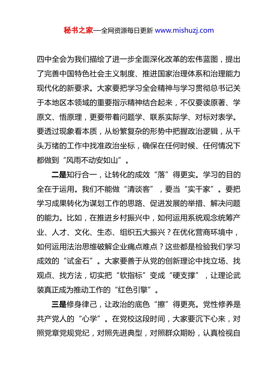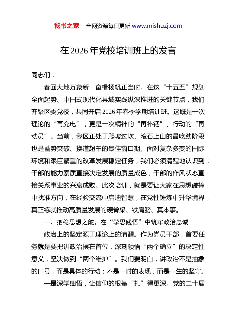 秘书之家—全网资源每日更新 www.mishuzj.com在 2026 年党校培训班上的发言 同志们:春回大地万象新,奋楫扬帆正当时。在这“十五五”规划全面起势、中国式现代化县域实践纵深推进的关键节点,我们齐聚区委党校,共同开启 2026 年春季学期培训班。这既是一次理论的“再充电”,更是一次精神的“再补钙”、行动的“再动员”。当前,我区正处于爬坡过坎、滚石上山的最吃劲阶段,也是蓄势突破、换道超车的最佳窗口期。面对复杂多变的国际环境和艰巨繁重的改革发展稳定任务,我们必须清醒地认识到:干部的能力素质直接决定发展的质量成色,干部的作风状态直接关系事业的兴衰成败。此次培训,就是要让大家在思想碰撞中找准方向,在经验交流中启迪智慧,在党性锤炼中升华境界,真正练就推动高质量发展的硬脊梁、铁肩膀、真本事。一、把稳思想之舵,在“学思践悟”中筑牢政治忠诚政治上的坚定源于理论上的清醒。作为党员干部,首要任务就是要把讲政治摆在首位,深刻领悟“两个确立”的决定性意义,坚决做到“两个维护”。我们要明白,讲政治不是抽象的口号,而是具体的行动;不是一时的表现,而是一生的坚守。一是深学细悟,让信仰的根基“扎”得更深。党的二十届秘书之家—全网资源每日更新 www.mishuzj.com四中全会为我们描绘了进一步全面深化改革的宏伟蓝图,提出了完善中国特色社会主义制度、推进国家治理体系和治理能力现代化的新要求。大家要把学习全会精神与学习贯彻总书记关于本地区本领域的重要指示精神结合起来,不仅要读原著、学原文、悟原理,更要带着问题学、联系实际学、对标对表学。要透过现象看本质,从纷繁复杂的形势中把握政治逻辑,从千头万绪的工作中找准政治坐标,确保在任何时候、任何情况下都做到“风雨不动安如山”。二是知行合一,让转化的成效“落”得更实。学习的目的全在于运用。我们不能做“清谈客”,要当“实干家”。要把学习成果转化为谋划工作的思路、促进发展的举措、解决问题的能力。比如,在推进乡村振兴中,如何运用系统观念统筹产业、人才、文化、生态、组织五大振兴?在优化营商环境中,如何运用法治思维破解企业痛点难点?这些都是检验我们学习成效的“试金石”。大家要善于从党的创新理论中找立场、找观点、找方法,切实把“软指标”变成“硬支撑”,让理论武装真正成为推动工作的“红色引擎”。三是修身律己,让政治的底色“擦”得更亮。党性修养是共产党人的“心学”。在党校这段时间,大家要沉下心来,对照党章党规党纪,对照先进典型,对照群众期盼,认真检视自秘书之家—全网资源每日更新 www.mishuzj.com己在理想信念、宗旨意识、纪律作风等方面存在的差距。要时刻自重自省自警自励,慎独慎微慎始慎终,在大是大非面前旗帜鲜明,在风浪考验面前无所畏惧,在各种诱惑面前立场坚定,永葆共产党人清正廉洁的政治本色,以自身正、自身硬引领风清气正的政治生态。二、扛起发展之责,在“攻坚克难”中展现担当作为大道至简,实干为要。面对难啃的“硬骨头”、难涉的“深水区”,唯有担当才能破局,唯有实干才能兴邦。我们决不能当“躺平式”干部,决不能做“侧卧式”官员,而要争做“奔跑者”和“奋斗者”。一是聚焦产业升级,在培育新动能上出实招。产业是发展的根基。当前,新一轮科技革命和产业变革深入发展,我们必须抢抓机遇,加快构建现代化产业体系。要摒弃“捡到篮里都是菜”的旧思维,树立“精准招商、链式发展”的新理念。围绕我区主导产业,绘制产业链图谱,按图索骥引进一批补链、延链、强链的重大项目。同时,要大力支持传统产业数字化、智能化改造,推动“老树发新芽”;积极培育壮大战略性新兴产业和未来产业,打造新的经济增长极。一季度以来,全区已签约亿元以上项目 18 个,总投资额达*亿元,但这只是开始,我们要乘势而上,争取全年实现更大突破。秘书之家—全网资源每日更新 www.mishuzj.com二是聚焦城市更新,在提升品质上下真功。城市是人民的城市,人民城市为人民。我们要坚持“人民城市”重要理念,下足“绣花”功夫,推动城市内涵式发展。既要抓好“面子”上的亮化美化,更要做好“里子”里的提质增效。加...