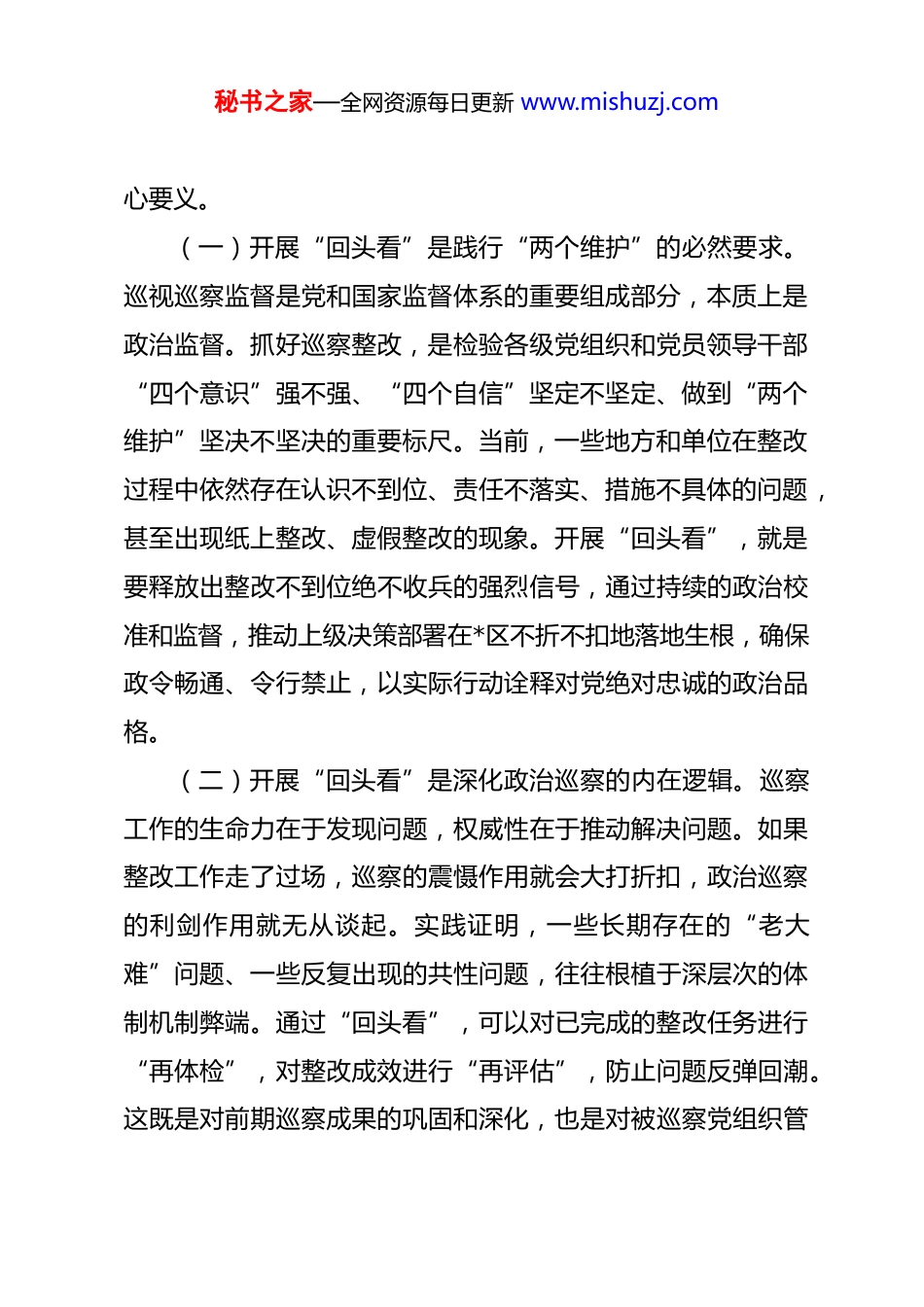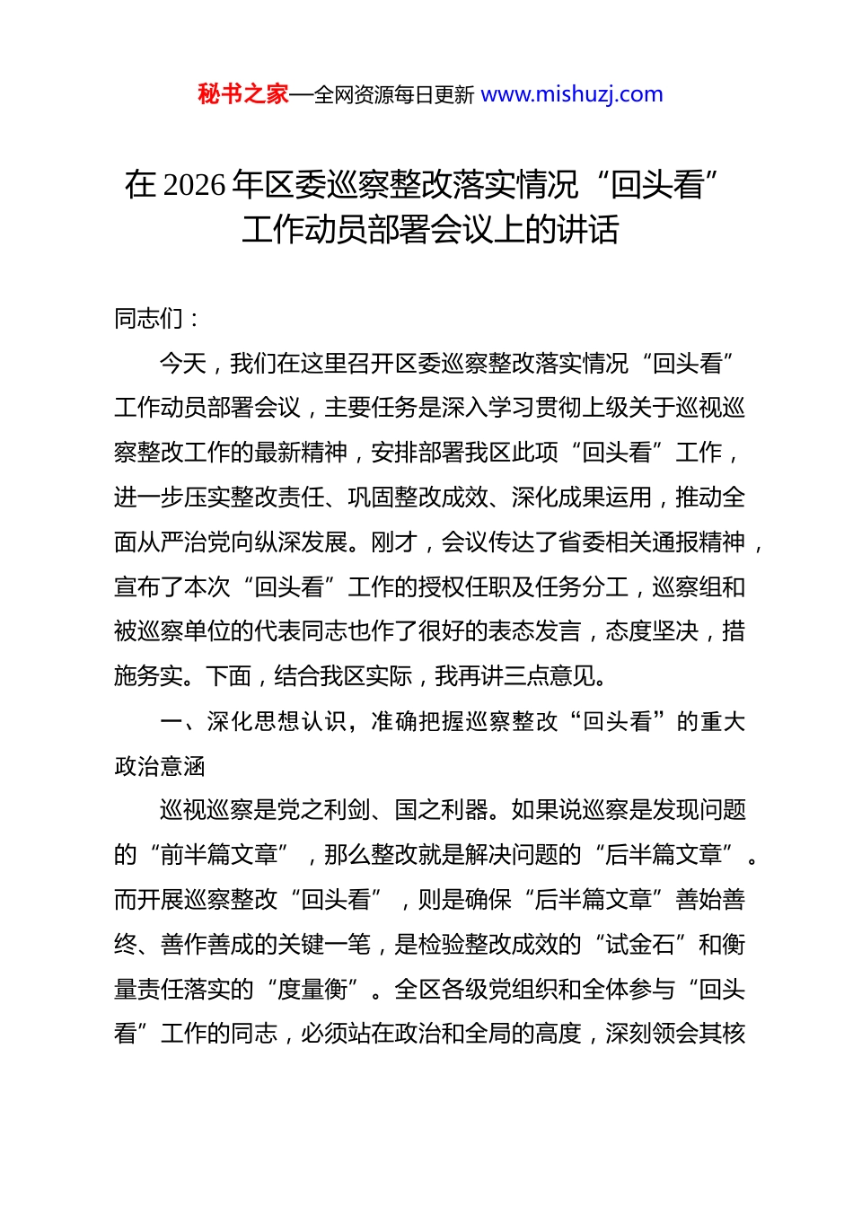 秘书之家—全网资源每日更新 www.mishuzj.com在 2026 年区委巡察整改落实情况“回头看”工作动员部署会议上的讲话 同志们:今天,我们在这里召开区委巡察整改落实情况“回头看”工作动员部署会议,主要任务是深入学习贯彻上级关于巡视巡察整改工作的最新精神,安排部署我区此项“回头看”工作,进一步压实整改责任、巩固整改成效、深化成果运用,推动全面从严治党向纵深发展。刚才,会议传达了省委相关通报精神,宣布了本次“回头看”工作的授权任职及任务分工,巡察组和被巡察单位的代表同志也作了很好的表态发言,态度坚决,措施务实。下面,结合我区实际,我再讲三点意见。一、深化思想认识,准确把握巡察整改“回头看”的重大政治意涵巡视巡察是党之利剑、国之利器。如果说巡察是发现问题的“前半篇文章”,那么整改就是解决问题的“后半篇文章”。而开展巡察整改“回头看”,则是确保“后半篇文章”善始善终、善作善成的关键一笔,是检验整改成效的“试金石”和衡量责任落实的“度量衡”。全区各级党组织和全体参与“回头看”工作的同志,必须站在政治和全局的高度,深刻领会其核秘书之家—全网资源每日更新 www.mishuzj.com心要义。(一)开展“回头看”是践行“两个维护”的必然要求。巡视巡察监督是党和国家监督体系的重要组成部分,本质上是政治监督。抓好巡察整改,是检验各级党组织和党员领导干部“四个意识”强不强、“四个自信”坚定不坚定、做到“两个维护”坚决不坚决的重要标尺。当前,一些地方和单位在整改过程中依然存在认识不到位、责任不落实、措施不具体的问题,甚至出现纸上整改、虚假整改的现象。开展“回头看”,就是要释放出整改不到位绝不收兵的强烈信号,通过持续的政治校准和监督,推动上级决策部署在*区不折不扣地落地生根,确保政令畅通、令行禁止,以实际行动诠释对党绝对忠诚的政治品格。(二)开展“回头看”是深化政治巡察的内在逻辑。巡察工作的生命力在于发现问题,权威性在于推动解决问题。如果整改工作走了过场,巡察的震慑作用就会大打折扣,政治巡察的利剑作用就无从谈起。实践证明,一些长期存在的“老大难”问题、一些反复出现的共性问题,往往根植于深层次的体制机制弊端。通过“回头看”,可以对已完成的整改任务进行“再体检”,对整改成效进行“再评估”,防止问题反弹回潮。这既是对前期巡察成果的巩固和深化,也是对被巡察党组织管秘书之家—全网资源每日更新 www.mishuzj.com党治党责任的再压实,能够有效推动巡察监督、整改、治理有机贯通,形成监督闭环,提升治理效能。(三)开展“回头看”是回应群众期盼的现实需要。人心是最大的政治。巡察工作的出发点和落脚点,最终要体现在解决群众急难愁盼的具体问题上。巡察反馈的问题,很多都与群众的切身利益息息相关。整改是否有成效,群众最有发言权。一个时期以来,我区通过巡察整改,确实解决了一批历史遗留问题,办成了一些民生实事,如在教育民生领域、作风建设等方面均取得了阶段性成效。但同时也要清醒地看到,个别问题的整改效果与群众的期待尚有差距,整改成果的普惠性、长效性仍需加强。开展“回头看”,就是要以群众满意不满意作为根本评判标准,重点关注群众在整改中的所获所及,推动巡察成果更多更公平地惠及全体人民,切实增强群众的获得感、幸福感、安全感,不断夯实党执政的群众基础。二、聚焦监督重点,以精准有力的监督印证整改成效本次“回头看”的核心任务,就是印证验收整改成效。工作不能泛泛而谈,必须聚焦重点、精准发力。各巡察组要牢牢把握监督的核心,严格对照巡察反馈意见和整改要求,透过现象看本质,既要看“病灶”是否切除,更要看“病根”是否根除,确保整改成果经得起历史和实践的检验。秘书之家—全网资源每日更新 www.mishuzj.com(一)紧盯责任落实,确保整改压力传导到底。整改责任不落实,一切整改都是空谈。在“回头看”过程中,必须将责任落实情况作为监督检查的重中之重。一是要看主体责任是否扛在肩上。要重点检查被巡察党组织主要负责人是否真正担负起第一责任人责任,是否对整改工作亲自部署、亲自过问、亲自协调、亲自督办;...