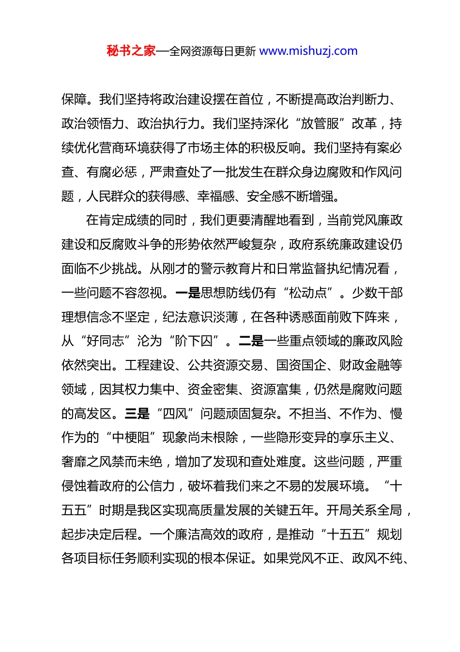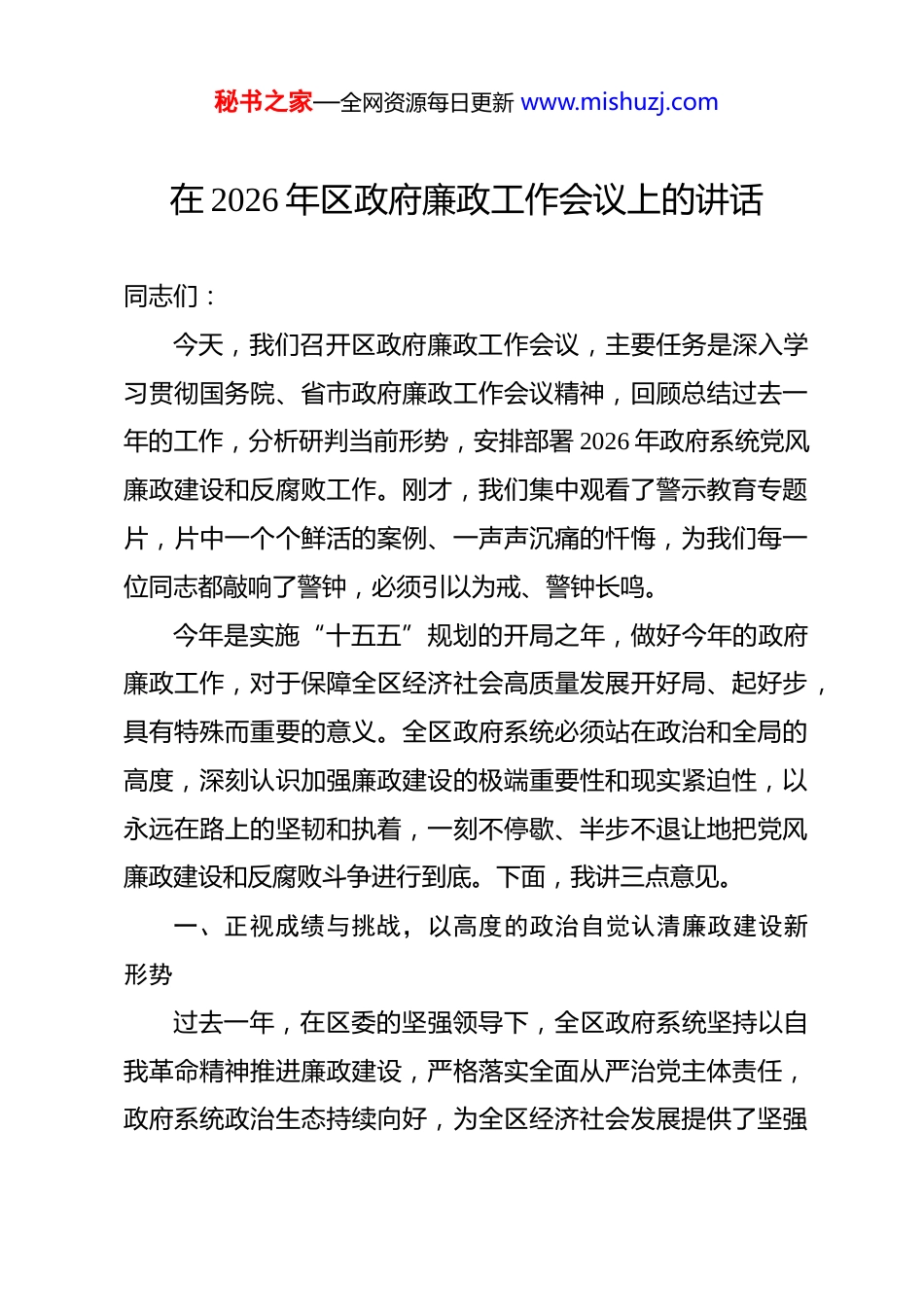 秘书之家—全网资源每日更新 www.mishuzj.com在 2026 年区政府廉政工作会议上的讲话 同志们:今天,我们召开区政府廉政工作会议,主要任务是深入学习贯彻国务院、省市政府廉政工作会议精神,回顾总结过去一年的工作,分析研判当前形势,安排部署 2026 年政府系统党风廉政建设和反腐败工作。刚才,我们集中观看了警示教育专题片,片中一个个鲜活的案例、一声声沉痛的忏悔,为我们每一位同志都敲响了警钟,必须引以为戒、警钟长鸣。今年是实施“十五五”规划的开局之年,做好今年的政府廉政工作,对于保障全区经济社会高质量发展开好局、起好步,具有特殊而重要的意义。全区政府系统必须站在政治和全局的高度,深刻认识加强廉政建设的极端重要性和现实紧迫性,以永远在路上的坚韧和执着,一刻不停歇、半步不退让地把党风廉政建设和反腐败斗争进行到底。下面,我讲三点意见。一、正视成绩与挑战,以高度的政治自觉认清廉政建设新形势过去一年,在区委的坚强领导下,全区政府系统坚持以自我革命精神推进廉政建设,严格落实全面从严治党主体责任,政府系统政治生态持续向好,为全区经济社会发展提供了坚强秘书之家—全网资源每日更新 www.mishuzj.com保障。我们坚持将政治建设摆在首位,不断提高政治判断力、政治领悟力、政治执行力。我们坚持深化“放管服”改革,持续优化营商环境获得了市场主体的积极反响。我们坚持有案必查、有腐必惩,严肃查处了一批发生在群众身边腐败和作风问题,人民群众的获得感、幸福感、安全感不断增强。在肯定成绩的同时,我们更要清醒地看到,当前党风廉政建设和反腐败斗争的形势依然严峻复杂,政府系统廉政建设仍面临不少挑战。从刚才的警示教育片和日常监督执纪情况看,一些问题不容忽视。一是思想防线仍有“松动点”。少数干部理想信念不坚定,纪法意识淡薄,在各种诱惑面前败下阵来,从“好同志”沦为“阶下囚”。二是一些重点领域的廉政风险依然突出。工程建设、公共资源交易、国资国企、财政金融等领域,因其权力集中、资金密集、资源富集,仍然是腐败问题的高发区。三是“四风”问题顽固复杂。不担当、不作为、慢作为的“中梗阻”现象尚未根除,一些隐形变异的享乐主义、奢靡之风禁而未绝,增加了发现和查处难度。这些问题,严重侵蚀着政府的公信力,破坏着我们来之不易的发展环境。“十五五”时期是我区实现高质量发展的关键五年。开局关系全局,起步决定后程。一个廉洁高效的政府,是推动“十五五”规划各项目标任务顺利实现的根本保证。如果党风不正、政风不纯、秘书之家—全网资源每日更新 www.mishuzj.com作风不实,再宏伟的蓝图也只能是空中楼阁。全区政府系统各级各部门必须把思想和行动统一到中央和省、市、区的决策部署上来,始终保持“赶考”的清醒,保持对“腐蚀”“围猎”的警觉,以更高的标准、更严的要求、更实的举措压实责任,推动政府系统廉政建设不断取得新成效。二、聚焦关键与重点,以精准的靶向施策深化廉政建设新实践做好今年的政府廉政工作,必须坚持问题导向、目标导向结果导向相统一,紧盯关键环节和重点领域,拿出抓铁有痕、踏石留印的劲头,坚决守好红线底线,推动各项任务落地见效。第一,聚焦权力运行制约,全力打造规范透明的政务环境。权力一旦失去监督,必然导致腐败。必须把权力关进制度的笼子里,确保权力在阳光下运行。一要持续深化“放管服”改革。这是优化营商环境、从源头预防腐败的关键之举。要全面落实行政许可事项清单管理,持续推进“一网通办”“一窗通办”,最大限度减环节、优流程、压时限、提效率。要深化“服务型效能型”机关创建,大力推行“包容审慎”监管模式,对新技术、新产业、新业态、新模式,多一些引导和扶持,少一些限制和干预,真正做到便民利企。同时,要建立健全政务服务“好差评”制度,畅通企业和群众的监督渠道,以监督促服务秘书之家—全网资源每日更新 www.mishuzj.com提升,坚决整治窗口单位服务意识差、办事效率低、推诿扯皮等问题。二要强化对公共资金的监管。财政资金是人民的“血汗钱”,一分一厘都不能乱花。财政、审计部门要发挥好“卫士”和“尖兵”作用。要严格...