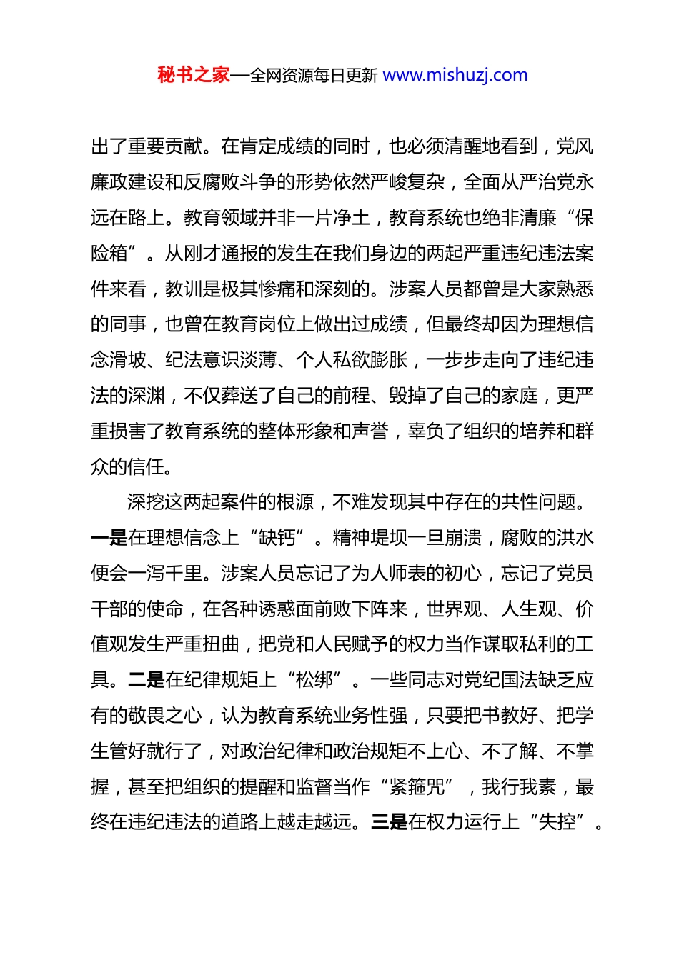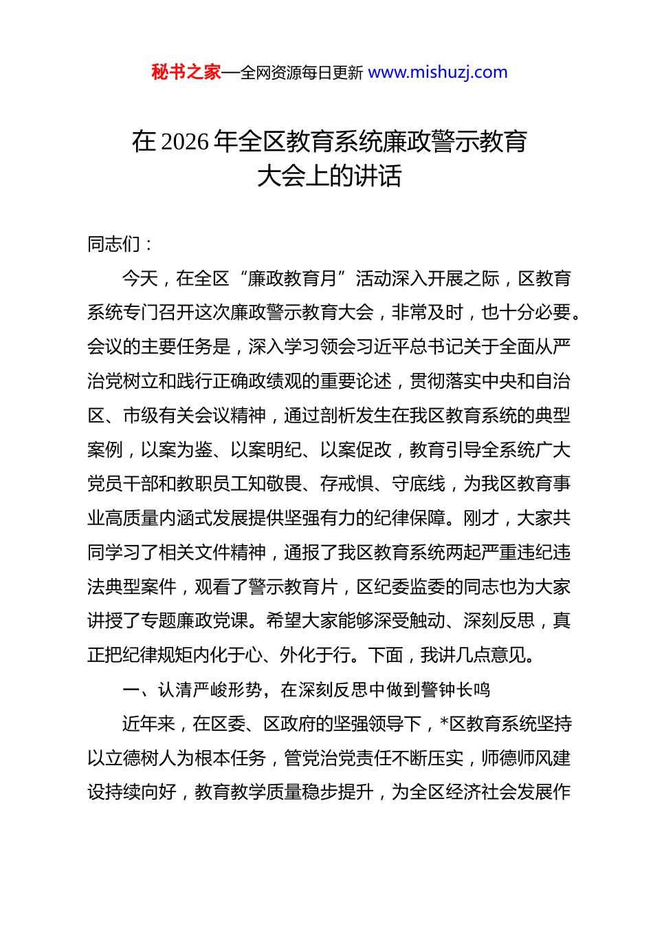 秘书之家—全网资源每日更新 www.mishuzj.com在 2026 年全区教育系统廉政警示教育大会上的讲话 同志们:今天,在全区“廉政教育月”活动深入开展之际,区教育系统专门召开这次廉政警示教育大会,非常及时,也十分必要。会议的主要任务是,深入学习领会习近平总书记关于全面从严治党树立和践行正确政绩观的重要论述,贯彻落实中央和自治区、市级有关会议精神,通过剖析发生在我区教育系统的典型案例,以案为鉴、以案明纪、以案促改,教育引导全系统广大党员干部和教职员工知敬畏、存戒惧、守底线,为我区教育事业高质量内涵式发展提供坚强有力的纪律保障。刚才,大家共同学习了相关文件精神,通报了我区教育系统两起严重违纪违法典型案件,观看了警示教育片,区纪委监委的同志也为大家讲授了专题廉政党课。希望大家能够深受触动、深刻反思,真正把纪律规矩内化于心、外化于行。下面,我讲几点意见。一、认清严峻形势,在深刻反思中做到警钟长鸣近年来,在区委、区政府的坚强领导下,*区教育系统坚持以立德树人为根本任务,管党治党责任不断压实,师德师风建设持续向好,教育教学质量稳步提升,为全区经济社会发展作秘书之家—全网资源每日更新 www.mishuzj.com出了重要贡献。在肯定成绩的同时,也必须清醒地看到,党风廉政建设和反腐败斗争的形势依然严峻复杂,全面从严治党永远在路上。教育领域并非一片净土,教育系统也绝非清廉“保险箱”。从刚才通报的发生在我们身边的两起严重违纪违法案件来看,教训是极其惨痛和深刻的。涉案人员都曾是大家熟悉的同事,也曾在教育岗位上做出过成绩,但最终却因为理想信念滑坡、纪法意识淡薄、个人私欲膨胀,一步步走向了违纪违法的深渊,不仅葬送了自己的前程、毁掉了自己的家庭,更严重损害了教育系统的整体形象和声誉,辜负了组织的培养和群众的信任。深挖这两起案件的根源,不难发现其中存在的共性问题。一是在理想信念上“缺钙”。精神堤坝一旦崩溃,腐败的洪水便会一泻千里。涉案人员忘记了为人师表的初心,忘记了党员干部的使命,在各种诱惑面前败下阵来,世界观、人生观、价值观发生严重扭曲,把党和人民赋予的权力当作谋取私利的工具。二是在纪律规矩上“松绑”。一些同志对党纪国法缺乏应有的敬畏之心,认为教育系统业务性强,只要把书教好、把学生管好就行了,对政治纪律和政治规矩不上心、不了解、不掌握,甚至把组织的提醒和监督当作“紧箍咒”,我行我素,最终在违纪违法的道路上越走越远。三是在权力运行上“失控”。秘书之家—全网资源每日更新 www.mishuzj.com权力是一把“双刃剑”,在阳光下运行可以造福于民,在暗箱里操作则必然导致腐败。从案件暴露出的问题看,招生采购、项目建设、后勤管理、经费使用等重点领域和关键环节,仍然存在制度漏洞和监管盲区,给了少数人可乘之机。四是在家风家教上“失守”。警示片《家风败坏共食苦果》直击人心,家风不正,祸患不远。个别干部治家不严,对配偶、子女失管失教,默许甚至纵容亲属利用其职务影响谋取私利,最终导致家庭成员共同走向腐败的深渊。这些问题,不仅是涉案人员个人的悲剧,更是对全系统党员干部的一次深刻警示。当前,党中央正以前所未有的力度,纵深推进全面从严治党,将教育领域列为深化整治群众身边不正之风和腐败问题的重点领域之一。全区教育系统的每一位同志,特别是各级领导干部,必须从这些身边人、身边事中吸取教训,深刻认识到党风廉政建设的长期性、复杂性和艰巨性,摒弃任何侥幸心理和松懈心态,时刻绷紧廉洁自律这根弦,真正做到警钟长鸣、防微杜渐。二、聚焦突出问题,在靶向发力中务求整治实效问题是时代的声音,也是工作的导向。针对当前我区教育系统党风廉政建设存在的短板弱项,必须坚持问题导向,拿出精准有力的措施,动真碰硬、一抓到底,坚决清除存量、遏制增量,持续净化教育政治生态。秘书之家—全网资源每日更新 www.mishuzj.com第一,持续深化集中整治,务求闭环整改见底清零。前一阶段开展的群众身边不正之风和腐败问题集中整治,发现了一些问题,也取得了一定成效。但整治工作不能“雨过地皮湿”,必须做好“后半篇文章”。要对...