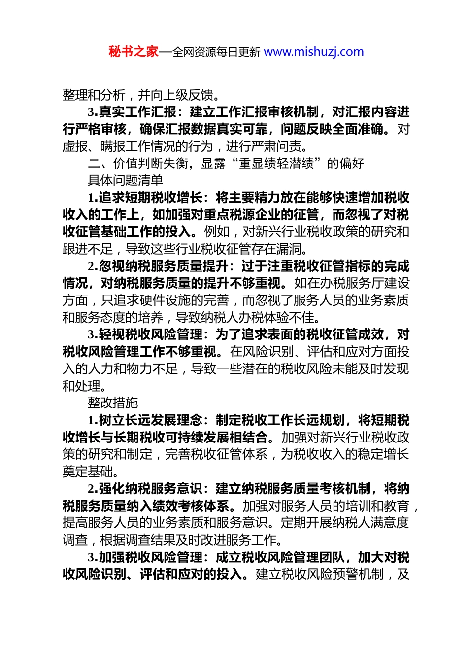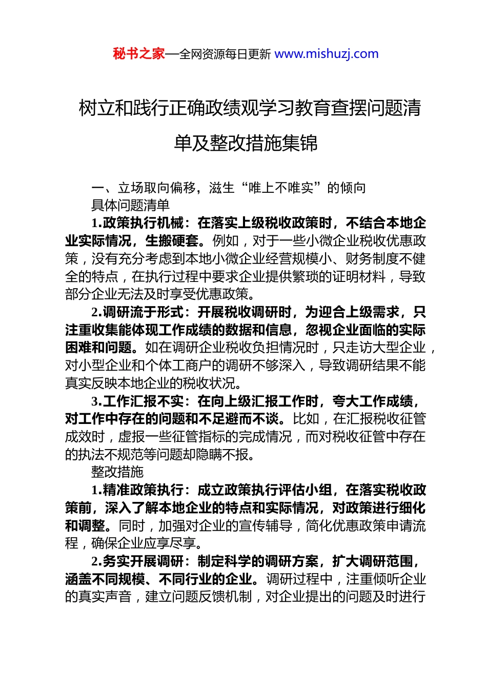 秘书之家—全网资源每日更新 www.mishuzj.com树立和践行正确政绩观学习教育查摆问题清单及整改措施集锦 一、立场取向偏移,滋生“唯上不唯实”的倾向具体问题清单1.政策执行机械:在落实上级税收政策时,不结合本地企业实际情况,生搬硬套。例如,对于一些小微企业税收优惠政策,没有充分考虑到本地小微企业经营规模小、财务制度不健全的特点,在执行过程中要求企业提供繁琐的证明材料,导致部分企业无法及时享受优惠政策。2.调研流于形式:开展税收调研时,为迎合上级需求,只注重收集能体现工作成绩的数据和信息,忽视企业面临的实际困难和问题。如在调研企业税收负担情况时,只走访大型企业,对小型企业和个体工商户的调研不够深入,导致调研结果不能真实反映本地企业的税收状况。3.工作汇报不实:在向上级汇报工作时,夸大工作成绩,对工作中存在的问题和不足避而不谈。比如,在汇报税收征管成效时,虚报一些征管指标的完成情况,而对税收征管中存在的执法不规范等问题却隐瞒不报。整改措施1.精准政策执行:成立政策执行评估小组,在落实税收政策前,深入了解本地企业的特点和实际情况,对政策进行细化和调整。同时,加强对企业的宣传辅导,简化优惠政策申请流程,确保企业应享尽享。2.务实开展调研:制定科学的调研方案,扩大调研范围,涵盖不同规模、不同行业的企业。调研过程中,注重倾听企业的真实声音,建立问题反馈机制,对企业提出的问题及时进行秘书之家—全网资源每日更新 www.mishuzj.com整理和分析,并向上级反馈。3.真实工作汇报:建立工作汇报审核机制,对汇报内容进行严格审核,确保汇报数据真实可靠,问题反映全面准确。对虚报、瞒报工作情况的行为,进行严肃问责。二、价值判断失衡,显露“重显绩轻潜绩”的偏好具体问题清单1.追求短期税收增长:将主要精力放在能够快速增加税收收入的工作上,如加强对重点税源企业的征管,而忽视了对税收征管基础工作的投入。例如,对新兴行业税收政策的研究和跟进不足,导致这些行业税收征管存在漏洞。2.忽视纳税服务质量提升:过于注重税收征管指标的完成情况,对纳税服务质量的提升不够重视。如在办税服务厅建设方面,只追求硬件设施的完善,而忽视了服务人员的业务素质和服务态度的培养,导致纳税人办税体验不佳。3.轻视税收风险管理:为了追求表面的税收征管成效,对税收风险管理工作不够重视。在风险识别、评估和应对方面投入的人力和物力不足,导致一些潜在的税收风险未能及时发现和处理。整改措施1.树立长远发展理念:制定税收工作长远规划,将短期税收增长与长期税收可持续发展相结合。加强对新兴行业税收政策的研究和制定,完善税收征管体系,为税收收入的稳定增长奠定基础。2.强化纳税服务意识:建立纳税服务质量考核机制,将纳税服务质量纳入绩效考核体系。加强对服务人员的培训和教育,提高服务人员的业务素质和服务意识。定期开展纳税人满意度调查,根据调查结果及时改进服务工作。3.加强税收风险管理:成立税收风险管理团队,加大对税收风险识别、评估和应对的投入。建立税收风险预警机制,及秘书之家—全网资源每日更新 www.mishuzj.com时发现和处理潜在的税收风险。加强与其他部门的协作配合,形成税收风险管理合力。三、推进方式走偏,暴露“重形式轻实效”的问题具体问题清单1.工作落实走过场:在推进税收工作时,只注重形式,不注重实际效果。例如,在开展税收宣传月活动时,只是简单地发放宣传资料、举办几场讲座,没有真正将税收政策宣传到纳税人心中,纳税人对税收政策的知晓率和理解度没有得到有效提高。2.会议文件过多过滥:以会议落实会议、以文件落实文件的现象较为严重,导致基层税务干部将大量时间和精力耗费在会议和文件上,真正用于实际工作的时间减少。比如,一些会议内容空洞,缺乏针对性和可操作性,会议开完后没有实际效果。3.工作创新形式化:在工作创新方面,只追求创新的形式,不注重创新的实际效果。例如,推出一些新的办税服务举措,但在实际运行过程中,由于缺乏充分的调研和论证,导致这些举措无法满足纳税人的实际需求,反而增加了纳税人的办税负担。整改措施1.注重工作实效...