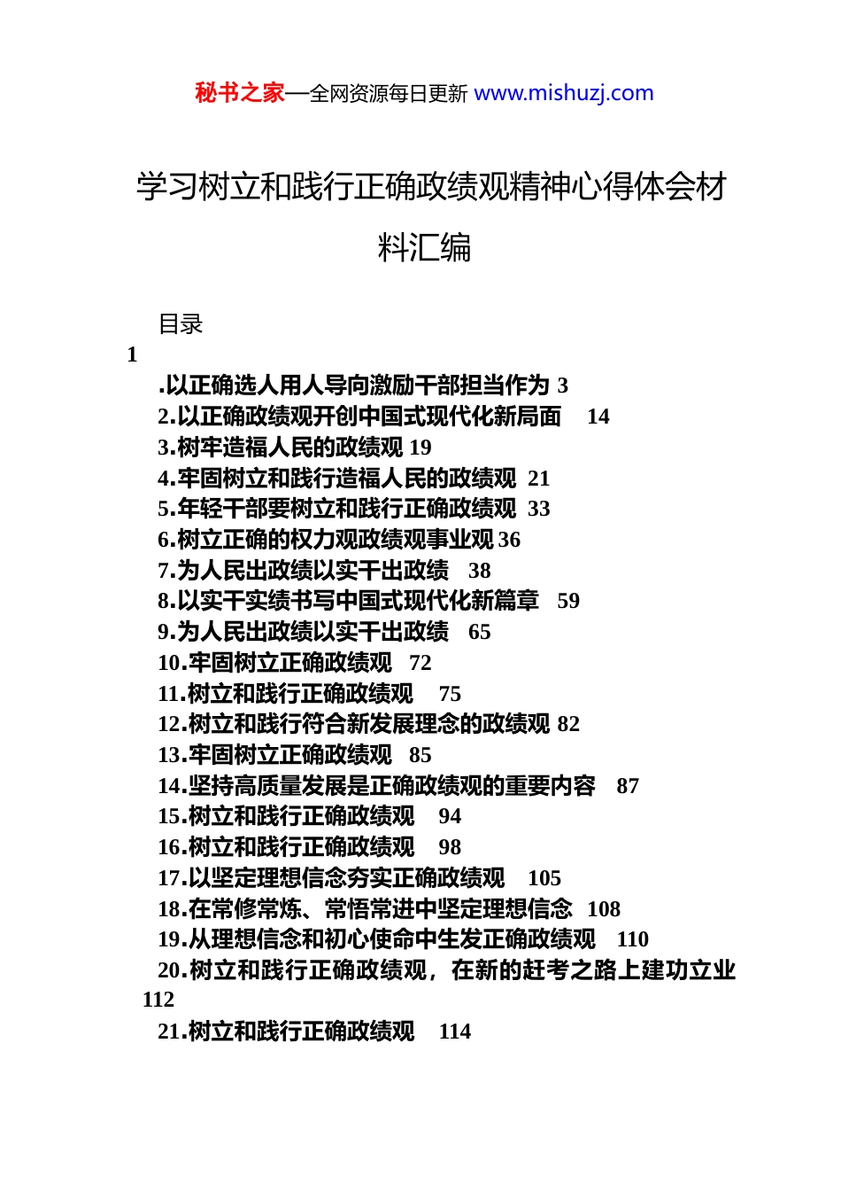 秘书之家—全网资源每日更新 www.mishuzj.com学习树立和践行正确政绩观精神心得体会材料汇编 目录1.以正确选人用人导向激励干部担当作为 32.以正确政绩观开创中国式现代化新局面143.树牢造福人民的政绩观 194.牢固树立和践行造福人民的政绩观 215.年轻干部要树立和践行正确政绩观 336.树立正确的权力观政绩观事业观 367.为人民出政绩以实干出政绩388.以实干实绩书写中国式现代化新篇章599.为人民出政绩以实干出政绩6510.牢固树立正确政绩观 7211.树立和践行正确政绩观7512.树立和践行符合新发展理念的政绩观 8213.牢固树立正确政绩观 8514.坚持高质量发展是正确政绩观的重要内容8715.树立和践行正确政绩观9416.树立和践行正确政绩观9817.以坚定理想信念夯实正确政绩观10518.在常修常炼、常悟常进中坚定理想信念 10819.从理想信念和初心使命中生发正确政绩观11020.树立和践行正确政绩观,在新的赶考之路上建功立业11221.树立和践行正确政绩观114秘书之家—全网资源每日更新 www.mishuzj.com秘书之家—全网资源每日更新 www.mishuzj.com以正确选人用人导向激励干部担当作为选好人、用对人是头等大事。习近平总书记强调,贯彻落实好党中央重大决策部署,关键在人,要把真正忠诚可靠、表里如一、担当尽责的好干部用起来。2026 年是中国共产党成立105 周年,是“十五五”开局之年。鲜明树立选人用人正确导向,着力锻造堪当时代重任的领导班子和干部队伍,引导干部树立和践行正确政绩观,有效激发干部队伍内生动力和整体活力,是深入贯彻落实新时代党的建设总要求和新时代党的组织路线的内在要求,是贯彻新发展理念推动高质量发展、应对世界百年未有之大变局加速演进新挑战的现实需要,对坚持和加强党的全面领导,调动全党积极性主动性创造性,不断巩固党的长期执政地位、更好实现党的执政使命具有十分重要的意义。一党的十八大以来,习近平总书记高度重视以正确选人用人导向激励干部担当作为,将选好人、用对人放在管党治党、治国理政的突出位置来抓,作出一系列重要论述,为以正确选人用人导向引领干部干事创业提供了根本遵循。深刻阐明了以正确选人用人导向激励干部担当作为的重大意义。习近平总书记强调,用人导向最重要、最根本、也最管用,对干部最大的激励是正确用人导向。用好一个人能激励一大片,用一贤人则群贤毕至,见贤思齐就蔚然成风。选什么人就是风向标,就有什么样的干部作风,乃至就有什么样的党风。要把树立正确选人用人导向作为重要着力点,对敢于负责、勇于担当、善于作为、实绩突出的干部,及时大胆用起来,营造积极健康、干事创业的政治生态和良好环境。深刻阐明了正确选人用人导向的内涵标准。在 2013 年的全国组织工作会议上,习近平总书记鲜明提出“信念坚定、为民服务、勤政务实、敢于担当、清正廉洁”的新时代好干部标准,此后又在不同场合提出“三严三实”、“四有”、“四个铁一秘书之家—全网资源每日更新 www.mishuzj.com般”、“五个自觉”、“五个过硬”等具体要求。强调要在选人用人上体现讲担当、重担当的鲜明导向,把敢不敢扛事、愿不愿做事、能不能干事作为识别干部、评判优劣、奖惩升降的重要标准,把干部干了什么事、干了多少事、干的事组织和群众认不认可作为选拔干部的根本依据。深刻阐明了以正确选人用人导向引领干部干事创业的方法路径。习近平总书记强调,要坚持事业需要什么样的人就选什么样的人,岗位缺什么样的人就配什么样的人,不能论资排辈、平衡照顾,正确把握事业发展需要和干部成长进步的关系,把合适的干部放到合适的岗位上。要坚持全面、历史、辩证看干部,注重一贯表现和全部工作,既看发展又看基础,既看显绩又看潜绩。要建立日常考核、分类考核、近距离考核的知事识人体系,强化分类考核,近距离接触干部,使选出来的干部组织放心、群众满意、干部服气。要完善差异化考核评价体系,引导干部树立和践行正确政绩观,推动干部能上能下、能进能出,形成能者上、优者奖、庸者下、劣者汰的良好局面。深刻阐明了以正确选人用人导向激励干部担当作为的纪律要求。习近平总书记强调,端正用人导向是严肃党内政治生活...