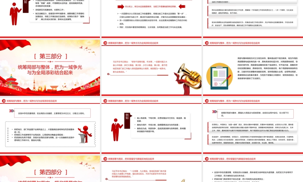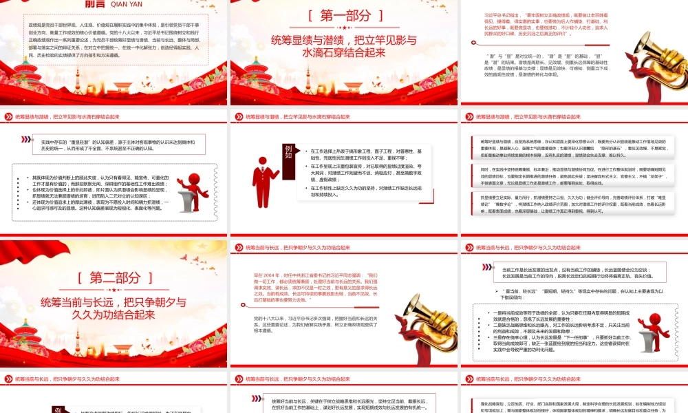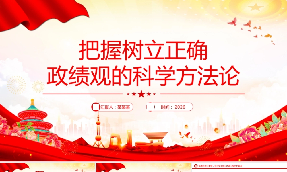 把握树立正确政绩观的科学方法论汇报人:某某某时间: 2026前言 QIAN YAN政绩观是党员干部世界观、人生观、价值观在履职实践中的集中体现,是引领党员干部干事创业方向、衡量工作成效的核心价值遵循。党的十八大以来,习近平总书记围绕树立和践行正确政绩观作出一系列重要论述,为党员干部统筹好显绩与潜绩、当前与长远、整体与局部、部署与落实之间的辩证关系,在对立中把握统一、在统一中化解张力,创造经得起实践、人民、历史检验的实绩提供了方向指引和方法遵循。统筹显绩与潜绩,把立竿见影与水滴石穿结合起来[ 第一部分 ]统筹显绩与潜绩,把立竿见影与水滴石穿结合起来习近平总书记指出,“要牢固树立正确政绩观,既要做让老百姓看得见、摸得着、得实惠的实事,也要做为后人作铺垫、打基础、利长远的好事,既要做显功,也要做潜功,不计较个人功名,追求人民群众的好口碑、历史沉淀之后真正的评价”。“ 潜”与“显”是对立统一的,“潜”是“显”的基础,“显”是“潜”的结果。潜绩是周期长、见效缓、侧重长远保障的基础性政绩,是显绩的根基与支撑;显绩是见效快、可感知、侧重当下成效的直观性政绩,是潜绩的转化与体现。统筹显绩与潜绩,把立竿见影与水滴石穿结合起来实践中存在的“重显轻潜”的认知偏差,源于主体对客观事物的认识未达到具体和历史的统一,从而形成了不全面、不系统甚至不正确的认知。 •其既体现为价值判断上的顾此失彼,认为只有看得见、能宣传、可量化的工作才是有价值的,而那些默默无闻、深耕细作的基础性工作难出政绩;•也体现为价值选择上的非此即彼,即片面认为抓潜绩会影响显绩的呈现,抓显绩就无法兼顾潜绩的培育,进而陷入二元对立的认知误区;•还体现为价值追求上的厚此薄彼,表现为不愿投入时间和精力抓潜绩,一心追求可感可及的显绩。这种认知偏差表现为短视化、表面化等问题。统筹显绩与潜绩,把立竿见影与水滴石穿结合起来•在工作选择上热衷于搞形象工程、面子工程,对普惠性、基础性、兜底性民生潜绩工作则投入不足、重视不够;•在工作呈现上注重包装宣传,对已取得的显绩过度渲染、夸大其词,对潜绩工作则避而不谈、消极应付,甚至搞数字政绩、虚假政绩;•在工作韧性上缺乏久久为功的坚持,对潜绩工作缺乏长远规划和持续投入。例如统筹显绩与潜绩,把立竿见影与水滴石穿结合起来统筹好显绩与潜绩,应坚持系统思维,在认知层面上要深化思想认识,既要充分认识显绩是推动工作落地见效的重要体现,是凝聚人心、鼓舞士气的重要载体;也要深刻认识潜绩如同“隐形的基石”,看似见效慢、不易察觉,但却是推动事业持续发展的根本保障,没有扎实的潜绩,显绩就会失去支撑、难以持久。同时,在实践中坚持统筹兼顾、标本兼治,推动显绩与潜绩协同互促。在进行工作整体规划时,既要明确短期见效的显绩目标,也要制定长期推进的潜绩任务,避免顾此失彼;坚决摒弃形式主义、官僚主义,不搞“花架子”、不做表面文章,无论是显绩工作还是潜绩工作,都要落到实处、取得实效。抓显绩要立足实际、量力而行,抓潜绩要持之以恒、久久为功;健全评价导向,完善政绩评价体系,打破“唯显绩论”“唯数字论”,将潜绩工作纳入政绩评价范围,加大对潜绩工作的评价权重,既看当前成效,也看长远影响,既看表面成绩,也看深层基础,让潜绩工作真正得到重视、得到认可。统筹当前与长远,把只争朝夕与久久为功结合起来[ 第二部分 ]统筹当前与长远,把只争朝夕与久久为功结合起来早在 2004 年,时任中共浙江省委书记的习近平同志强调:“我们做一切工作,都必须统筹兼顾,处理好当前与长远的关系。我们强调求实效、谋长远,求的不仅是一时之效,更有意义的是求得长远之效。当前有成效、长远可持续的事要放胆去做,当前不见效、长远打基础的事也要努力去做。”党的十八大以来,习近平总书记多次强调,把握好当前和长远的关系。这些重要论述,为我们破解实践矛盾、树立正确政绩观提供了根本遵循。统筹当前与长远,把只争朝夕与久久为功结合起来当前工作是长远发展的出发点,没有当前工作的铺垫,长远蓝图便会沦为空谈;长远发展是当前工作的导向,...