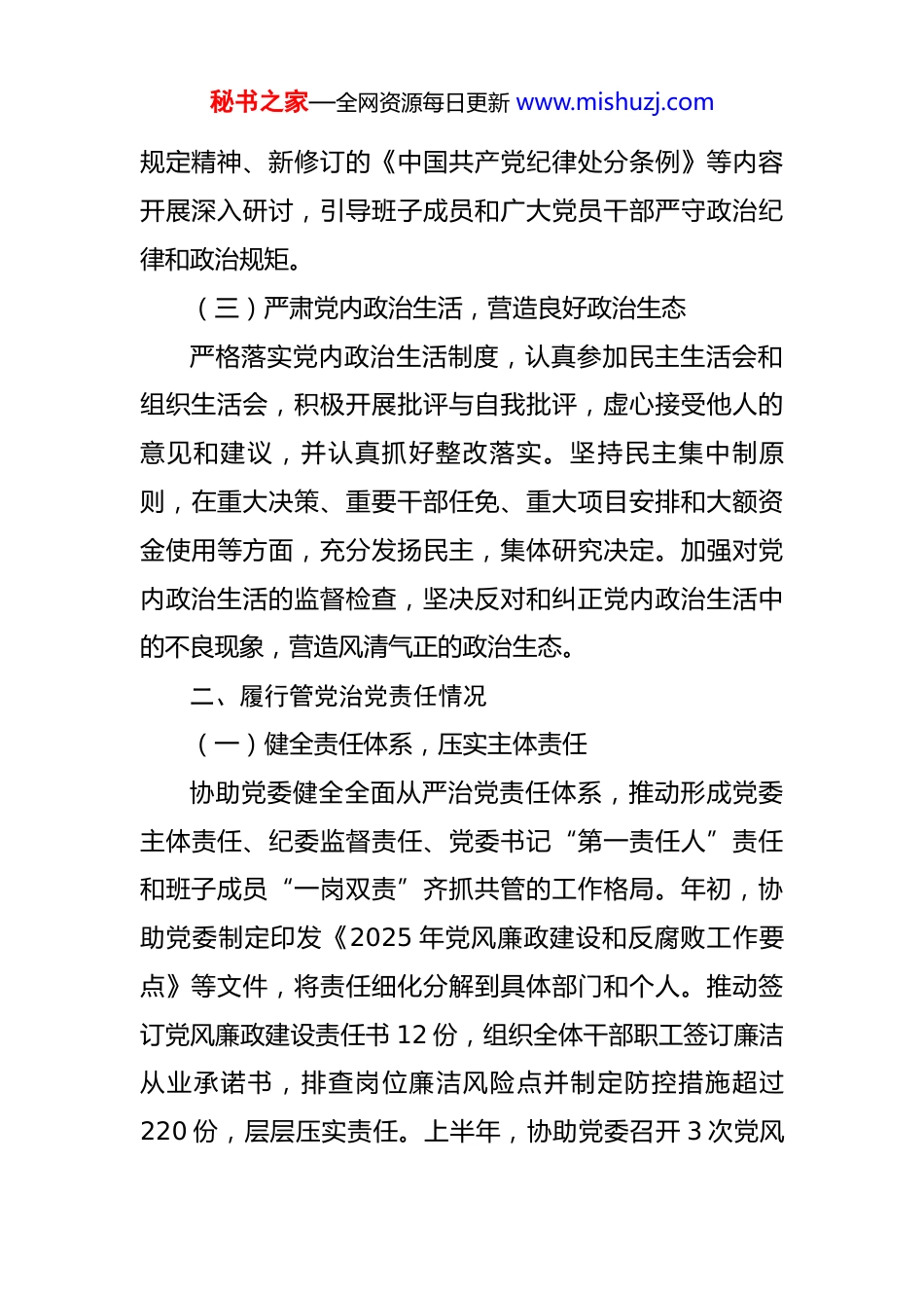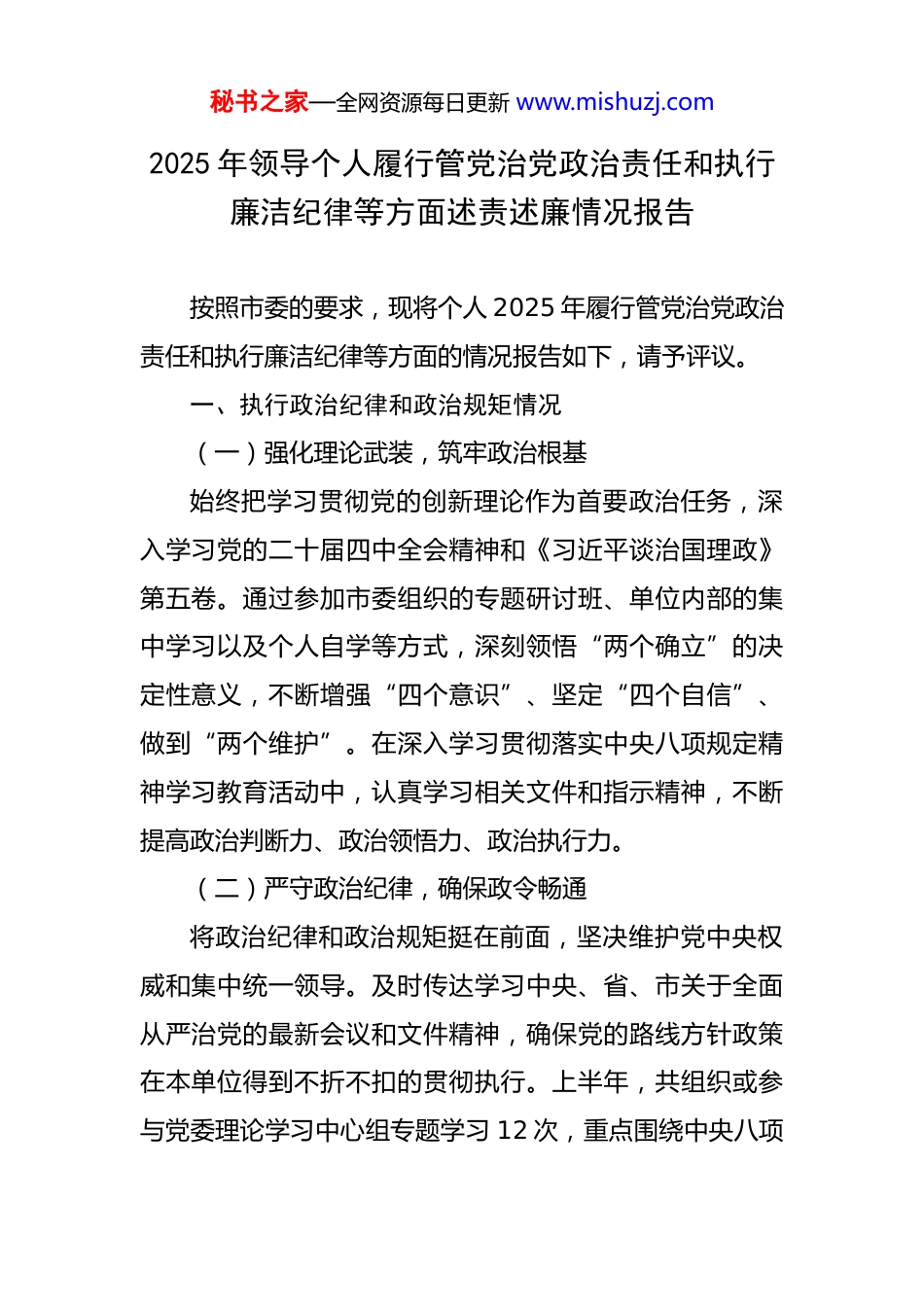 秘书之家—全网资源每日更新 www.mishuzj.com2025 年领导个人履行管党治党政治责任和执行廉洁纪律等方面述责述廉情况报告 按照市委的要求,现将个人 2025 年履行管党治党政治责任和执行廉洁纪律等方面的情况报告如下,请予评议。一、执行政治纪律和政治规矩情况(一)强化理论武装,筑牢政治根基始终把学习贯彻党的创新理论作为首要政治任务,深入学习党的二十届四中全会精神和《习近平谈治国理政》第五卷。通过参加市委组织的专题研讨班、单位内部的集中学习以及个人自学等方式,深刻领悟“两个确立”的决定性意义,不断增强“四个意识”、坚定“四个自信”、做到“两个维护”。在深入学习贯彻落实中央八项规定精神学习教育活动中,认真学习相关文件和指示精神,不断提高政治判断力、政治领悟力、政治执行力。(二)严守政治纪律,确保政令畅通将政治纪律和政治规矩挺在前面,坚决维护党中央权威和集中统一领导。及时传达学习中央、省、市关于全面从严治党的最新会议和文件精神,确保党的路线方针政策在本单位得到不折不扣的贯彻执行。上半年,共组织或参与党委理论学习中心组专题学习 12 次,重点围绕中央八项秘书之家—全网资源每日更新 www.mishuzj.com规定精神、新修订的《中国共产党纪律处分条例》等内容开展深入研讨,引导班子成员和广大党员干部严守政治纪律和政治规矩。(三)严肃党内政治生活,营造良好政治生态严格落实党内政治生活制度,认真参加民主生活会和组织生活会,积极开展批评与自我批评,虚心接受他人的意见和建议,并认真抓好整改落实。坚持民主集中制原则,在重大决策、重要干部任免、重大项目安排和大额资金使用等方面,充分发扬民主,集体研究决定。加强对党内政治生活的监督检查,坚决反对和纠正党内政治生活中的不良现象,营造风清气正的政治生态。二、履行管党治党责任情况(一)健全责任体系,压实主体责任协助党委健全全面从严治党责任体系,推动形成党委主体责任、纪委监督责任、党委书记“第一责任人”责任和班子成员“一岗双责”齐抓共管的工作格局。年初,协助党委制定印发《2025 年党风廉政建设和反腐败工作要点》等文件,将责任细化分解到具体部门和个人。推动签订党风廉政建设责任书 12 份,组织全体干部职工签订廉洁从业承诺书,排查岗位廉洁风险点并制定防控措施超过220 份,层层压实责任。上半年,协助党委召开 3 次党风秘书之家—全网资源每日更新 www.mishuzj.com廉政建设专题研究会,对重要工作亲自部署、重大问题亲自过问,确保责任落到实处。(二)加强干部教育管理,打造高素质队伍加强对干部的思想政治教育,通过开展主题党日活动、廉政教育讲座、观看警示教育片等形式,提高干部的政治觉悟和廉洁自律意识。组织干部深入学习党的二十届四中全会精神和《习近平谈治国理政》第五卷,引导干部树立正确的世界观、人生观和价值观。加强干部业务培训,定期组织业务学习和技能竞赛,提高干部的业务水平和工作能力。严格干部选拔任用标准和程序,坚持德才兼备、以德为先,选拔任用忠诚干净担当的干部。(三)落实意识形态工作责任制将意识形态工作纳入重要议事日程,定期研究分析意识形态领域形势,制定意识形态工作方案和措施。加强对单位宣传阵地的管理,规范信息发布审核流程,确保发布的信息符合党的路线方针政策和国家法律法规。加强对干部职工的思想引导,通过开展谈心谈话、组织专题讨论等形式,及时了解干部职工的思想动态,引导干部职工树立正确的思想观念。上半年,组织开展意识形态专题学习 5次,对意识形态工作进行专项检查 2 次。三、推进党风廉政建设和反腐败工作情况秘书之家—全网资源每日更新 www.mishuzj.com(一)加强廉政教育,增强廉洁意识坚持把廉洁教育作为一体推进“三不腐”的基础性工程来抓。以深入贯彻中央八项规定精神学习教育为契机,牵头组织开展形式多样的警示教育活动 9 次,内容涵盖节前廉政提醒谈话、专题讲座、观看警示教育片及学习典型案例通报等。上半年,累计开展各层级谈心谈话 9 次,重点覆盖新任职干部、关键岗位人员等,做到早提醒、早纠正。充分运用单位微信公众号等新...