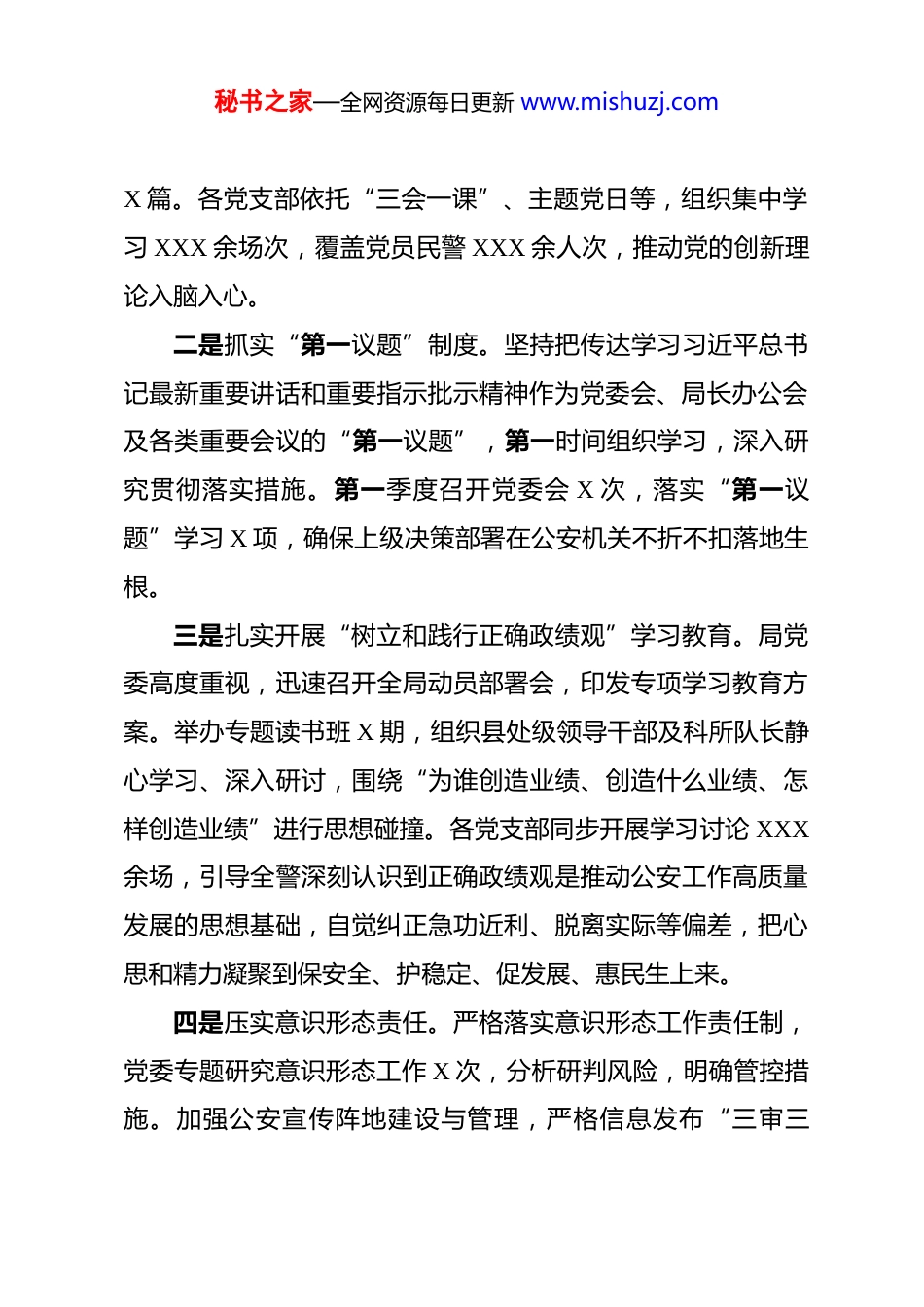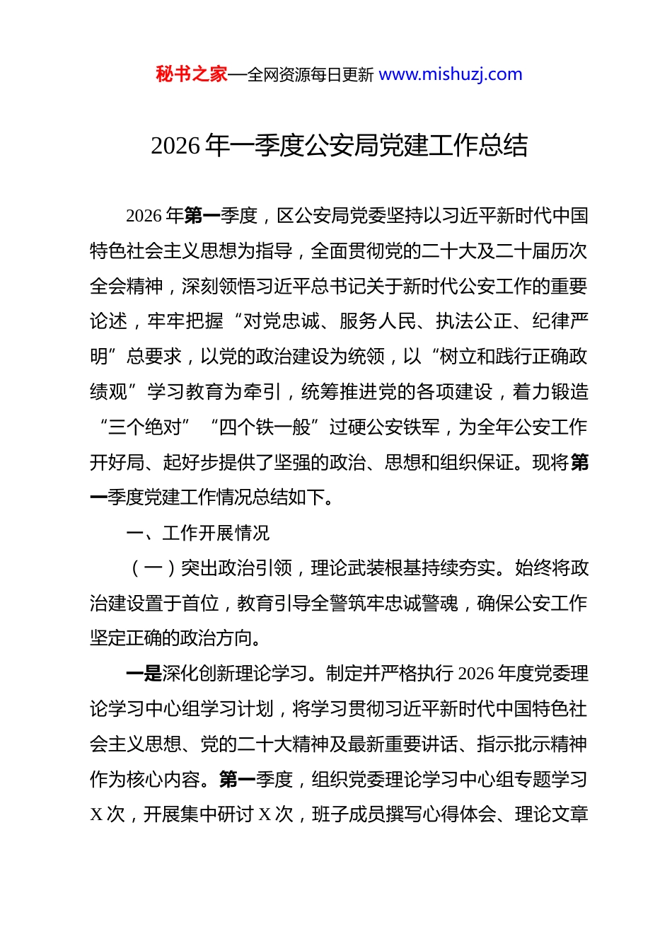 秘书之家—全网资源每日更新 www.mishuzj.com2026 年一季度公安局党建工作总结 2026 年第一季度,区公安局党委坚持以习近平新时代中国特色社会主义思想为指导,全面贯彻党的二十大及二十届历次全会精神,深刻领悟习近平总书记关于新时代公安工作的重要论述,牢牢把握“对党忠诚、服务人民、执法公正、纪律严明”总要求,以党的政治建设为统领,以“树立和践行正确政绩观”学习教育为牵引,统筹推进党的各项建设,着力锻造“三个绝对”“四个铁一般”过硬公安铁军,为全年公安工作开好局、起好步提供了坚强的政治、思想和组织保证。现将第一季度党建工作情况总结如下。一、工作开展情况(一)突出政治引领,理论武装根基持续夯实。始终将政治建设置于首位,教育引导全警筑牢忠诚警魂,确保公安工作坚定正确的政治方向。一是深化创新理论学习。制定并严格执行 2026 年度党委理论学习中心组学习计划,将学习贯彻习近平新时代中国特色社会主义思想、党的二十大精神及最新重要讲话、指示批示精神作为核心内容。第一季度,组织党委理论学习中心组专题学习X 次,开展集中研讨 X 次,班子成员撰写心得体会、理论文章秘书之家—全网资源每日更新 www.mishuzj.comX 篇。各党支部依托“三会一课”、主题党日等,组织集中学习 XXX 余场次,覆盖党员民警 XXX 余人次,推动党的创新理论入脑入心。二是抓实“第一议题”制度。坚持把传达学习习近平总书记最新重要讲话和重要指示批示精神作为党委会、局长办公会及各类重要会议的“第一议题”,第一时间组织学习,深入研究贯彻落实措施。第一季度召开党委会 X 次,落实“第一议题”学习 X 项,确保上级决策部署在公安机关不折不扣落地生根。三是扎实开展“树立和践行正确政绩观”学习教育。局党委高度重视,迅速召开全局动员部署会,印发专项学习教育方案。举办专题读书班 X 期,组织县处级领导干部及科所队长静心学习、深入研讨,围绕“为谁创造业绩、创造什么业绩、怎样创造业绩”进行思想碰撞。各党支部同步开展学习讨论 XXX余场,引导全警深刻认识到正确政绩观是推动公安工作高质量发展的思想基础,自觉纠正急功近利、脱离实际等偏差,把心思和精力凝聚到保安全、护稳定、促发展、惠民生上来。四是压实意识形态责任。严格落实意识形态工作责任制,党委专题研究意识形态工作 X 次,分析研判风险,明确管控措施。加强公安宣传阵地建设与管理,严格信息发布“三审三秘书之家—全网资源每日更新 www.mishuzj.com校”制度,运营的“XX 公安”微信公众号、微博、抖音等平台发布原创稿件、视频 XXX 条,总阅读(播放)量超 XXX 万,有效传播公安正能量。组建青年民警宣讲团,深入社区、学校、企业开展反诈、禁毒、安全防范等主题宣传 XX 场次,发放资料 XXXX 余份,服务群众 XXXX 余人,牢牢掌握意识形态工作主动权。(二)严密组织体系,战斗堡垒作用有效发挥。牢固树立大抓基层、大抓支部的鲜明导向,着力提升基层党组织政治功能和组织功能。一是规范基层组织生活。持续推进党支部标准化规范化建设提质增效,第一季度对全局 XX 个党支部进行全覆盖督导检查,发现问题 XX 个并督促整改到位。严格落实“三会一课”、组织生活会、民主评议党员等制度,全局各党支部召开党员大会 XX 次、支委会 XX 次、党小组会 XX 次,讲授党课 XX 次,开展主题党日活动 XX 次,党内政治生活的“炉火”越烧越旺。二是完成党支部书记述职评议考核。精心组织 2025 年度党支部书记抓基层党建述职评议考核工作,XX 名党支部书记围绕履职情况、存在问题、下一步打算进行现场或书面述职,接受局党委点评和党员群众评议。考核结果作为评先评优、干部选拔任用的重要依据,有效传导了“抓好党建是本职、不抓党秘书之家—全网资源每日更新 www.mishuzj.com建是失职、抓不好党建是不称职”的责任压力。三是实施“强基提能”工程。结合上年度党建考核、述职评议及日常掌握情况,对基层党组织进行分类定级,评定“先进”支部 XX 个、“中间”支部 XX 个。建立“先进带后进”结对帮扶机制,组织结对共建活动 X 次,通过经...