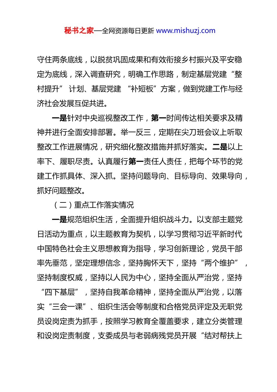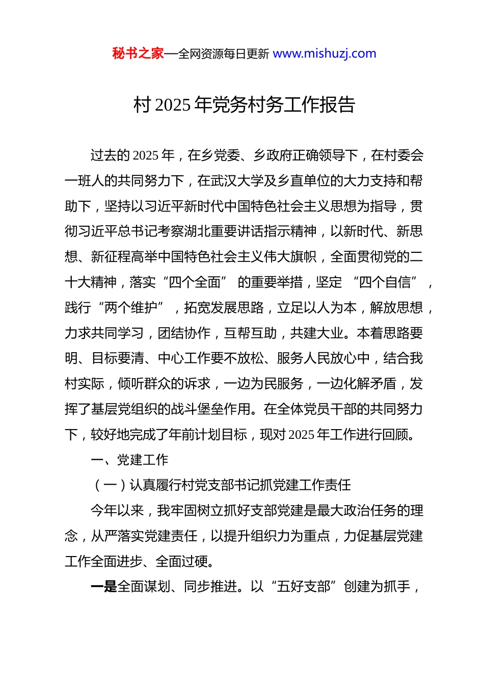 秘书之家—全网资源每日更新 www.mishuzj.com村 2025 年党务村务工作报告 过去的 2025 年,在乡党委、乡政府正确领导下,在村委会一班人的共同努力下,在武汉大学及乡直单位的大力支持和帮助下,坚持以习近平新时代中国特色社会主义思想为指导,贯彻习近平总书记考察湖北重要讲话指示精神,以新时代、新思想、新征程高举中国特色社会主义伟大旗帜,全面贯彻党的二十大精神,落实“四个全面” 的重要举措,坚定 “四个自信”,践行“两个维护”,拓宽发展思路,立足以人为本,解放思想,力求共同学习,团结协作,互帮互助,共建大业。本着思路要明、目标要清、中心工作要不放松、服务人民放心中,结合我村实际,倾听群众的诉求,一边为民服务,一边化解矛盾,发挥了基层党组织的战斗堡垒作用。在全体党员干部的共同努力下,较好地完成了年前计划目标,现对 2025 年工作进行回顾。一、党建工作(一)认真履行村党支部书记抓党建工作责任今年以来,我牢固树立抓好支部党建是最大政治任务的理念,从严落实党建责任,以提升组织力为重点,力促基层党建工作全面进步、全面过硬。一是全面谋划、同步推进。以“五好支部”创建为抓手,秘书之家—全网资源每日更新 www.mishuzj.com守住两条底线,以脱贫巩固成果和有效衔接乡村振兴及平安稳定为底线,深入调查研究,明确工作思路,制定基层党建“整村提升” 计划、基层党建 “补短板”方案,做到党建工作与经济社会发展互促共进。一是针对中央巡视整改工作,第一时间传达相关要求及精神并进行全面安排部署。举一反三,定期在尖刀班会议上听取整改工作进展情况,研究细化整改措施并抓好落实。二是以上率下、履职尽责。认真履行第一责任人责任,把每个环节的党建工作抓具体、深入抓。坚持问题导向、目标导向、效果导向,抓好问题整改。(二)重点工作落实情况一是规范组织生活,全面提升组织战斗力。以支部主题党日活动为重点,以主题教育为契机,以学习贯彻习近平新时代中国特色社会主义思想教育为指导,学习创新理论,党员干部率先垂范,坚定理想信念,坚持胸怀天下,坚持“两个维护”,坚持制度权威,坚持以人民为中心,坚持全面从严治党,坚持“四下基层”,坚持自我革命精神,坚持全面从严治党,以落实“三会一课”、组织生活会等制度和合格党员评定及无职党员设岗定责为抓手,按照学习教育全覆盖要求,建立分类管理和设岗定责制度,支委成员与老弱病残党员开展“结对帮扶上秘书之家—全网资源每日更新 www.mishuzj.com门学”,流动党员通过微信学定期汇报思想,支委按月通报开展情况,通过制度的落实将全村 11 名流动党员纳入有效管理。通过设定“结对帮扶岗”“纠纷调处岗”“环境卫生保护岗”等进一步落实无职党员设岗定责,党员先锋模范作用得到充分发挥。一是以党小组和尖刀班为主体责任,强化激励引导,激发干部活力,发挥好带动作用。二是强化基层组织建设,筑强战斗堡垒。始终坚持“一切工作到支部”的工作理念,把支部建设作为村级发展首要任务。通过盘活村集体资源、资产、资金,入股分红、组建村集体联合经营公司等多渠道增加村集体收入,2025 年实现村级集体经济收入 48.44 万元,同时建立了村级集体经济长期收益的良好运行模式。抓党建促巩固拓展脱贫成果促脱贫户增收,发挥引领作用。二是加强党员干部带头人队伍建设。对村“尖刀班” 干部开展培训,提升综合素质。对全村27 名有履职能力的无职党员明确岗位职责任务,派发任务清单,参与政策宣讲、项目实施、人居环境整治等,基层治理水平显著提升。三是深入开展“不忘初心、牢记使命”坚定信念主题教育。自全面启动以来,全体党员在党支部的精心组织下,紧扣主题教育总要求,按照分类开展原则,把重点措施抓实抓细、落到实处。组织全体党员每月开展集中学习。主题教育期间,秘书之家—全网资源每日更新 www.mishuzj.com党员收集意见建议 3 条,检视问题 7 个,在专题民主生活会上相互提出批评意见 2 条,建立“即知即改、立行立改” 项目 2个,领办实事 3 件,均限期完成。四是强化党风廉政建设,通过党风廉政教育,防范党员干部思想和行为...