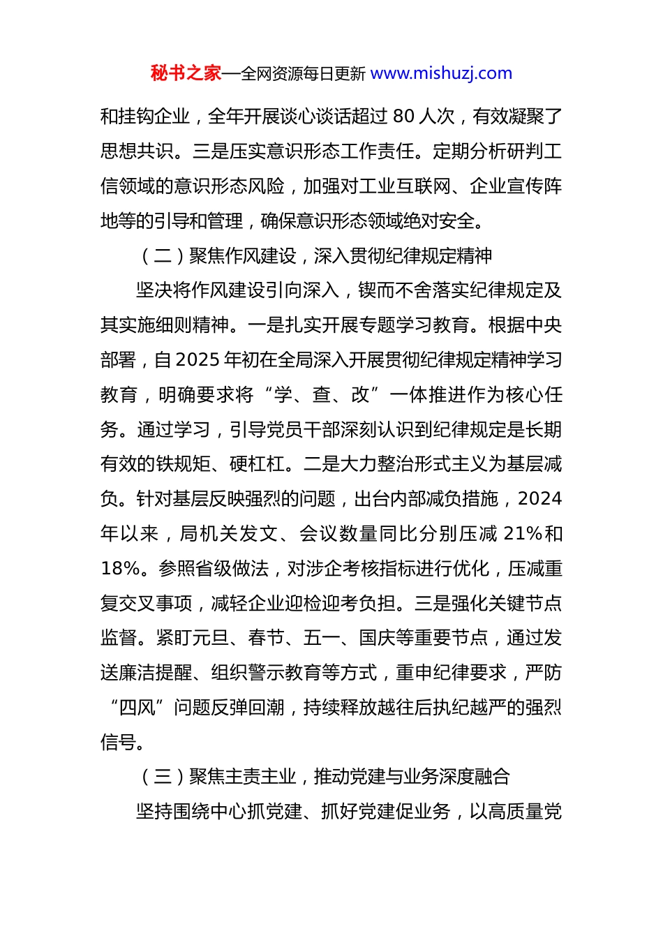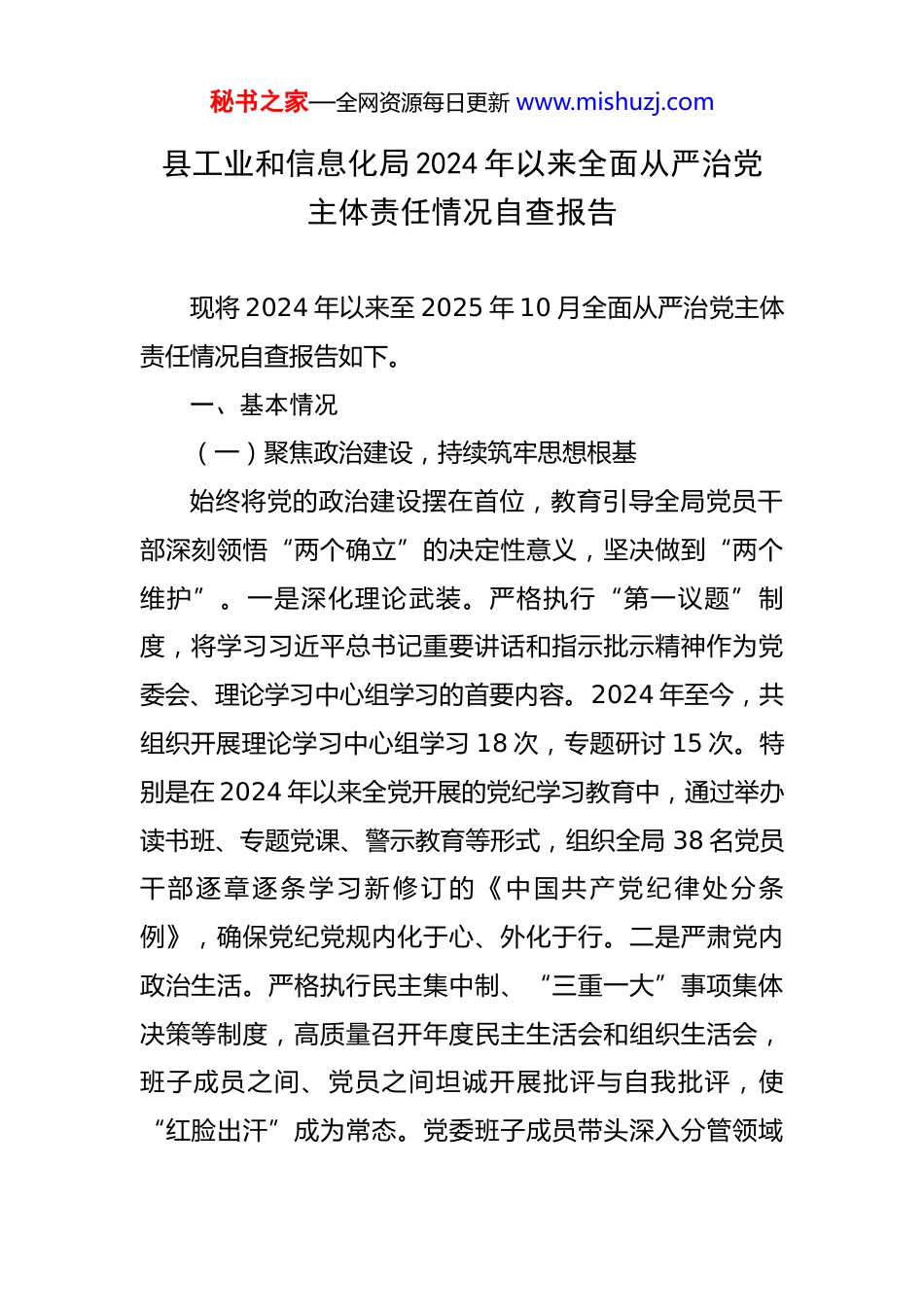 秘书之家—全网资源每日更新 www.mishuzj.com县工业和信息化局 2024 年以来全面从严治党主体责任情况自查报告 现将 2024 年以来至 2025 年 10 月全面从严治党主体责任情况自查报告如下。一、基本情况(一)聚焦政治建设,持续筑牢思想根基始终将党的政治建设摆在首位,教育引导全局党员干部深刻领悟“两个确立”的决定性意义,坚决做到“两个维护”。一是深化理论武装。严格执行“第一议题”制度,将学习习近平总书记重要讲话和指示批示精神作为党委会、理论学习中心组学习的首要内容。2024 年至今,共组织开展理论学习中心组学习 18 次,专题研讨 15 次。特别是在 2024 年以来全党开展的党纪学习教育中,通过举办读书班、专题党课、警示教育等形式,组织全局 38 名党员干部逐章逐条学习新修订的《中国共产党纪律处分条例》,确保党纪党规内化于心、外化于行。二是严肃党内政治生活。严格执行民主集中制、“三重一大”事项集体决策等制度,高质量召开年度民主生活会和组织生活会,班子成员之间、党员之间坦诚开展批评与自我批评,使“红脸出汗”成为常态。党委班子成员带头深入分管领域秘书之家—全网资源每日更新 www.mishuzj.com和挂钩企业,全年开展谈心谈话超过 80 人次,有效凝聚了思想共识。三是压实意识形态工作责任。定期分析研判工信领域的意识形态风险,加强对工业互联网、企业宣传阵地等的引导和管理,确保意识形态领域绝对安全。(二)聚焦作风建设,深入贯彻纪律规定精神坚决将作风建设引向深入,锲而不舍落实纪律规定及其实施细则精神。一是扎实开展专题学习教育。根据中央部署,自 2025 年初在全局深入开展贯彻纪律规定精神学习教育,明确要求将“学、查、改”一体推进作为核心任务。通过学习,引导党员干部深刻认识到纪律规定是长期有效的铁规矩、硬杠杠。二是大力整治形式主义为基层减负。针对基层反映强烈的问题,出台内部减负措施,2024年以来,局机关发文、会议数量同比分别压减 21%和18%。参照省级做法,对涉企考核指标进行优化,压减重复交叉事项,减轻企业迎检迎考负担。三是强化关键节点监督。紧盯元旦、春节、五一、国庆等重要节点,通过发送廉洁提醒、组织警示教育等方式,重申纪律要求,严防“四风”问题反弹回潮,持续释放越往后执纪越严的强烈信号。(三)聚焦主责主业,推动党建与业务深度融合坚持围绕中心抓党建、抓好党建促业务,以高质量党秘书之家—全网资源每日更新 www.mishuzj.com建引领工信事业高质量发展。一是深化法治建设,优化营商环境。深入推进法治政府建设,组织普法宣传队深入*产业园区、*科技公司等重点企业开展“送法进企业”活动超过 10 场次,提供法律咨询和“法治体检”服务,帮助企业提升合规经营能力,以法治力量护航企业发展。二是落实巡视巡察整改。针对 2024 年初县委第一巡察组反馈的 18个问题,局党委(党组)照单全收、立行立改,制定了包含 65 项具体措施的整改方案。截至目前,反馈问题已基本整改到位,并举一反三建立健全了财务管理、项目申报等 5项长效机制。三是服务全面深化改革大局。围绕全县工业产业转型升级,大力推动“智改数转”,引导支持*机械、*食品等 20 多家企业实施技术改造和数字化转型,加快培育新质生产力,将党组织的政治优势转化为推动改革发展的强大动力。四是夯实安全发展底线。初步探索构建工业领域国家安全责任体系,将产业链供应链安全、工业数据安全、网络安全等纳入日常监管范围,组织开展了 2 次针对重点工业企业的网络安全应急演练,提升了风险防范意识和能力。在干部选拔任用和人才工作中,坚持党管干部、党管人才原则,树立鲜明实干导向,提拔重用了 3 名在服务企业、项目攻坚一线表现突出的干部,积极对接引进了 2 名高端制造业领域的专业人才。秘书之家—全网资源每日更新 www.mishuzj.com二、存在的主要问题对照上级要求和企业群众期盼,我局党委(党组)在落实全面从 yan 治党主体责任方面虽取得一定成效,但仍存在一些不容忽视的短板和弱项,亟待在今后的工作中加以解决。(一)政治理论学习的成果转化存在“温差”,深度广度仍...