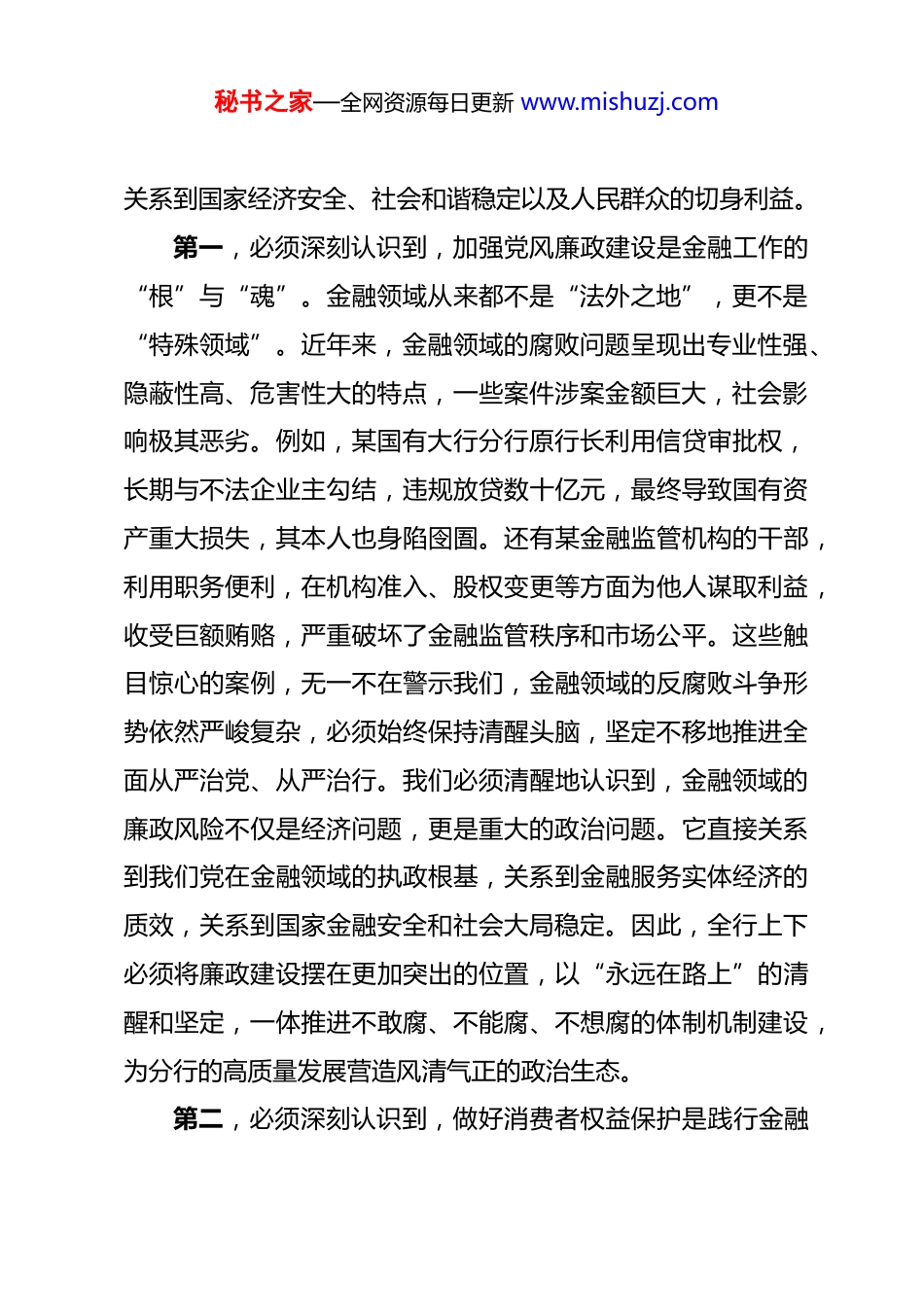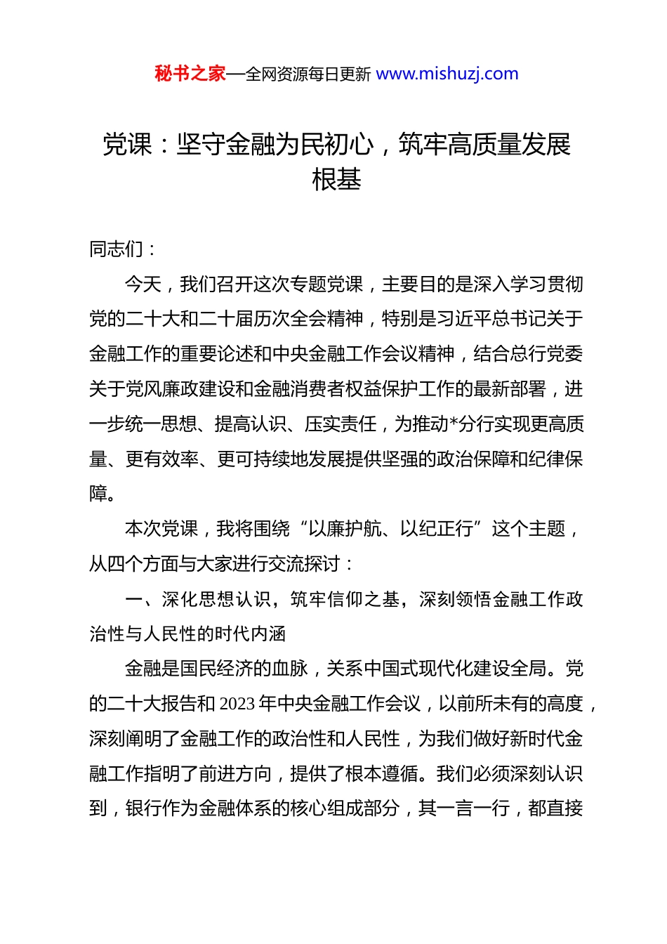 秘书之家—全网资源每日更新 www.mishuzj.com党课:坚守金融为民初心,筑牢高质量发展根基 同志们:今天,我们召开这次专题党课,主要目的是深入学习贯彻党的二十大和二十届历次全会精神,特别是习近平总书记关于金融工作的重要论述和中央金融工作会议精神,结合总行党委关于党风廉政建设和金融消费者权益保护工作的最新部署,进一步统一思想、提高认识、压实责任,为推动*分行实现更高质量、更有效率、更可持续地发展提供坚强的政治保障和纪律保障。本次党课,我将围绕“以廉护航、以纪正行”这个主题,从四个方面与大家进行交流探讨:一、深化思想认识,筑牢信仰之基,深刻领悟金融工作政治性与人民性的时代内涵金融是国民经济的血脉,关系中国式现代化建设全局。党的二十大报告和 2023 年中央金融工作会议,以前所未有的高度,深刻阐明了金融工作的政治性和人民性,为我们做好新时代金融工作指明了前进方向,提供了根本遵循。我们必须深刻认识到,银行作为金融体系的核心组成部分,其一言一行,都直接秘书之家—全网资源每日更新 www.mishuzj.com关系到国家经济安全、社会和谐稳定以及人民群众的切身利益。第一,必须深刻认识到,加强党风廉政建设是金融工作的“根”与“魂”。金融领域从来都不是“法外之地”,更不是“特殊领域”。近年来,金融领域的腐败问题呈现出专业性强、隐蔽性高、危害性大的特点,一些案件涉案金额巨大,社会影响极其恶劣。例如,某国有大行分行原行长利用信贷审批权,长期与不法企业主勾结,违规放贷数十亿元,最终导致国有资产重大损失,其本人也身陷囹圄。还有某金融监管机构的干部,利用职务便利,在机构准入、股权变更等方面为他人谋取利益,收受巨额贿赂,严重破坏了金融监管秩序和市场公平。这些触目惊心的案例,无一不在警示我们,金融领域的反腐败斗争形势依然严峻复杂,必须始终保持清醒头脑,坚定不移地推进全面从严治党、从严治行。我们必须清醒地认识到,金融领域的廉政风险不仅是经济问题,更是重大的政治问题。它直接关系到我们党在金融领域的执政根基,关系到金融服务实体经济的质效,关系到国家金融安全和社会大局稳定。因此,全行上下必须将廉政建设摆在更加突出的位置,以“永远在路上”的清醒和坚定,一体推进不敢腐、不能腐、不想腐的体制机制建设,为分行的高质量发展营造风清气正的政治生态。第二,必须深刻认识到,做好消费者权益保护是践行金融秘书之家—全网资源每日更新 www.mishuzj.com为民的“试金石”。中央金融工作会议明确提出,金融要为经济社会发展提供高质量服务,必须“坚持以人民为中心的价值取向”。消费者权益保护工作,正是我们践行这一宗旨最直接、最具体的体现。它不是一项可有可无的“附加题”,而是关系银行生存发展的“必答题”。当前,监管部门对消保工作的重视程度前所未有。国家金融监督管理总局出台的《金融机构消费者权益保护监管评价办法》,从体制机制、适当性管理、营销行为管理等七个方面,构建了全面、严格的评价体系,并将评价结果与市场准入、现场检查、高管履职评价等直接挂钩。这充分说明,消保工作已经从后台走向前台,从“软指标”变成了“硬约束”。我们必须清醒地看到,随着金融产品的日益复杂化和销售渠道的多样化,消费者面临的信息不对称问题愈发突出。违规收费、捆绑销售、信息泄露、暴力催收等问题时有发生,不仅损害了消费者的合法权益,也严重侵蚀了行业的声誉和公信力。据统计,2025 年全国银行业消费者投诉总量较上一年增长了约 8%,其中涉及理财产品销售误导和个人信息保护的投诉占比超过 40%。这些数据警示我们,消保工作绝不能有丝毫松懈。我们必须将“金融为民”的理念深植于心、外化于行,将保护消费者权益融入业务发展的全过程、各环节,真正做到对客户负责、对社会负责、对未来负责。秘书之家—全网资源每日更新 www.mishuzj.com第三,必须深刻认识到,把握金融工作的政治性与人民性的有机统一,是推动分行高质量发展的根本遵循。政治性决定了金融工作的方向,人民性彰显了金融工作的价值,二者相辅相成、不可分割。从政治性来看,金融是国民经济的血脉,是...