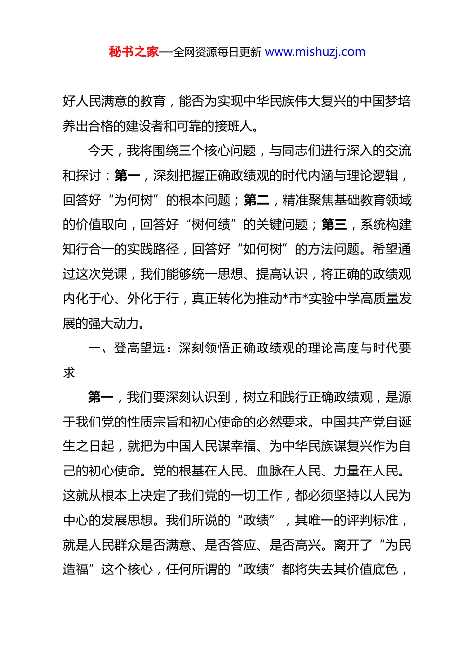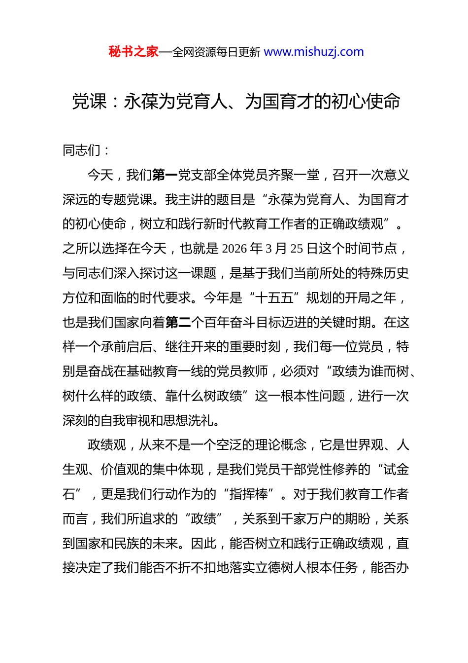 秘书之家—全网资源每日更新 www.mishuzj.com党课:永葆为党育人、为国育才的初心使命 同志们:今天,我们第一党支部全体党员齐聚一堂,召开一次意义深远的专题党课。我主讲的题目是“永葆为党育人、为国育才的初心使命,树立和践行新时代教育工作者的正确政绩观”。之所以选择在今天,也就是 2026 年 3 月 25 日这个时间节点,与同志们深入探讨这一课题,是基于我们当前所处的特殊历史方位和面临的时代要求。今年是“十五五”规划的开局之年,也是我们国家向着第二个百年奋斗目标迈进的关键时期。在这样一个承前启后、继往开来的重要时刻,我们每一位党员,特别是奋战在基础教育一线的党员教师,必须对“政绩为谁而树、树什么样的政绩、靠什么树政绩”这一根本性问题,进行一次深刻的自我审视和思想洗礼。政绩观,从来不是一个空泛的理论概念,它是世界观、人生观、价值观的集中体现,是我们党员干部党性修养的“试金石”,更是我们行动作为的“指挥棒”。对于我们教育工作者而言,我们所追求的“政绩”,关系到千家万户的期盼,关系到国家和民族的未来。因此,能否树立和践行正确政绩观,直接决定了我们能否不折不扣地落实立德树人根本任务,能否办秘书之家—全网资源每日更新 www.mishuzj.com好人民满意的教育,能否为实现中华民族伟大复兴的中国梦培养出合格的建设者和可靠的接班人。今天,我将围绕三个核心问题,与同志们进行深入的交流和探讨:第一,深刻把握正确政绩观的时代内涵与理论逻辑,回答好“为何树”的根本问题;第二,精准聚焦基础教育领域的价值取向,回答好“树何绩”的关键问题;第三,系统构建知行合一的实践路径,回答好“如何树”的方法问题。希望通过这次党课,我们能够统一思想、提高认识,将正确的政绩观内化于心、外化于行,真正转化为推动*市*实验中学高质量发展的强大动力。一、登高望远:深刻领悟正确政绩观的理论高度与时代要求第一,我们要深刻认识到,树立和践行正确政绩观,是源于我们党的性质宗旨和初心使命的必然要求。中国共产党自诞生之日起,就把为中国人民谋幸福、为中华民族谋复兴作为自己的初心使命。党的根基在人民、血脉在人民、力量在人民。这就从根本上决定了我们党的一切工作,都必须坚持以人民为中心的发展思想。我们所说的“政绩”,其唯一的评判标准,就是人民群众是否满意、是否答应、是否高兴。离开了“为民造福”这个核心,任何所谓的“政绩”都将失去其价值底色,秘书之家—全网资源每日更新 www.mishuzj.com甚至会走向人民的反面。在马克思主义的理论谱系中,人民群众是历史的创造者,是社会物质财富和精神财富的创造者,是社会变革的决定性力量。马克思主义唯物史观是我们树立正确政绩观最深厚的理论根源。它告诉我们,权力是人民赋予的,只能用来为人民服务。我们手中的教鞭,承载的不仅仅是知识,更是塑造灵魂、启迪智慧、传承文明的神圣职责。这份权力,归根结底是党和人民赋予我们的信任与重托。因此,我们的“政绩”,就必须是为学生成长、为人民期盼、为国家发展而树立的功绩。任何脱离了这个根本立场,而去追求个人名利、小团体利益,甚至是华而不实的“面子工程”和“数字游戏”的行为,都是对我们党性质宗旨的背叛,也是对马克思主义世界观和方法论的偏离。第二,树立和践行正确政绩观,是推进中国式现代化建设的迫切需要。我们正处在一个伟大的时代,全面建设社会主义现代化国家的宏伟蓝图已经绘就。高质量发展是全面建设社会主义现代化国家的首要任务。何为高质量发展?它绝不仅仅是经济指标的增长,而是经济、政治、文化、社会、生态文明建设“五位一体”的全面进步。在教育领域,高质量发展就是要构建优质均衡的基本公共教育服务体系,全面提高育人质量,促进学生德智体美劳全面发展。这就要求我们必须彻底摒弃那秘书之家—全网资源每日更新 www.mishuzj.com些短视的、功利的、片面的错误政绩观。譬如,有的地方和学校仍然存在着根深蒂固的“教育 GDP”思维,将升学率、特别是名校录取率作为衡量办学水平的唯一标准,甚至不惜以牺牲学生的全面发展和身心健康为代价,搞“题海战术”“掐尖招生”...