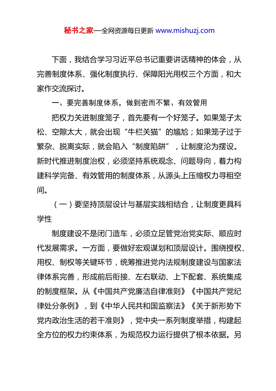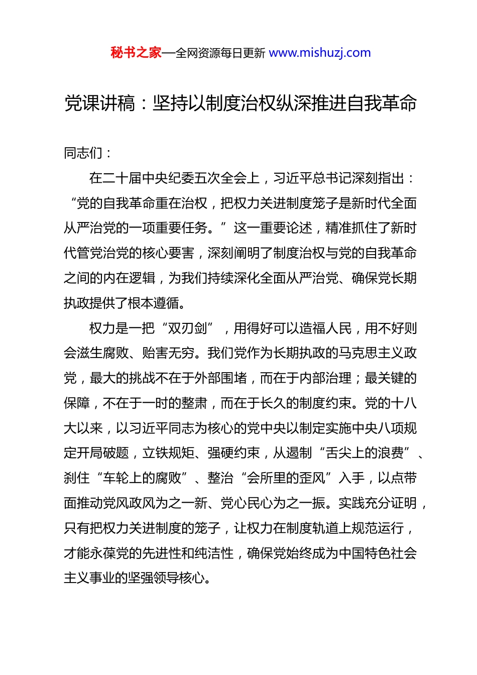 秘书之家—全网资源每日更新 www.mishuzj.com党课讲稿:坚持以制度治权纵深推进自我革命 同志们:在二十届中央纪委五次全会上,习近平总书记深刻指出:“党的自我革命重在治权,把权力关进制度笼子是新时代全面从严治党的一项重要任务。”这一重要论述,精准抓住了新时代管党治党的核心要害,深刻阐明了制度治权与党的自我革命之间的内在逻辑,为我们持续深化全面从严治党、确保党长期执政提供了根本遵循。权力是一把“双刃剑”,用得好可以造福人民,用不好则会滋生腐败、贻害无穷。我们党作为长期执政的马克思主义政党,最大的挑战不在于外部围堵,而在于内部治理;最关键的保障,不在于一时的整肃,而在于长久的制度约束。党的十八大以来,以习近平同志为核心的党中央以制定实施中央八项规定开局破题,立铁规矩、强硬约束,从遏制“舌尖上的浪费”、刹住“车轮上的腐败”、整治“会所里的歪风”入手,以点带面推动党风政风为之一新、党心民心为之一振。实践充分证明,只有把权力关进制度的笼子,让权力在制度轨道上规范运行,才能永葆党的先进性和纯洁性,确保党始终成为中国特色社会主义事业的坚强领导核心。秘书之家—全网资源每日更新 www.mishuzj.com下面,我结合学习习近平总书记重要讲话精神的体会,从完善制度体系、强化制度执行、保障阳光用权三个方面,和大家作交流探讨。一、要完善制度体系,做到密而不繁、有效管用把权力关进制度笼子,首先要有一个好笼子。如果笼子太松、空隙太大,就会出现“牛栏关猫”的尴尬;如果笼子过于繁杂、脱离实际,就会陷入“制度陷阱”,让制度沦为摆设。新时代推进制度治权,必须坚持系统观念、问题导向,着力构建科学完备、有效管用的制度体系,从源头上压缩权力寻租空间。(一)要坚持顶层设计与基层实践相结合,让制度更具科学性制度建设不是闭门造车,必须立足管党治党实际、顺应时代发展需求。一方面,要做好宏观谋划和顶层设计。围绕授权、用权、制权等关键环节,统筹推进党内法规制度建设与国家法律体系完善,形成前后衔接、左右联动、上下配套、系统集成的制度框架。从《中国共产党廉洁自律准则》《中国共产党纪律处分条例》,到《中华人民共和国监察法》《关于新形势下党内政治生活的若干准则》,党中央一系列制度举措,构建起全方位的权力约束体系,为规范权力运行提供了根本依据。另秘书之家—全网资源每日更新 www.mishuzj.com一方面,要尊重基层首创精神。及时把实践中的好经验、好做法上升为制度规范。基层是权力运行的“最后一公里”,也是制度漏洞的“最先发现地”。比如,一些地方探索的权力清单、责任清单、负面清单制度,一些部门推行的重大事项集体决策、全程留痕机制,都是对制度建设的有益补充。只有坚持“从实践中来、到实践中去”,才能让制度既符合中央精神,又贴合基层实际,避免“上下一般粗”、制度与实践“两张皮”的问题。(二)聚焦重点领域和关键环节,让制度更具针对性权力集中、资金密集、资源富集的领域,往往是腐败问题的高发区,也是制度建设的主攻方向。完善制度体系,不能“大水漫灌”,必须紧盯“关键少数”、关键岗位、关键事项,精准发力、靶向施策。一是紧盯“一把手”和领导班子。“一把手”是权力运行的核心,也是监督的重点和难点。要针对“一把手”决策、用人、用钱等行为,完善议事规则和决策程序,严格落实“三重一大”事项集体决策制度,坚决防止个人专断、一言堂。二是紧盯重点领域。聚焦行政审批、工程建设、土地出让、政府采购、国企监管等腐败易发多发领域,细化权力运行流程,压缩自由裁量空间,杜绝暗箱操作。三是紧盯基层“微权力”。基层干部权力不大,但直接面对群众,“微腐秘书之家—全网资源每日更新 www.mishuzj.com败”也可能酿成“大祸害”。要完善基层党务、村务、财务公开制度,规范基层站所、村居干部权力运行,让基层权力始终在制度框架内运行。(三)注重务实管用与精简高效相统一,让制度更具操作性制度的生命力在于好用、管用。习近平总书记强调,制度要“密而不繁、有效管用”,就是要求我们摒弃“制度越多越好”的误区,坚持宁缺毋滥、精益求精,确保...