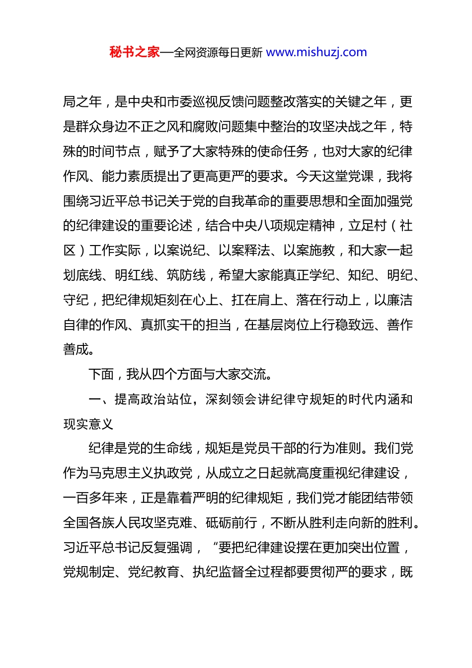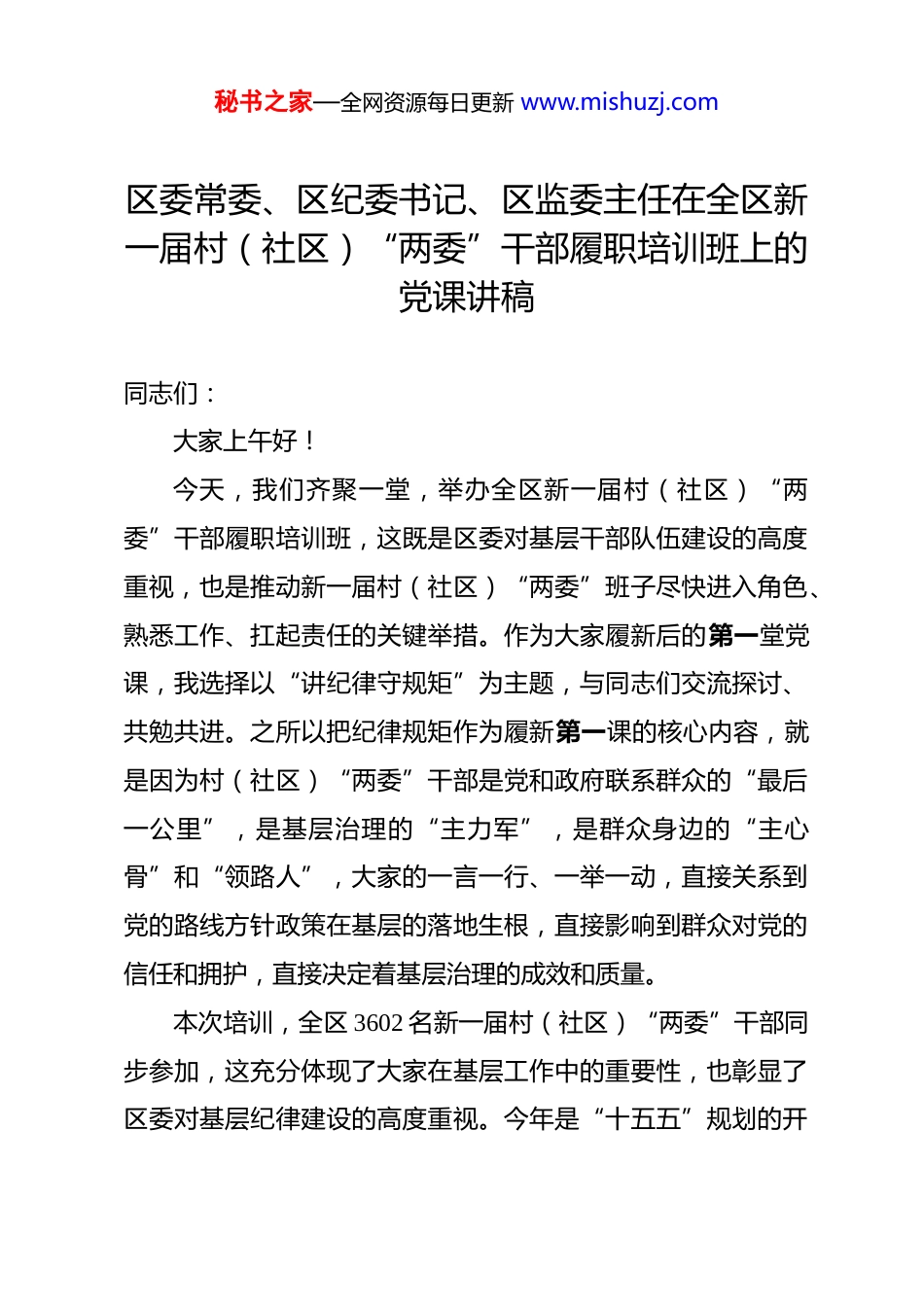 秘书之家—全网资源每日更新 www.mishuzj.com区委常委、区纪委书记、区监委主任在全区新一届村(社区)“两委”干部履职培训班上的党课讲稿 同志们:大家上午好!今天,我们齐聚一堂,举办全区新一届村(社区)“两委”干部履职培训班,这既是区委对基层干部队伍建设的高度重视,也是推动新一届村(社区)“两委”班子尽快进入角色、熟悉工作、扛起责任的关键举措。作为大家履新后的第一堂党课,我选择以“讲纪律守规矩”为主题,与同志们交流探讨、共勉共进。之所以把纪律规矩作为履新第一课的核心内容,就是因为村(社区)“两委”干部是党和政府联系群众的“最后一公里”,是基层治理的“主力军”,是群众身边的“主心骨”和“领路人”,大家的一言一行、一举一动,直接关系到党的路线方针政策在基层的落地生根,直接影响到群众对党的信任和拥护,直接决定着基层治理的成效和质量。本次培训,全区 3602 名新一届村(社区)“两委”干部同步参加,这充分体现了大家在基层工作中的重要性,也彰显了区委对基层纪律建设的高度重视。今年是“十五五”规划的开秘书之家—全网资源每日更新 www.mishuzj.com局之年,是中央和市委巡视反馈问题整改落实的关键之年,更是群众身边不正之风和腐败问题集中整治的攻坚决战之年,特殊的时间节点,赋予了大家特殊的使命任务,也对大家的纪律作风、能力素质提出了更高更严的要求。今天这堂党课,我将围绕习近平总书记关于党的自我革命的重要思想和全面加强党的纪律建设的重要论述,结合中央八项规定精神,立足村(社区)工作实际,以案说纪、以案释法、以案施教,和大家一起划底线、明红线、筑防线,希望大家能真正学纪、知纪、明纪、守纪,把纪律规矩刻在心上、扛在肩上、落在行动上,以廉洁自律的作风、真抓实干的担当,在基层岗位上行稳致远、善作善成。下面,我从四个方面与大家交流。一、提高政治站位,深刻领会讲纪律守规矩的时代内涵和现实意义纪律是党的生命线,规矩是党员干部的行为准则。我们党作为马克思主义执政党,从成立之日起就高度重视纪律建设,一百多年来,正是靠着严明的纪律规矩,我们党才能团结带领全国各族人民攻坚克难、砥砺前行,不断从胜利走向新的胜利。习近平总书记反复强调,“要把纪律建设摆在更加突出位置,党规制定、党纪教育、执纪监督全过程都要贯彻严的要求,既秘书之家—全网资源每日更新 www.mishuzj.com让铁纪‘长牙’、发威,又让干部重视、警醒、知止,使全党形成遵规守纪的高度自觉”。对于我们村(社区)“两委”干部来说,讲纪律守规矩不是抽象的要求,而是具体的行动准则,不是外在的约束,而是内在的立身之本,其时代内涵和现实意义,体现在每一项基层工作、每一次服务群众的过程中。(一)讲纪律守规矩是践行党的自我革命思想的必然要求党的自我革命,是我们党区别于其他政党的显著标志,是我们党永葆生机活力的关键所在。全面从严治党是新时代党的自我革命的伟大实践,而纪律建设则是全面从严治党的治本之策。基层是党的执政根基,基层干部队伍的纪律作风,直接关系到全面从严治党向基层延伸的成效,关系到党的自我革命在基层的落地落实。村(社区)“两委”干部身处基层一线,是党的自我革命在基层的具体实践者和推动者,如果基层干部纪律意识淡薄、规矩观念缺失,就会导致党的路线方针政策在基层执行“打折扣”“搞变通”“做选择”,就会让群众对党的自我革命产生质疑,动摇党的执政根基。新时代新征程,党的自我革命面临着新的形势和挑战,群众身边的不正之风和腐败问题,是影响党的自我革命成效的重要因素。只有我们每一名基层干部都把纪律规矩挺在前面,自觉做到知敬畏、存戒惧、守底线,才能从源头上遏制基层微腐秘书之家—全网资源每日更新 www.mishuzj.com败,才能让党的自我革命在基层落地生根,才能始终保持党同人民群众的血肉联系,确保我们党始终成为中国特色社会主义事业的坚强领导核心。(二)讲纪律守规矩是护航“十五五”开局的坚实保障今年是“十五五”规划的开局之年,开好局、起好步,是全区上下的共同目标。“十五五”规划的各项部署,最终都要落到基层,都要靠我们村...