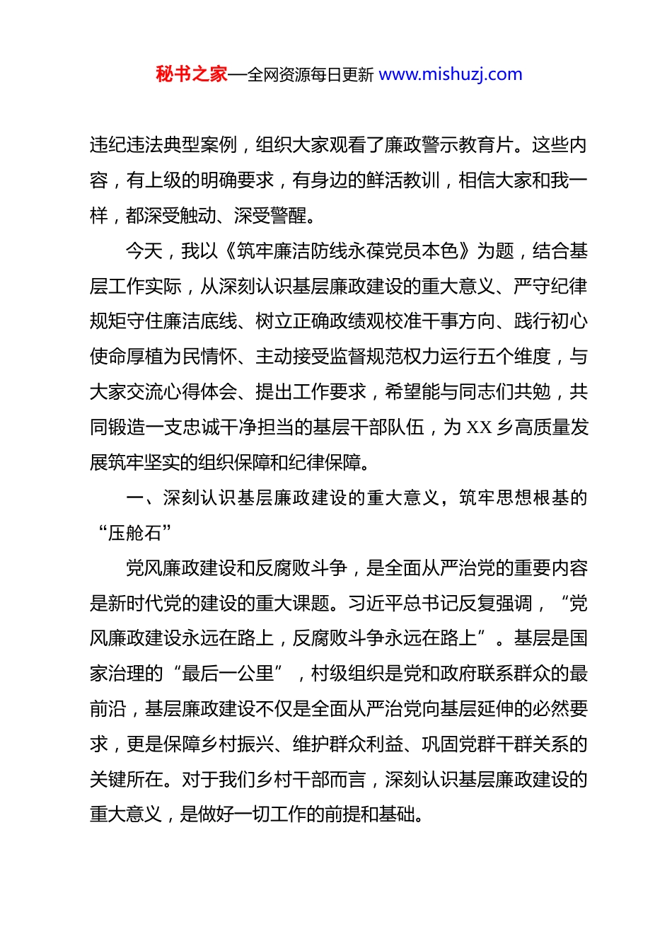 秘书之家—全网资源每日更新 www.mishuzj.com筑牢廉洁防线永葆党员本色——XX 乡党委书记在换届后村干部廉洁教育暨书记讲党课会议上的廉政党课讲稿各位乡村干部同志们:大家上午好!今天,我们齐聚一堂,召开全乡换届后村干部廉洁教育暨书记讲党课会议,这既是贯彻落实上级全面从严治党要求的具体行动,也是针对换届后村干部队伍建设的一次“集中充电”“廉政洗礼”。本次换届,一批同志走上了村级领导岗位,一批同志继续留任担当,这既是组织的信任,更是全乡广大群众的期盼。村干部是乡村振兴的“领头雁”,是基层治理的“主心骨”,更是党和政府联系群众的“桥梁纽带”,换届后队伍的思想状态、纪律意识、作风形象,直接关系到我乡基层治理的成效,关系到乡村振兴战略的落地生根,更关系到党在基层的执政根基。刚才,我们集中学习了习近平总书记关于党风廉政建设和反腐败斗争的重要论述摘编,传达了自治区、XX 市领导干部廉政警示教育会议精神,学习了《XX 区关于加强对“一把手”和领导班子监督的 16 条措施》,也通报了我区近期发生的秘书之家—全网资源每日更新 www.mishuzj.com违纪违法典型案例,组织大家观看了廉政警示教育片。这些内容,有上级的明确要求,有身边的鲜活教训,相信大家和我一样,都深受触动、深受警醒。今天,我以《筑牢廉洁防线永葆党员本色》为题,结合基层工作实际,从深刻认识基层廉政建设的重大意义、严守纪律规矩守住廉洁底线、树立正确政绩观校准干事方向、践行初心使命厚植为民情怀、主动接受监督规范权力运行五个维度,与大家交流心得体会、提出工作要求,希望能与同志们共勉,共同锻造一支忠诚干净担当的基层干部队伍,为 XX 乡高质量发展筑牢坚实的组织保障和纪律保障。一、深刻认识基层廉政建设的重大意义,筑牢思想根基的“压舱石”党风廉政建设和反腐败斗争,是全面从严治党的重要内容是新时代党的建设的重大课题。习近平总书记反复强调,“党风廉政建设永远在路上,反腐败斗争永远在路上”。基层是国家治理的“最后一公里”,村级组织是党和政府联系群众的最前沿,基层廉政建设不仅是全面从严治党向基层延伸的必然要求,更是保障乡村振兴、维护群众利益、巩固党群干群关系的关键所在。对于我们乡村干部而言,深刻认识基层廉政建设的重大意义,是做好一切工作的前提和基础。秘书之家—全网资源每日更新 www.mishuzj.com第一,基层廉政建设是全面从严治党向基层延伸的核心要求。全面从严治党,基础在全面,关键在严,要害在治。“全面”就意味着管全党、治全党,不仅要管住各级领导干部,更要管住基层广大党员干部;不仅要抓好机关单位的党风廉政建设,更要抓好村级组织的廉政建设。村级组织作为党的基层战斗堡垒,是党的路线方针政策落地的最终执行者,如果基层廉政建设抓不好,全面从严治党就会成为“空中楼阁”。近年来,上级党委始终强调“推动全面从严治党向基层延伸、向一线延伸、向群众身边延伸”,就是要把纪律和规矩挺在基层,让基层党员干部知敬畏、存戒惧、守底线。此次换届后,我们及时开展廉洁教育,就是要把全面从严治党的要求传递到每一位村干部,让大家从任职之初就绷紧廉洁之弦,从思想深处树立“不敢腐、不能腐、不想腐”的意识,确保基层党组织始终保持先进性和纯洁性。第二,基层廉政建设是推动乡村振兴战略落地的现实需要。乡村振兴是新时代“三农”工作的总抓手,涉及产业发展、人居环境整治、民生保障、基层治理等方方面面,每一项工作都离不开村干部的组织和落实,每一个环节都涉及到政策、资金、项目的落地。当前,各级财政对乡村振兴的投入持续加大,各项惠民政策不断向基层倾斜,这既为我们乡村发展带来了机遇,秘书之家—全网资源每日更新 www.mishuzj.com也对村干部的廉洁自律提出了更高要求。如果村干部在工作中失守廉洁底线,出现优亲厚友、挪用挤占、吃拿卡要等问题,不仅会让惠民政策打折扣、民生项目落不了地,更会延缓乡村振兴的步伐。只有抓好基层廉政建设,让每一位村干部都做到廉洁用权、干净干事,才能确保乡村振兴的各项资金、项目真正用在刀刃上,真正惠及广大群众,让乡村振兴的成果更...