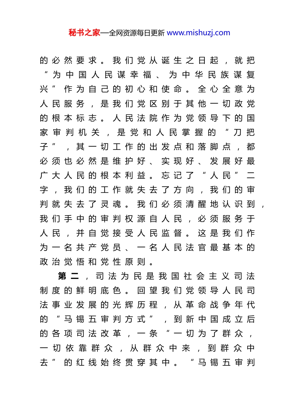 秘书之家—全网资源每日更新 www.mishuzj.com专题党课:司法为民守初心,深耕审判责任田 同 志 们 :今 天 , 我 们 齐 聚 一 堂 , 共 同 探 讨 一 个关 乎 我 们 每 一 位 法 院 干 警 根 本 职 责 与 使 命的 核 心 课 题 。 我 今 天 讲 的 党 课 主 题 是 :“ 司 法 为 民 守 初 心 , 深 耕 审 判 责 任 田 ” 。这 个 主 题 , 前 者 是 我 们 的 精 神 航 标 与 价 值原 点 , 后 者 是 我 们 履 职 尽 责 的 实 践 路 径 与使 命 担 当 。 在 全 面 推 进 依 法 治 国 、 加 快 建设 社 会 主 义 法 治 国 家 的 宏 伟 征 程 中 , 如 何准 确 理 解 和 生 动 实 践 这 十 六 个 字 , 是 我 们必 须 回 答 好 的 时 代 考 题 。一 、 回 溯 源 流 , 深 刻 领 悟 “ 司 法 为民 ” 的 初 心 本 质“ 司 法 为 民 ” 这 四 个 字 , 重 若 千 钧 。 它不 是 一 句 空 洞 的 口 号 , 而 是 深 深 植 根 于 我们 党 的 性 质 宗 旨 、 我 们 国 家 的 人 民 属 性 和我 们 法 院 的 政 治 本 色 之 中 的 。第 一 , 司 法 为 民 是 我 们 党 的 根 本 宗 旨秘书之家—全网资源每日更新 www.mishuzj.com的 必 然 要 求 。 我 们 党 从 诞 生 之 日 起 , 就 把“ 为 中 国 人 民 谋 幸 福 、 为 中 华 民 族 谋 复兴 ” 作 为 自 己 的 初 心 和 使 命 。 全 心 全 意 为人 民 服 务 , 是 我 们 党 区 别 于 其 他 一 切 政 党的 根 本 标 志 。 人 民 法 院 作 为 党 领 导 下 的 国家 审 判 机 关 , 是 党 和 人 民 掌 握 的 “ 刀 把子 ” , 其 一 切 工 作 的 出 发 点 和 落 脚 点 , 都必 须 也 必 然 是 维 护 好 、 实 现 好 、 发 展 好 最广 大 人 民 的 根 本 利 益 。 忘 记 了 “ 人 民 ” 二字 , 我 们 的 工 作 就 失 去 了 方 向 , 我 们 的 审判 就 失 去 了 灵 魂 。 我 们 必 须 清 醒 地 认 识 到 ,我 们 手 中 的 审 判 权 源 自 人 民 , 必 须 服 务 于人 民 , 并 自 觉 接 受 人 民 监 督 。 这 是 我 们 作为 一 名 共 产 党 员 、 一 名 人 民 法 官 最 基 本 的政 治 觉 悟 和 党 性 原 则 。第 二 , 司 法 为 民 是 我 国 社 会 主 义 司 法制 度 的 鲜 明 底 色 。 回 望 我 们 党 领 导 人 民 司法 事 业 发 展 的 光 辉 历 程 , 从 革 命 战 争 年 代的 “ 马 锡 五 审 判 方 式 ” , 到 新 中 国 成 立 后的 各 项 司 法 改 革 , 一 条 “ 一 切 为 了 群 众 ,一 切 依 靠 群 众 , 从 群 众 中 来 , 到 群 众 中去 ” 的 红 线 始 终 贯 穿 其 中 。 “ 马 锡 五 审 判秘书之家—全网资源每日更新 www.mishuzj.com方 式 ” 之 所 以 被 传 为 佳 话 , 核 心 就 在 于 它深 入 群 众 、 调 查 研 究 、 巡 回 办 案 、 就 地 解决 纠 纷 , 把 法 庭 搬 到 了 田 间 地 头 , 把 正 义送 到 了 百 姓 身 边 , 实 现 了 法 理 与 情 理 的 交融 。 这 种 根 植 于 人 民 的 司 法 传 统 , 正 是 我们 今 天 践 行 司 法 为 民 最 宝 贵 的 精 神 财 富 。进 入 新 时 代 , 习 近 平 总 书 记 反 复 强 调 ,“ 要 努 力 让 人 民 群 众 在 每 一 个 司 法 案 件 中感 受 到 公 平 正 义 ” 。...