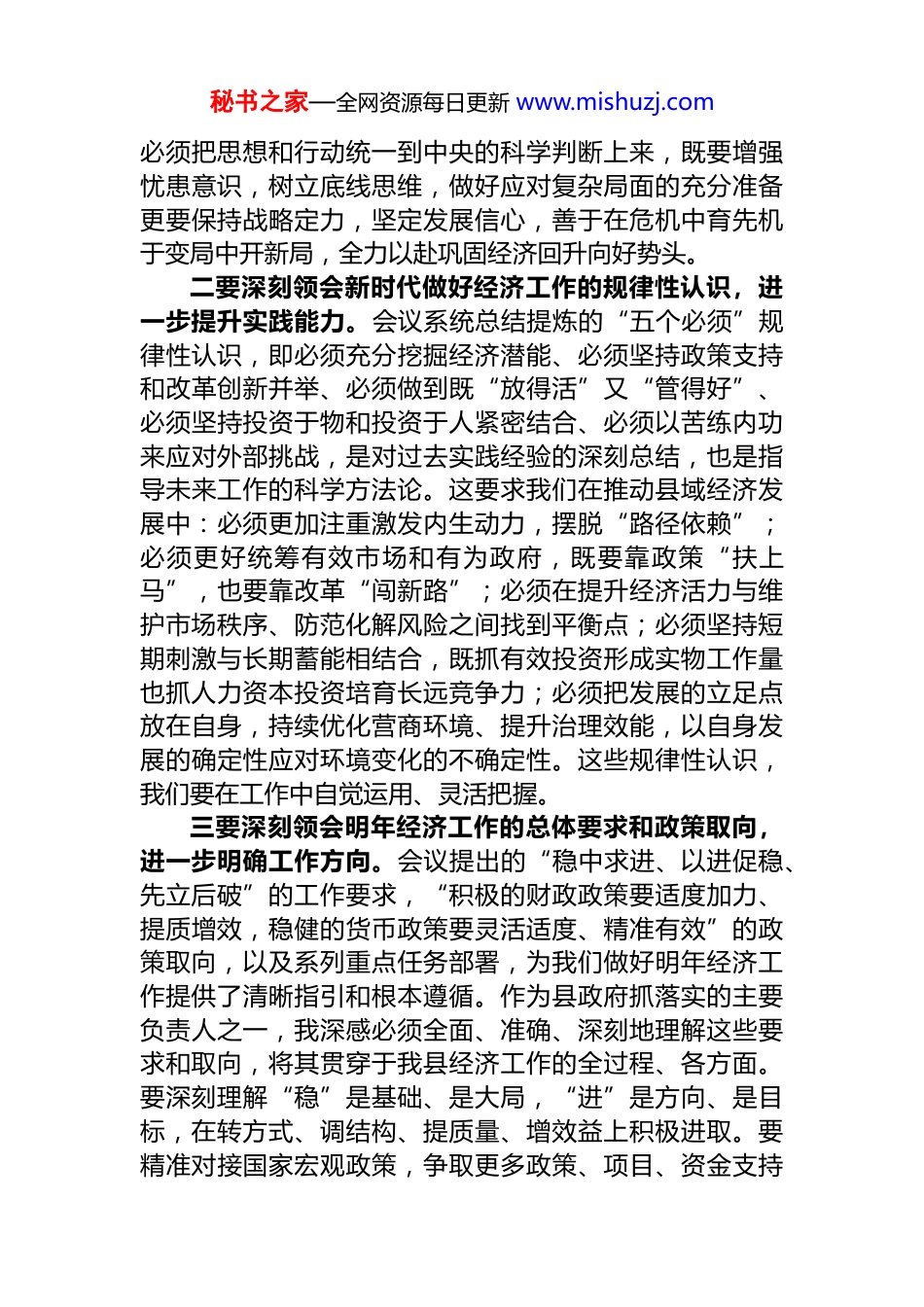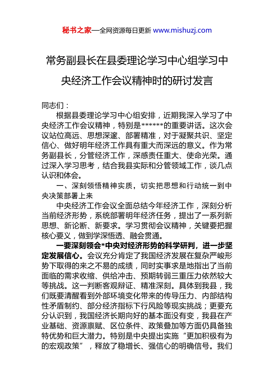 秘书之家—全网资源每日更新 www.mishuzj.com常务副县长在县委理论学习中心组学习中央经济工作会议精神时的研讨发言同志们:根据县委理论学习中心组安排,近期我深入学习了中央经济工作会议精神,特别是******的重要讲话。这次会议站位高远、思想深邃、部署精准,对于凝聚共识、坚定信心、做好明年经济工作具有重大而深远的意义。作为常务副县长,分管经济工作,深感责任重大、使命光荣。通过深入学习思考,结合我县实际和分管领域工作,谈几点认识和体会。一、深刻领悟精神实质,切实把思想和行动统一到中央决策部署上来中央经济工作会议全面总结今年经济工作,深刻分析当前经济形势,系统部署明年经济任务,提出了一系列新思想、新论断、新要求。学习贯彻会议精神,关键要把握核心要义,做到学深悟透、融会贯通。一要深刻领会*中央对经济形势的科学研判,进一步坚定发展信心。会议充分肯定了我国经济发展在复杂严峻形势下取得的来之不易的成绩,同时实事求是地指出了当前面临的需求收缩、供给冲击、预期转弱三重压力依然较大等挑战。这一判断客观辩证、精准深刻。具体到我县,我们既要清醒看到外部环境变化带来的传导压力、内部结构性矛盾制约、部分经济指标下行风险等现实挑战;更要充分认识到,我国经济长期向好的基本面没有变,我县在产业基础、资源禀赋、区位条件、政策叠加等方面仍具备独特优势和巨大潜力。特别是中央提出实施“更加积极有为的宏观政策”,释放了稳增长、强信心的明确信号。我们秘书之家—全网资源每日更新 www.mishuzj.com必须把思想和行动统一到中央的科学判断上来,既要增强忧患意识,树立底线思维,做好应对复杂局面的充分准备更要保持战略定力,坚定发展信心,善于在危机中育先机于变局中开新局,全力以赴巩固经济回升向好势头。二要深刻领会新时代做好经济工作的规律性认识,进一步提升实践能力。会议系统总结提炼的“五个必须”规律性认识,即必须充分挖掘经济潜能、必须坚持政策支持和改革创新并举、必须做到既“放得活”又“管得好”、必须坚持投资于物和投资于人紧密结合、必须以苦练内功来应对外部挑战,是对过去实践经验的深刻总结,也是指导未来工作的科学方法论。这要求我们在推动县域经济发展中:必须更加注重激发内生动力,摆脱“路径依赖”;必须更好统筹有效市场和有为政府,既要靠政策“扶上马”,也要靠改革“闯新路”;必须在提升经济活力与维护市场秩序、防范化解风险之间找到平衡点;必须坚持短期刺激与长期蓄能相结合,既抓有效投资形成实物工作量也抓人力资本投资培育长远竞争力;必须把发展的立足点放在自身,持续优化营商环境、提升治理效能,以自身发展的确定性应对环境变化的不确定性。这些规律性认识,我们要在工作中自觉运用、灵活把握。三要深刻领会明年经济工作的总体要求和政策取向,进一步明确工作方向。会议提出的“稳中求进、以进促稳、先立后破”的工作要求,“积极的财政政策要适度加力、提质增效,稳健的货币政策要灵活适度、精准有效”的政策取向,以及系列重点任务部署,为我们做好明年经济工作提供了清晰指引和根本遵循。作为县政府抓落实的主要负责人之一,我深感必须全面、准确、深刻地理解这些要求和取向,将其贯穿于我县经济工作的全过程、各方面。要深刻理解“稳”是基础、是大局,“进”是方向、是目标,在转方式、调结构、提质量、增效益上积极进取。要精准对接国家宏观政策,争取更多政策、项目、资金支持秘书之家—全网资源每日更新 www.mishuzj.com同时结合我县实际,创造性地落实好各项任务,确保中央决策部署在我县不折不扣落地生根、开花结果。二、紧密结合分管工作,全力推动中央决策部署在县域落地见效学习贯彻中央经济工作会议精神,关键在落实。我将立足常务副县长职责分工,聚焦分管领域,找准结合点和发力点,以钉钉子精神推动各项任务落到实处。(一)聚焦政策落地见效,着力稳定宏观经济大盘。中央强调要“实施更加积极有为的宏观政策”。我将牵头组织相关部门:一是加强政策研究对接。密切跟踪国家财政、货币、产业、区域等政策动向,特别是围绕扩大内需科技创新、乡村振兴、绿色发展...