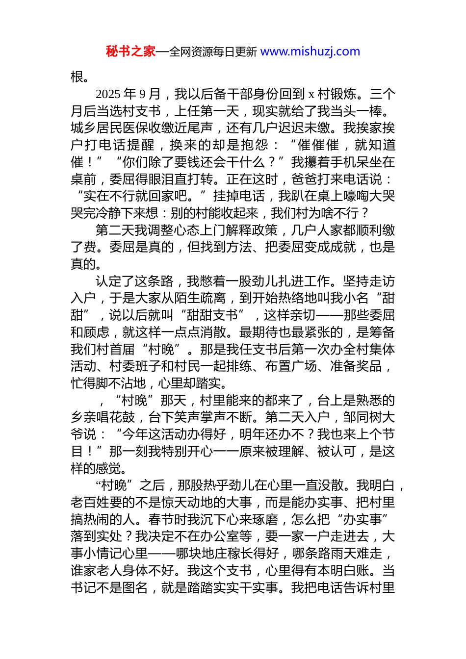 秘书之家—全网资源每日更新 www.mishuzj.com村*支部书记、村委会主任在 2026 年 xx 县各界妇女代表座谈会上的发言各位领导,同志们:大家好!我是 xx 镇 xx 村*支部书记、村委会主任 xx.非常荣幸参加今天的座谈会,让我有机会向各位优秀的姐妹学习交流,并和大家一起共同纪念“三八”国际妇女节这一专属于我们的节日。20xx 年 , 我 考 入 新 疆 大 学 俄 语 专 业 , 圆 了 自 己“211”“双一流”大学梦。我性格外向、开朗不服输,在校期间加入学生会,从干事做到主席,在服务同学中体会到奉献的价值。在新疆,维护稳定、促进民族团结是头等大事,关键时刻冲在最前的总是*员师生。“全心全意为人民服务”的宗旨,与我做学生工作的体会产生了深刻共鸣。从那个时候,我渴望像身边的优秀*员一样,拥有更高的思想觉悟,去承担更重的责任。因此,我郑重向*组织递交了入*申请书,并在大三光荣地加入了中国共产*。学俄语时,我曾幻想当外交官、驻外大使,至少也是合资企业高管,想成为专业领域的优秀女性。可毕业那年回家,看见独居的奶奶在院子里劈柴,她直起腰说:“跟前年轻人都走了,能帮把手的人都没有。”我站在那儿,一句话也说不出。那一刻我想:要不回来陪陪奶奶吧。遗憾的是,奶奶在我毕业第一年就走了。之后我时常回村,看到的多是老人带孙辈,年轻点的也就是在家带孩子的妈妈,大家靠种地为生,老人们很难接受新事物。我常想:如果考出去的年轻人都不回来,我们村什么时候能变好?毕业返乡的种子,就在那时扎下了秘书之家—全网资源每日更新 www.mishuzj.com根。2025 年 9 月,我以后备干部身份回到 x 村锻炼。三个月后当选村支书,上任第一天,现实就给了我当头一棒。城乡居民医保收缴近尾声,还有几户迟迟未缴。我挨家挨户打电话提醒,换来的却是抱怨:“催催催,就知道催!”“你们除了要钱还会干什么?”我攥着手机呆坐在桌前,委屈得眼泪直打转。正在这时,爸爸打来电话说:“实在不行就回家吧。”挂掉电话,我趴在桌上嚎啕大哭哭完冷静下来想:别的村能收起来,我们村为啥不行?第二天我调整心态上门解释政策,几户人家都顺利缴了费。委屈是真的,但找到方法、把委屈变成成就,也是真的。认定了这条路,我憋着一股劲儿扎进工作。坚持走访入户,于是大家从陌生疏离,到开始热络地叫我小名“甜甜”,说以后就叫“甜甜支书”,这样亲切——那些委屈和顾虑,就这样一点点消散。最期待也最紧张的,是筹备我们村首届“村晚”。那是我任支书后第一次办全村集体活动、村委班子和村民一起排练、布置广场、准备奖品,忙得脚不沾地,心里却踏实。,“村晚”那天,村里能来的都来了,台上是熟悉的乡亲唱花鼓,台下笑声掌声不断。第二天入户,邹同树大爷说:“今年这活动办得好,明年还办不?我也来上个节目!”那一刻我特别开心一一原来被理解、被认可,是这样的感觉。“村晚”之后,那股热乎劲儿在心里一直没散。我明白,老百姓要的不是惊天动地的大事,而是能办实事、把村里搞热闹的人。春节时我沉下心来琢磨,怎么把“办实事”落到实处?我决定不在办公室等,要一家一户走进去,大事小情记心里——哪块地庄稼长得好,哪条路雨天难走,谁家老人身体不好。我这个支书,心里得有本明白账。当书记不是图名,就是踏踏实实干实事。我把电话告诉村里秘书之家—全网资源每日更新 www.mishuzj.com每个人,24 小时不关机,大事小情一个电话我就到。xx 村要发展,得听老百姓怎么说。不管是庭院经济、果蔬基地,还是改善人居环境,都得学习好方法、迈出那一步。我的目标很简单:让留守妇女能“守着家、带着娃挣着钱”,让家家户户日子更有奔头。工作还要讲究方法最重要的是公平一村里大小事一碗水端平,不优亲厚友,不搞暗箱操作,该商量的事一件不含糊。我绝不当“一言堂”书记,凡是村里大事,都跟老百姓商量着办。“还有学政策这件事,好政策如果自己都吃不透,跟老百姓讲不明白,到了村里就成了墙上文件。我得带着大家先学一步,把“书面话”变成“家常话”,让政策从纸上走出来,变成大家看得见摸得着的实惠。最后,恳请各位领导和姐妹们一如既往...