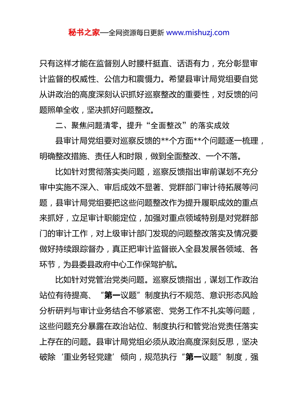 秘书之家—全网资源每日更新 www.mishuzj.com副县长在县委巡察组巡察县审计局党组情况反馈会上的讲话提纲 同志们:刚才,县委巡察组组长通报了巡察发现的问题,指出的问题一针见血、精准深刻;县委巡察办主任对如何抓好巡察整改工作提出了明确、具体的要求;县审计局党组书记也作了很好的表态发言。希望县审计局党组要高度重视、端正态度,全力抓好问题整改。为确保巡察整改工作落地见效,借此机会,我再强调三点意见。一、深化思想认识,增强“坚决整改”的政治自觉巡察整改工作是一项严肃的政治工作,是全面从严治党的重要抓手(习近平总书记高度重视,每一轮中央巡视都亲自听取巡视情况汇报,并就巡视整改作出重要指示。他强调,如果巡视不整改,巡视就没有作用,而且会有负作用,巡视制度就会成为“样子货”“稻草人”)。审计部门作为党和国家监督体系的重要组成部分,肩负着管财、管物、管权的重大监督职责。正所谓“执纪者必先守纪,监督者更要带头接受监督”,这要求审计机关必须坚持更高标准、更严要求,在政治建设、业务规范、廉洁自律上作表率,真正做到“打铁必须自身硬”,秘书之家—全网资源每日更新 www.mishuzj.com只有这样才能在监督别人时腰杆挺直、话语有力,充分彰显审计监督的权威性、公信力和震慑力。希望县审计局党组要自觉从讲政治的高度深刻认识抓好巡察整改的重要性,对反馈的问题照单全收,坚决抓好问题整改。二、聚焦问题清零,提升“全面整改”的落实成效县审计局党组要对巡察反馈的**个方面**个问题逐一梳理,明确整改措施、责任人和时限,做到全面整改、一个不落。比如针对贯彻落实类问题,巡察反馈指出审前谋划不充分审中实施不深入、审后成效不显著、党群部门审计待拓展等问题,县审计局党组要把这些问题整改作为提升履职成效的重点来抓好,立足审计职能定位,加强对重点领域特别是对党群部门的审计工作,对上级审计部门发现的问题整改落实及情况要做好持续跟踪督办,真正把审计监督嵌入全县发展各领域、各环节,为县委县政府中心工作保驾护航。比如针对党管治党类问题。巡察反馈指出,谋划工作政治站位有待提高、“第一议题”制度执行不规范、意识形态风险分析研判与审计业务结合不够紧密、党务工作不扎实等问题,这些问题充分暴露在政治站位、制度执行和管党治党责任落实上存在的问题。县审计局党组必须从政治高度深刻反思,坚决破除‘重业务轻党建’倾向,规范执行“第一议题”制度,强秘书之家—全网资源每日更新 www.mishuzj.com化意识形态风险研判与审计业务深度融合,扎实做好党务基础工作;要压紧压实“一岗双责”,推动党建与业务同频共振,确保全面从严治党责任落地落实。比如针对作风建设类问题。巡察反馈指出了业务规范执行不到位、资金管理不规范、固定资产登记不完整、资产核销不及时、联系群众不紧密等问题,这些不仅影响审计公信力,更存在廉政风险与履职失责隐患。县审计局党组要加强业务全流程管控,坚决纠正文书不规范等问题,确保每项审计经得起检验;要严格落实“三重一大”制度,加强固定资产管理,加快省级专项经费执行进度。同时要主动下沉基层,增加挂钩村调研频次,丰富活动载体,以严实作风和规范管理塑造审计机关良好形象。比如针对队伍建设类问题。巡察指出缺乏复合性审计人才审计队伍骨干断层、干部中层岗位资源待优化等问题。队伍建设短板影响审计工作的质量与效率,制约审计事业的高质量发展。县审计局党组要加快培养复合型审计骨干,通过专题培训、“以老带新”等方式补齐能力短板;同时要与组织部、编办等部门对接沟通,优化中层岗位资源配置,打通非领导岗位公务员与事业干部的晋升通道,大胆使用年轻干部和事业骨干,激发队伍干事创业的内生动力,为审计高质量发展提供坚实人才秘书之家—全网资源每日更新 www.mishuzj.com保障。三、强化部门联动,凝聚“联动整改”的工作合力县审计局要主动对接县委巡察办、纪委监委、组织部等相关单位,定期汇报整改进度、及时反馈整改难点,积极争取指导支持,以高效协同破解整改堵点,推动重点整改任务落地落细、见实见效。县审计局要严格遵照巡察整改时限要求,有...