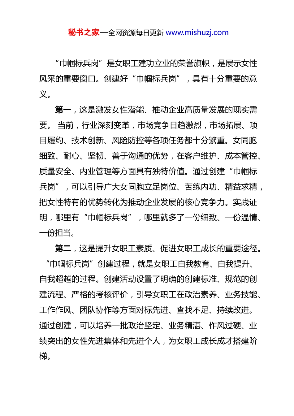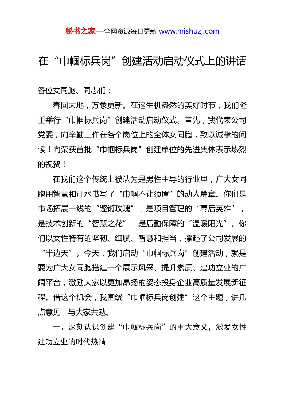 秘书之家—全网资源每日更新 www.mishuzj.com在“巾帼标兵岗”创建活动启动仪式上的讲话 各位女同胞、同志们:春回大地,万象更新。在这生机盎然的美好时节,我们隆重举行“巾帼标兵岗”创建活动启动仪式。首先,我代表公司党委,向辛勤工作在各个岗位上的全体女同胞,致以诚挚的问候!向荣获首批“巾帼标兵岗”创建单位的先进集体表示热烈的祝贺!在我们这个传统上被认为是男性主导的行业里,广大女同胞用智慧和汗水书写了“巾帼不让须眉”的动人篇章。你们是市场拓展一线的“铿锵玫瑰”,是项目管理的“幕后英雄”,是技术创新的“智慧之花”,是后勤保障的“温暖阳光”。你们以女性特有的坚韧、细腻、智慧和担当,撑起了公司发展的“半边天”。今天,我们启动“巾帼标兵岗”创建活动,就是要为广大女同胞搭建一个展示风采、提升素质、建功立业的广阔平台,激励大家以更加昂扬的姿态投身企业高质量发展新征程。借这个机会,我围绕“巾帼标兵岗创建”这个主题,讲几点意见,与大家共勉。一、深刻认识创建“巾帼标兵岗”的重大意义,激发女性建功立业的时代热情秘书之家—全网资源每日更新 www.mishuzj.com“巾帼标兵岗”是女职工建功立业的荣誉旗帜,是展示女性风采的重要窗口。创建好“巾帼标兵岗”,具有十分重要的意义。第一,这是激发女性潜能、推动企业高质量发展的现实需要。 当前,行业深刻变革,市场竞争日趋激烈,市场拓展、项目履约、技术创新、风险防控等各项任务都十分繁重。女同胞细致、耐心、坚韧、善于沟通的优势,在客户维护、成本管控、质量安全、内业管理等方面具有独特价值。通过创建“巾帼标兵岗”,可以引导广大女同胞立足岗位、苦练内功、精益求精,把女性特有的优势转化为推动企业发展的核心竞争力。实践证明,哪里有“巾帼标兵岗”,哪里就多了一份细致、一份温情、一份担当。第二,这是提升女职工素质、促进女职工成长的重要途径。 “巾帼标兵岗”创建过程,就是女职工自我教育、自我提升、自我超越的过程。创建活动设置了明确的创建标准、规范的创建流程、严格的考核评价,引导女职工在政治素养、业务技能、工作作风、团队协作等方面对标先进、查找不足、持续改进。通过创建,可以培养一批政治坚定、业务精湛、作风过硬、业绩突出的女性先进集体和先进个人,为女职工成长成才搭建阶梯。秘书之家—全网资源每日更新 www.mishuzj.com第三,这是弘扬企业精神、展示企业形象的重要窗口。 “巾帼标兵岗”是一面旗帜,代表着责任、奉献、卓越。一个优秀的“巾帼标兵岗”,不仅是企业内部的标杆,更是对外展示企业形象的名片。业主在选择合作伙伴时,不仅看技术实力,也看企业文化;不仅看男性员工,也看女性员工的素质和风采。创建“巾帼标兵岗”,就是要讲好女性奋斗故事,传播企业正能量,提升企业美誉度。二、准确把握“巾帼标兵岗”的内涵要求,树立新时代女性岗位建功的标杆“巾帼标兵岗”不是一块简单的牌子,而是有着丰富内涵和明确要求的荣誉。要重点把握“五个过硬”的创建标准。第一,政治素质过硬。 要带头学习贯彻习近平新时代中国特色社会主义思想,深刻领悟“两个确立”的决定性意义,增强“四个意识”、坚定“四个自信”、做到“两个维护”。要自觉把个人理想融入企业发展,把岗位职责扛在肩上。在重大原则问题上头脑清醒、立场坚定,在急难险重任务面前豁得出来、顶得上去。第二,业务技能过硬。 要干一行、爱一行、钻一行、精一行。市场拓展岗位的女职工要精通市场分析、投标报价、合同谈判;项目岗位的女职工要精通施工工艺、质量控制、成本核秘书之家—全网资源每日更新 www.mishuzj.com算;技术岗位的女职工要掌握前沿技术、攻关能力突出;财务岗位的女职工要业务精湛、严谨细致;党群岗位的女职工要政策熟悉、善于沟通。要通过岗位练兵、技术比武、导师带徒等途径,不断提升专业素养。第三,工作业绩过硬。 “巾帼标兵岗”必须是业绩突出的先进典型。在市场拓展中,要能拿下大项目、好项目;在项目履约中,要能打造精品工程、标杆项目;在技术创新中,要能取得专利、工法等成果;在降本增效中,要能提出合理化建议并被采纳;...