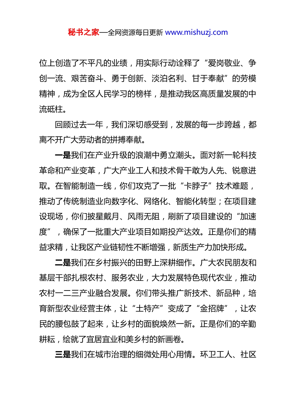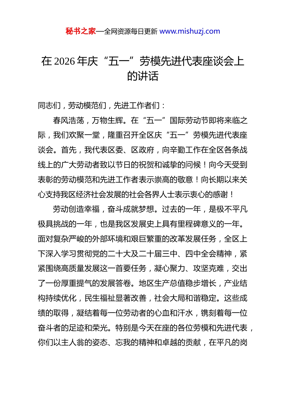 秘书之家—全网资源每日更新 www.mishuzj.com在 2026 年庆“五一”劳模先进代表座谈会上的讲话 同志们,劳动模范们,先进工作者们:春风浩荡,万物生辉。在“五一”国际劳动节即将来临之际,我们欢聚一堂,隆重召开全区庆“五一”劳模先进代表座谈会。首先,我代表区委、区政府,向辛勤工作在全区各条战线上的广大劳动者致以节日的祝贺和诚挚的问候!向今天受到表彰的劳动模范和先进工作者表示崇高的敬意!向长期以来关心支持我区经济社会发展的社会各界人士表示衷心的感谢!劳动创造幸福,奋斗成就梦想。过去的一年,是极不平凡极具挑战的一年,也是我区发展史上具有里程碑意义的一年。面对复杂严峻的外部环境和艰巨繁重的改革发展任务,全区上下深入学习贯彻党的二十大及二十届三中、四中全会精神,紧紧围绕高质量发展这一首要任务,凝心聚力、攻坚克难,交出了一份厚重提气的发展答卷。地区生产总值稳步增长,产业结构持续优化,民生福祉显著改善,社会大局和谐稳定。这些成绩的取得,凝结着每一位劳动者的心血和汗水,镌刻着每一位奋斗者的足迹和荣光。特别是今天在座的各位劳模和先进代表,你们以主人翁的姿态、忘我的精神和卓越的贡献,在平凡的岗秘书之家—全网资源每日更新 www.mishuzj.com位上创造了不平凡的业绩,用实际行动诠释了“爱岗敬业、争创一流、艰苦奋斗、勇于创新、淡泊名利、甘于奉献”的劳模精神,成为全区人民学习的榜样,是推动我区高质量发展的中流砥柱。回顾过去一年,我们深切感受到,发展的每一步跨越,都离不开广大劳动者的拼搏奉献。一是我们在产业升级的浪潮中勇立潮头。面对新一轮科技革命和产业变革,广大产业工人和技术骨干敢为人先、锐意进取。在智能制造一线,你们攻克了一批“卡脖子”技术难题,推动了传统制造业向数字化、网络化、智能化转型;在项目建设现场,你们披星戴月、风雨无阻,刷新了项目建设的“加速度”,确保了一批重大产业项目如期投产达效。正是你们的精益求精,让我区产业链韧性不断增强,新质生产力加快形成。二是我们在乡村振兴的田野上深耕细作。广大农民朋友和基层干部扎根农村、服务农业,大力发展特色现代农业,推动农村一二三产业融合发展。你们带头推广新技术、新品种,培育新型农业经营主体,让“土特产”变成了“金招牌”,让农民的腰包鼓了起来,让乡村的面貌焕然一新。正是你们的辛勤耕耘,绘就了宜居宜业和美乡村的新画卷。三是我们在城市治理的细微处用心用情。环卫工人、社区秘书之家—全网资源每日更新 www.mishuzj.com工作者、快递小哥、医护人员等各行各业的劳动者,默默坚守在城市运行的每一个环节。无论是烈日酷暑还是严寒冰雪,无论是清晨第一缕阳光还是深夜最后一盏路灯,都有你们忙碌的身影。你们用辛勤的汗水擦亮了城市的底色,用温暖的服务守护了万家灯火,让这座城市更有温度、更具活力。四是我们在科技创新的高地上攀登不止。科研人员、工程师们潜心钻研、勇攀高峰,在关键核心技术攻关上取得了新突破。你们耐得住寂寞、坐得住冷板凳,以“十年磨一剑”的定力,推动了一批科研成果从实验室走向生产线,转化为现实生产力。正是你们的智慧火花,点燃了我区创新驱动发展的强大引擎。同志们,劳模精神是时代的旗帜,劳动光荣是永恒的主题当前,我区正处于爬坡过坎、滚石上山的关键时期,既面临难得的历史机遇,也面临严峻的风险挑战。这就要求我们必须进一步弘扬劳模精神、劳动精神、工匠精神,充分调动全区广大劳动者的积极性、主动性、创造性,汇聚起万众一心、众志成城的磅礴力量。借此机会,我提三点希望,与大家共勉:第一,要坚定信念,做政治过硬的“排头兵”。理想信念是精神之钙,是奋斗之源。广大劳模和先进工作者要始终坚持秘书之家—全网资源每日更新 www.mishuzj.com正确的政治方向,深刻领悟“两个确立”的决定性意义,增强“四个意识”、坚定“四个自信”、做到“两个维护”。要把个人理想融入国家和民族的事业中,融入全区发展的大局中,听党话、跟党走,始终与区委、区政府同心同德、同向同行。要带头学习贯彻党的创新理论,特别是关于工人阶级和工会工作的重要论述,不断提...
