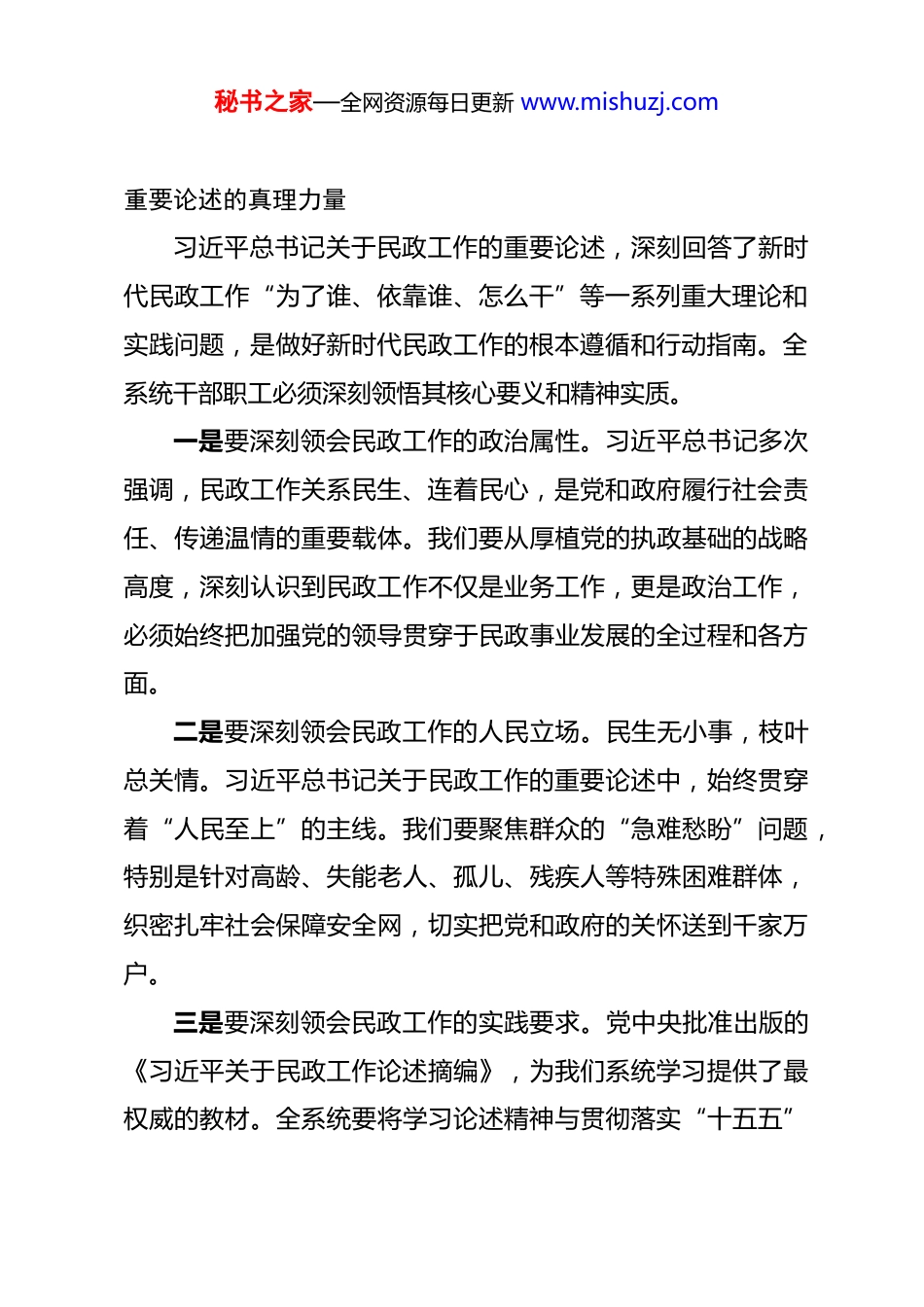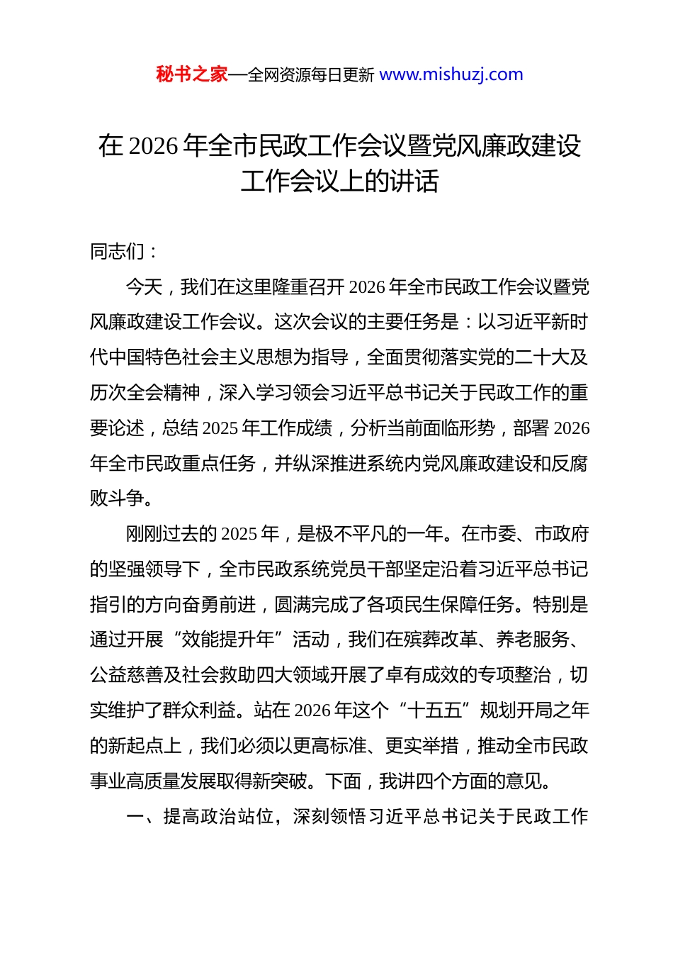 秘书之家—全网资源每日更新 www.mishuzj.com在 2026 年全市民政工作会议暨党风廉政建设工作会议上的讲话 同志们:今天,我们在这里隆重召开 2026 年全市民政工作会议暨党风廉政建设工作会议。这次会议的主要任务是:以习近平新时代中国特色社会主义思想为指导,全面贯彻落实党的二十大及历次全会精神,深入学习领会习近平总书记关于民政工作的重要论述,总结 2025 年工作成绩,分析当前面临形势,部署 2026年全市民政重点任务,并纵深推进系统内党风廉政建设和反腐败斗争。刚刚过去的 2025 年,是极不平凡的一年。在市委、市政府的坚强领导下,全市民政系统党员干部坚定沿着习近平总书记指引的方向奋勇前进,圆满完成了各项民生保障任务。特别是通过开展“效能提升年”活动,我们在殡葬改革、养老服务、公益慈善及社会救助四大领域开展了卓有成效的专项整治,切实维护了群众利益。站在 2026 年这个“十五五”规划开局之年的新起点上,我们必须以更高标准、更实举措,推动全市民政事业高质量发展取得新突破。下面,我讲四个方面的意见。一、提高政治站位,深刻领悟习近平总书记关于民政工作秘书之家—全网资源每日更新 www.mishuzj.com重要论述的真理力量习近平总书记关于民政工作的重要论述,深刻回答了新时代民政工作“为了谁、依靠谁、怎么干”等一系列重大理论和实践问题,是做好新时代民政工作的根本遵循和行动指南。全系统干部职工必须深刻领悟其核心要义和精神实质。一是要深刻领会民政工作的政治属性。习近平总书记多次强调,民政工作关系民生、连着民心,是党和政府履行社会责任、传递温情的重要载体。我们要从厚植党的执政基础的战略高度,深刻认识到民政工作不仅是业务工作,更是政治工作,必须始终把加强党的领导贯穿于民政事业发展的全过程和各方面。二是要深刻领会民政工作的人民立场。民生无小事,枝叶总关情。习近平总书记关于民政工作的重要论述中,始终贯穿着“人民至上”的主线。我们要聚焦群众的“急难愁盼”问题,特别是针对高龄、失能老人、孤儿、残疾人等特殊困难群体,织密扎牢社会保障安全网,切实把党和政府的关怀送到千家万户。三是要深刻领会民政工作的实践要求。党中央批准出版的《习近平关于民政工作论述摘编》,为我们系统学习提供了最权威的教材。全系统要将学习论述精神与贯彻落实“十五五”秘书之家—全网资源每日更新 www.mishuzj.com规划相结合,将学习成果转化为解决问题的具体思路和改进工作的实际举措,确保民政事业始终沿着正确的政治方向勇往直前。二、坚持标本兼治,纵深推进党风廉政建设及反腐败专项整治工作民政资金是“救命钱”、“辛苦钱”,民政领域廉洁风险防控直接关系到党和政府的形象。2026 年,我们要以“政治领航”为统领,持续深化党风廉政建设和反腐败工作,不断推进清廉民政建设走深走实。一要压实全面从严治党主体责任。局党组要切实履行“第一责任人”职责,班子成员要认真履行“一岗双责”。我们要持续完善制度体系,聚焦权力运行的重点领域和关键环节,构建精准防控体系,确保权力在阳光下运行。通过定期召开全面从严治党暨党风廉政建设工作会议,分析形势,部署任务,形成一级抓一级、层层抓落实的工作格局。二要纵深开展重点领域专项整治。2026 年,全系统要聚焦关键领域和薄弱环节,以重点突破带动全局提升。我们要持续深化殡葬、养老服务、公益慈善及社会救助等四大领域的集中整治,严厉查处虚报冒领、挤占挪用、截留私分民政资金等违纪违法行为。要通过建立问题清单、任务清单、责任清单,实秘书之家—全网资源每日更新 www.mishuzj.com现专项整治工作的闭环管理,切实解决群众身边的腐败问题和不正之风。三要一体推进“不敢腐、不能腐、不想腐”。我们要严查违纪违法问题,强化不敢腐的震慑;完善资金监管和审批流程,强化不能腐的约束;加强清廉文化建设和警示教育,强化不想腐的自觉。2026 年,我们将探索智慧廉政建设,利用信息化手段对民政资金流向进行实时监控,通过技术赋能提升廉政风险防控的精准度。三、聚焦高质量发展,确保 2026 年全市民政重点任务目标高标完成2026 年是“十...